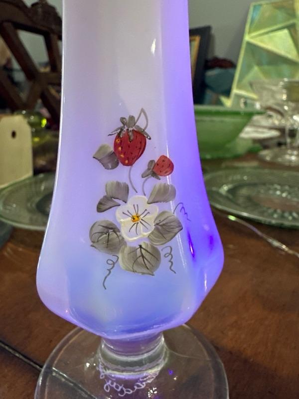 Original hand painted Fenton vase signed by Lisa W strawberry on white glass vase