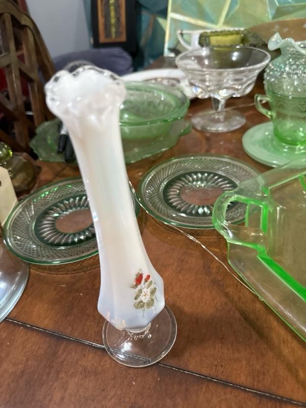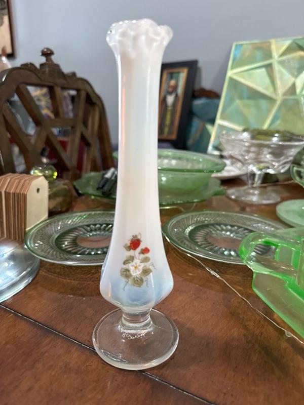 This Fenton midcentury vintage hand painted white vase has a beautiful scalloped top and is designed to be a bud vase. It stands just shy of 8 inches tall and is signed on the bottom hand painted by Lisa W. There is a strawberry motif painted on front with a white flower, detail in photos.