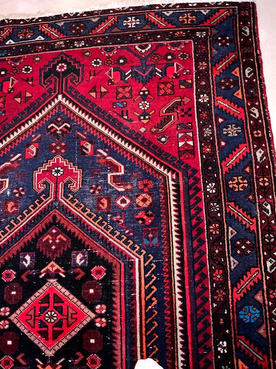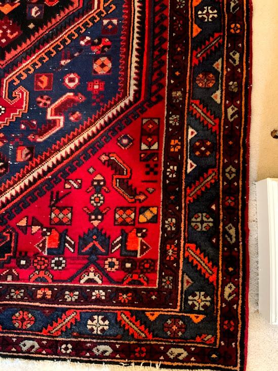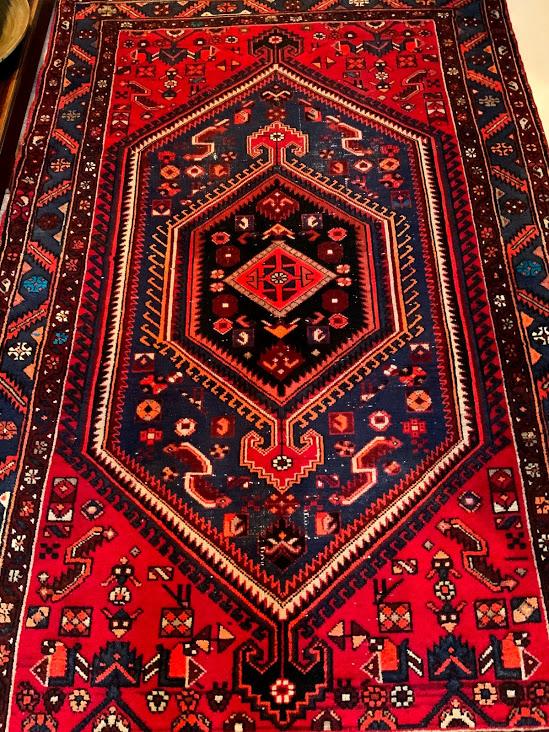 Central medallion design intersperse with vibrates reds, oranges interspersed with some blue .