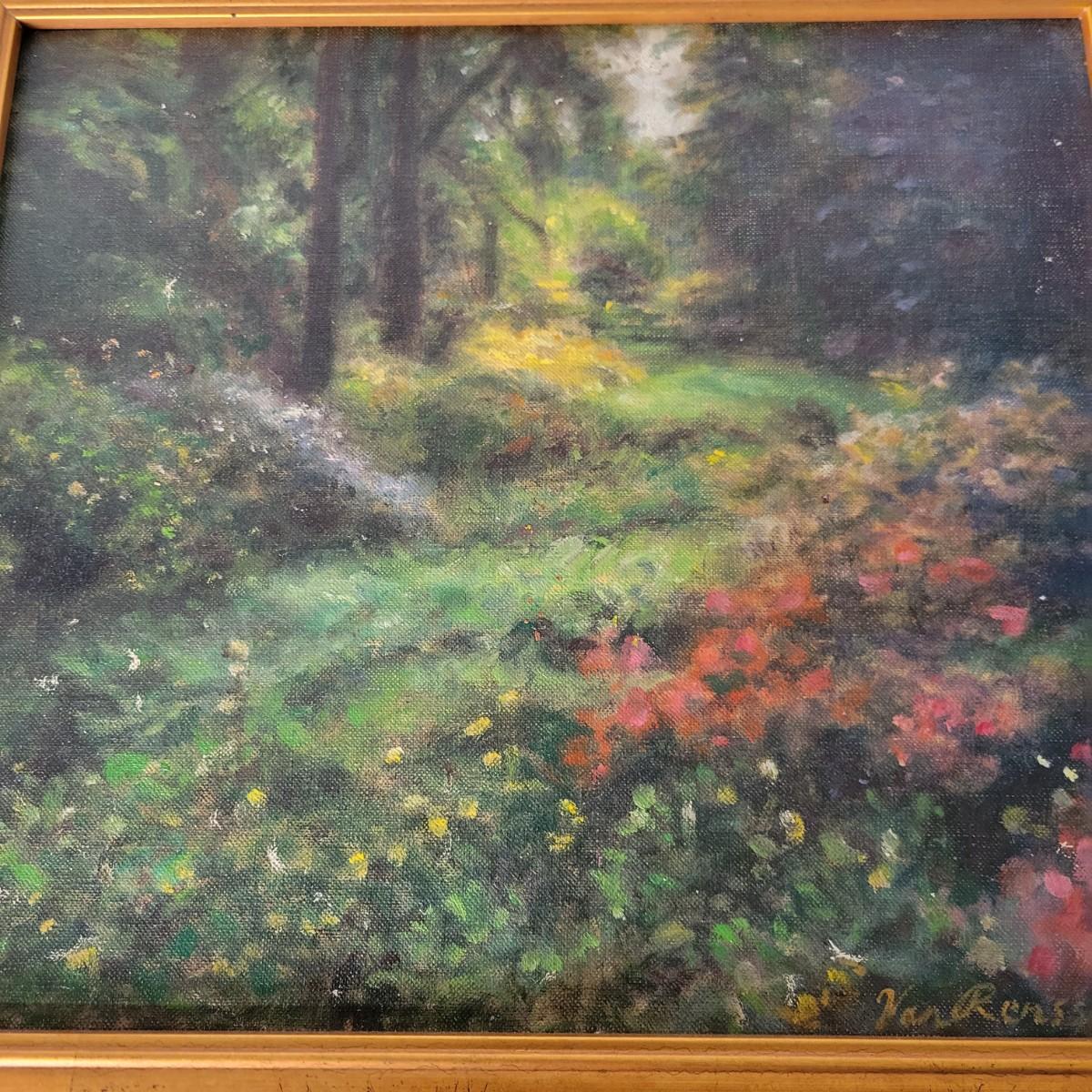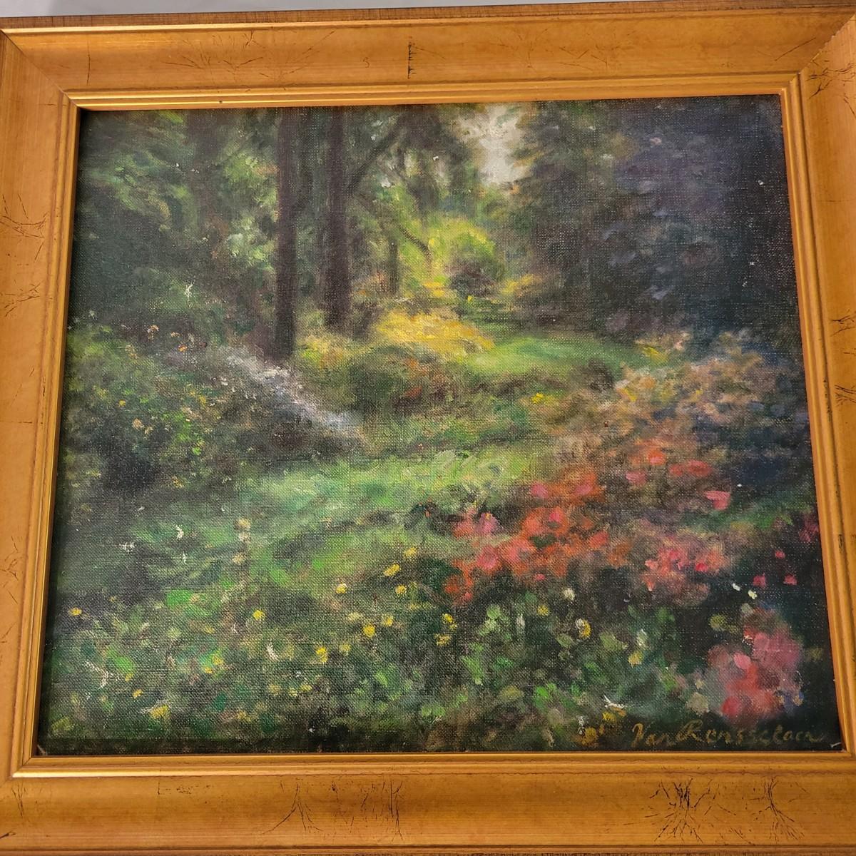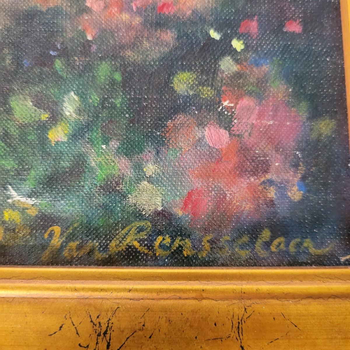 An original oil painting by Van Rensselaer in excellent condition. This is an oil painting on canvas on a board in a wooden gold leaf frame. Painted in what appears to be French impressionism plein air style. Measures approximately 16" x 14.5" x 1". Shipping available. Shipping Art can be costly please call UPS store at 828-252-6930 for quote