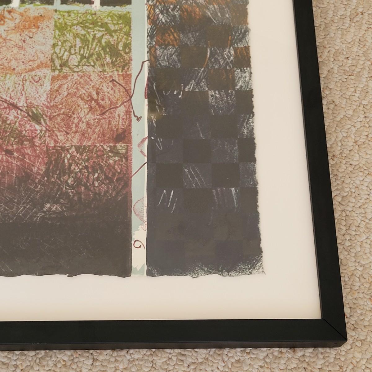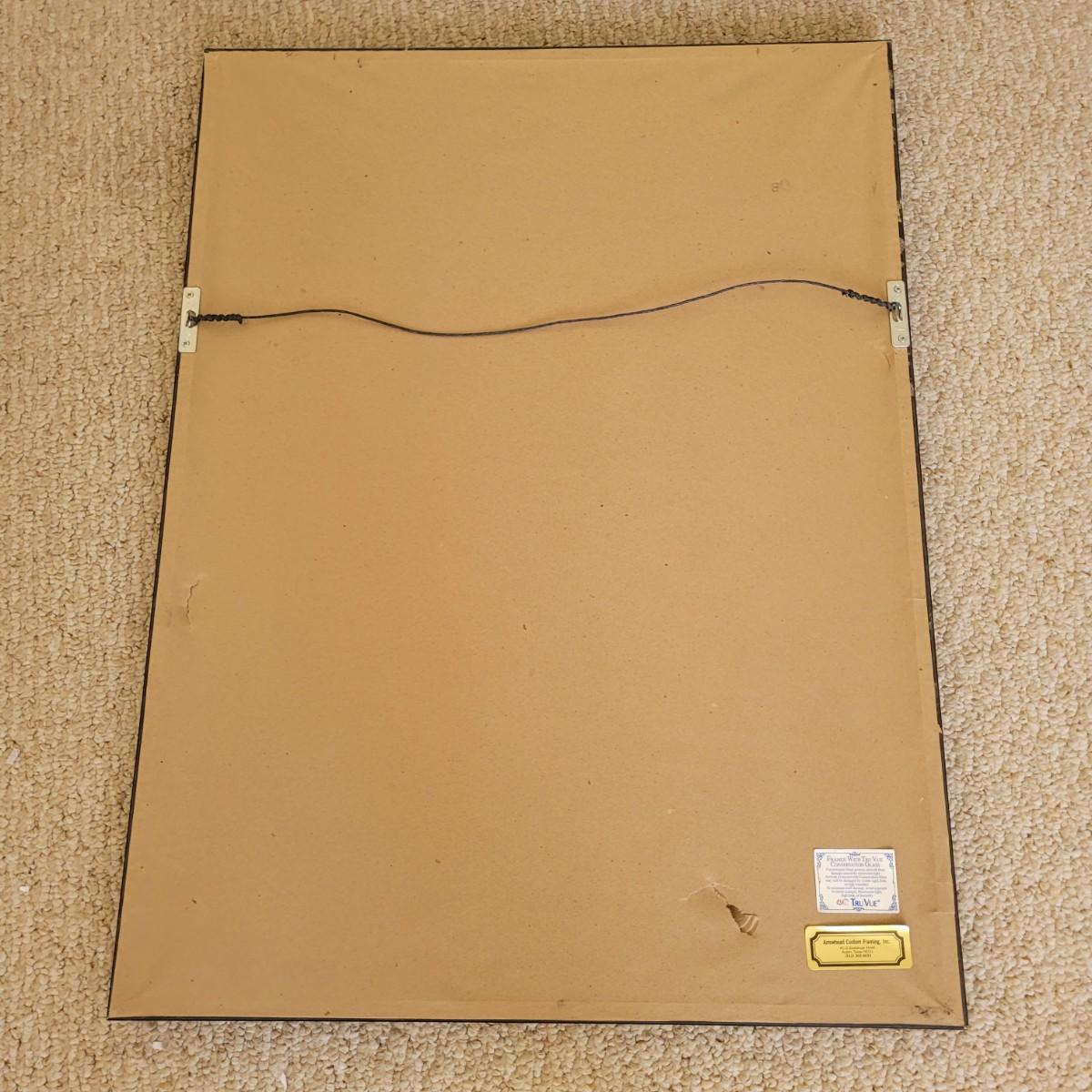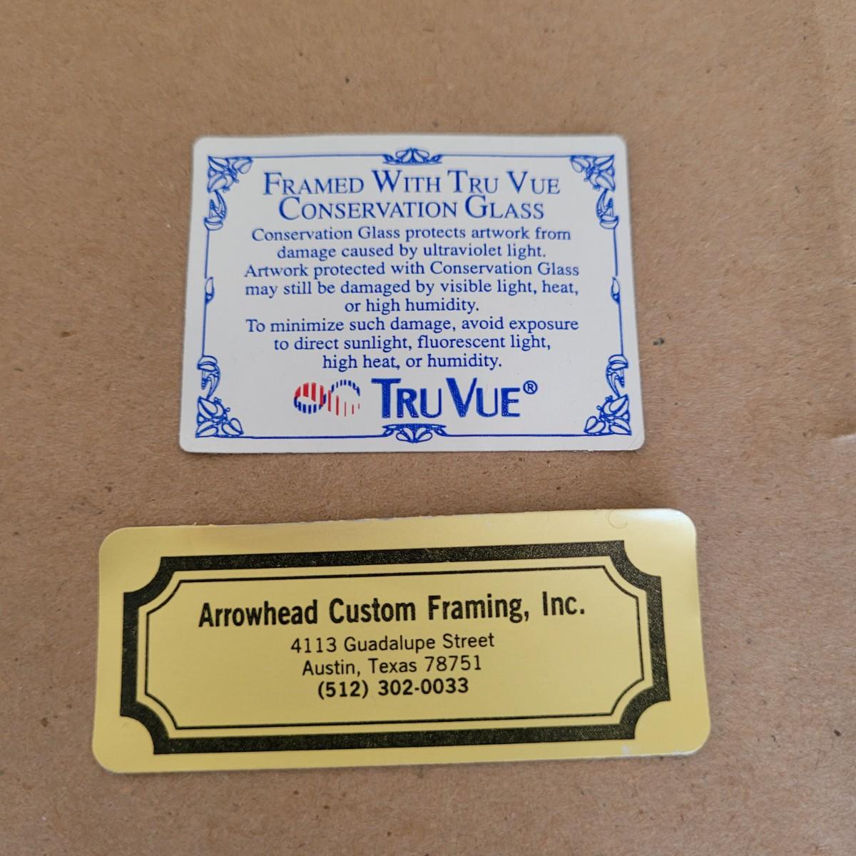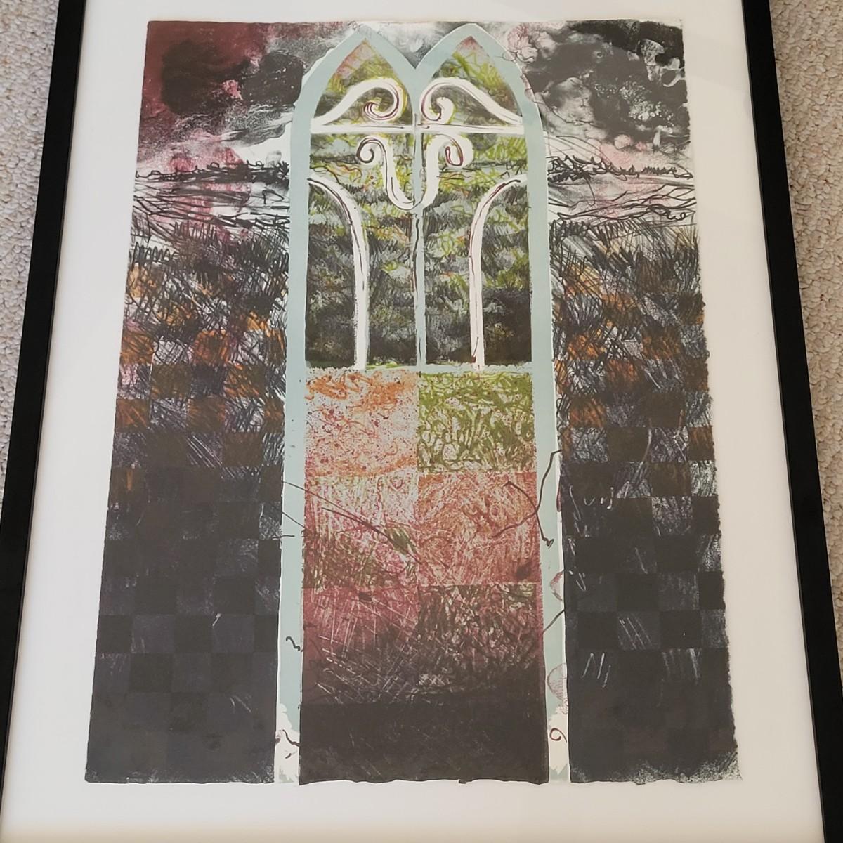 Piece appears to original unsigned art. It depicts an iron gate overlooking a garden or meadow. It appears to be mixed media in the form of paint, pencil, and watercolor. There are no names, dates, or markings to be found anywhere on the image. It is under glass and framed in wood. The only information given is the location where it was framed.