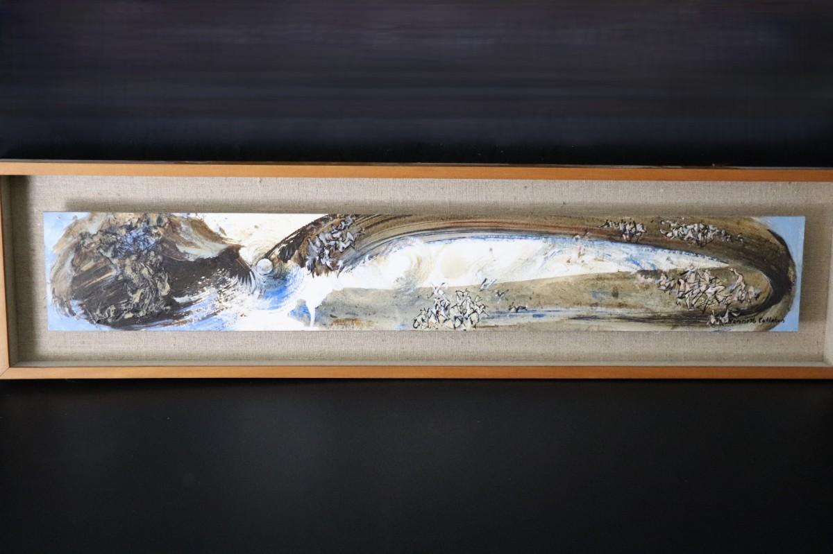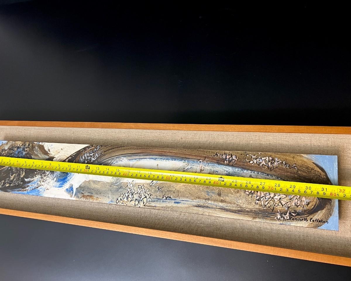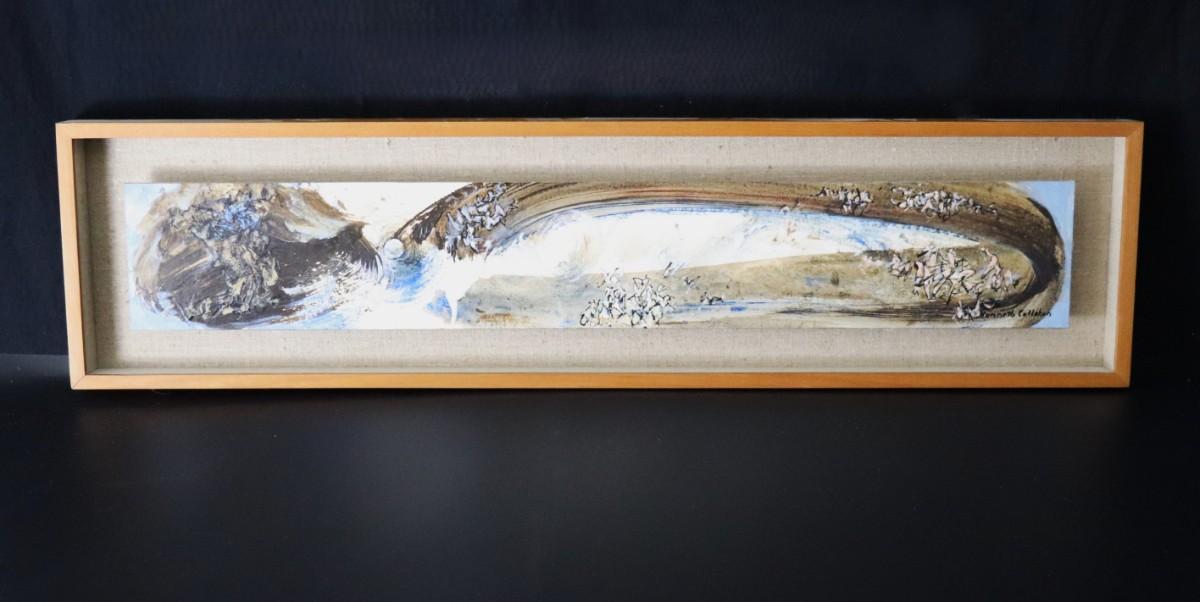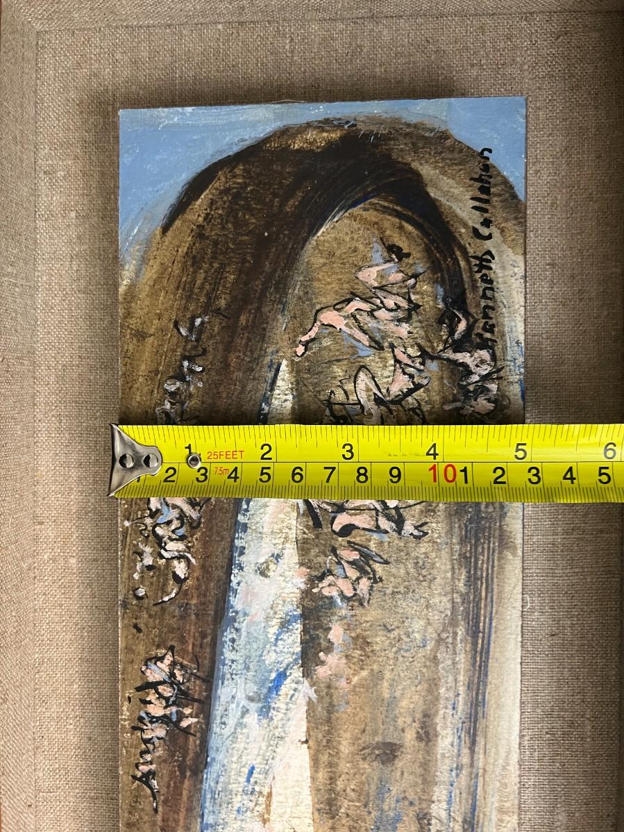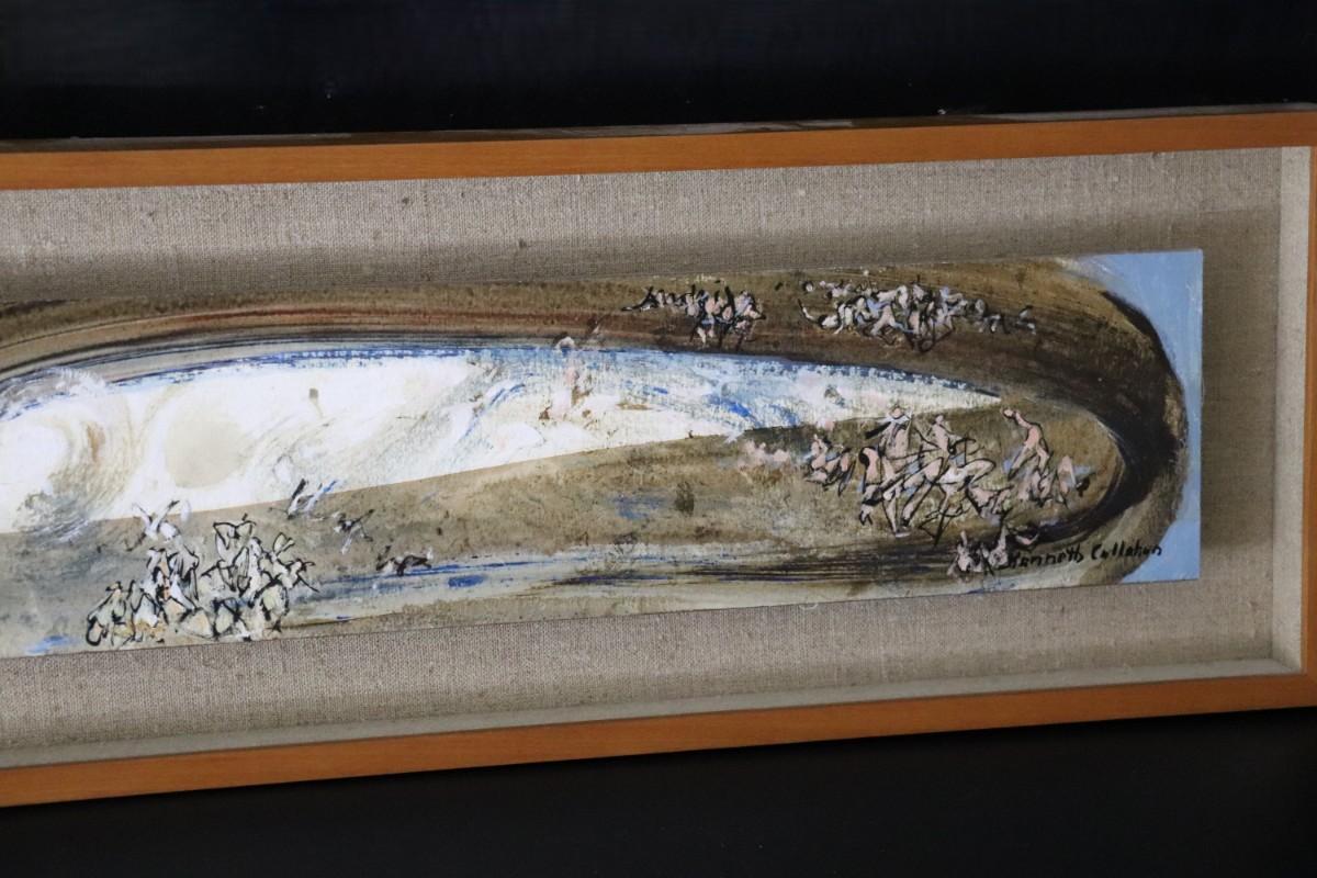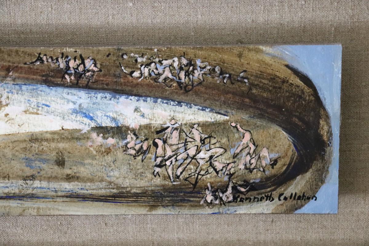 Original Kenneth Callahan (American, 1905 - 1986) Oil on Board Painting. A central sphere is encompassed by a sweeping infinity type symbol with dancing figures within the curves. Shades of black, blue, brown, and white. Painting measures approximately 5 x 32 inches (without frame). In very good condition, as shown in images. Signed by the artist. From the private collection of a close friend of the artist's.