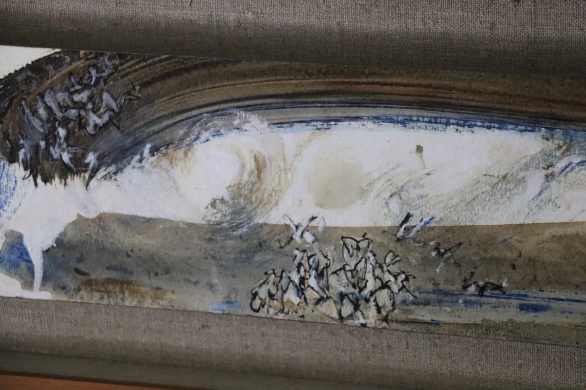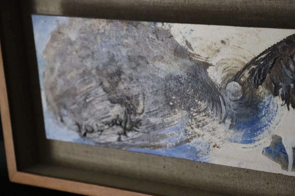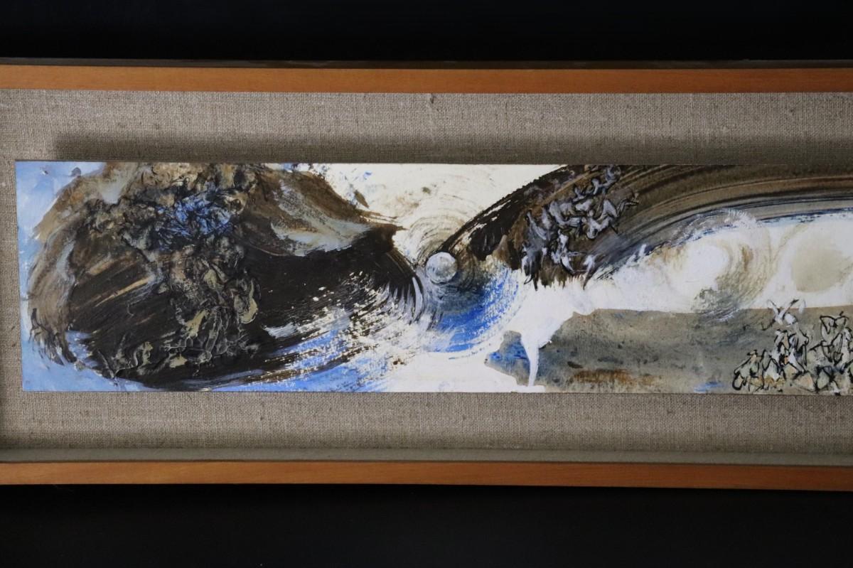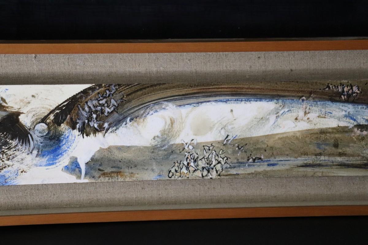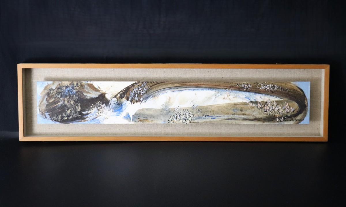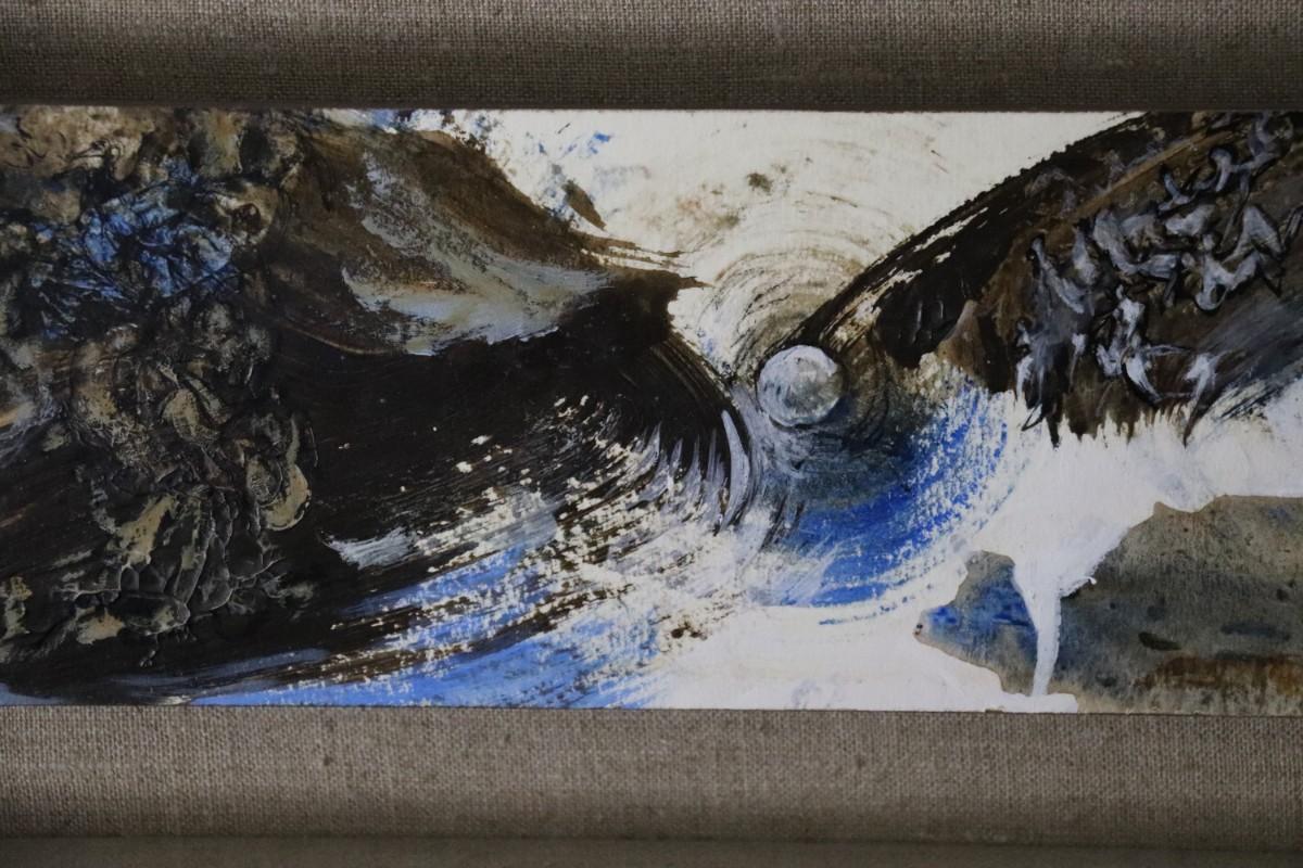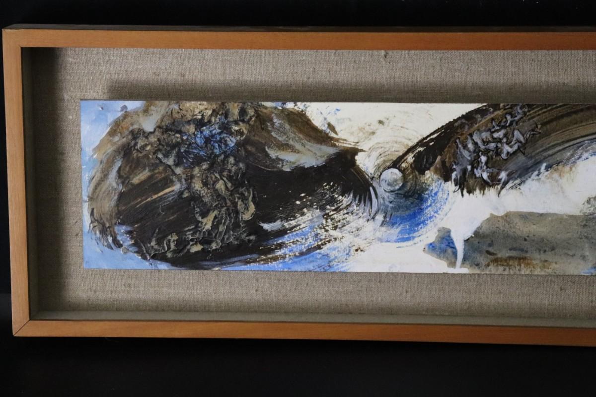 Original Kenneth Callahan (American, 1905 - 1986) Oil on Board Painting. A central sphere is encompassed by a sweeping infinity type symbol with dancing figures within the curves. Shades of black, blue, brown, and white. Painting measures approximately 5 x 32 inches (without frame). In very good condition, as shown in images. Signed by the artist. From the private collection of a close friend of the artist's.