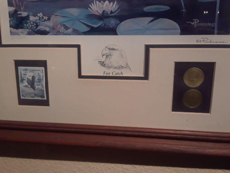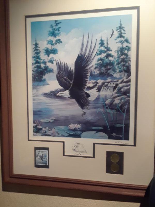 ORIGINAL LIMITED EDITION BALD EAGLE PRINT W/STAMP & 2 GOLD COINS NUMBERED