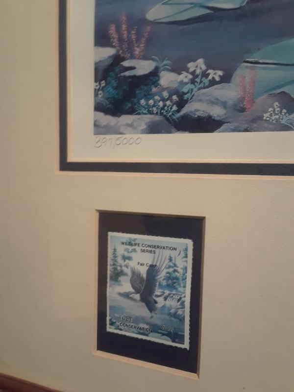 ORIGINAL LIMITED EDITION BALD EAGLE PRINT WITH STAMP AND TWO GOLD COINS NUMBERED AND SIGNED BY ARTIST VALUED AT $425