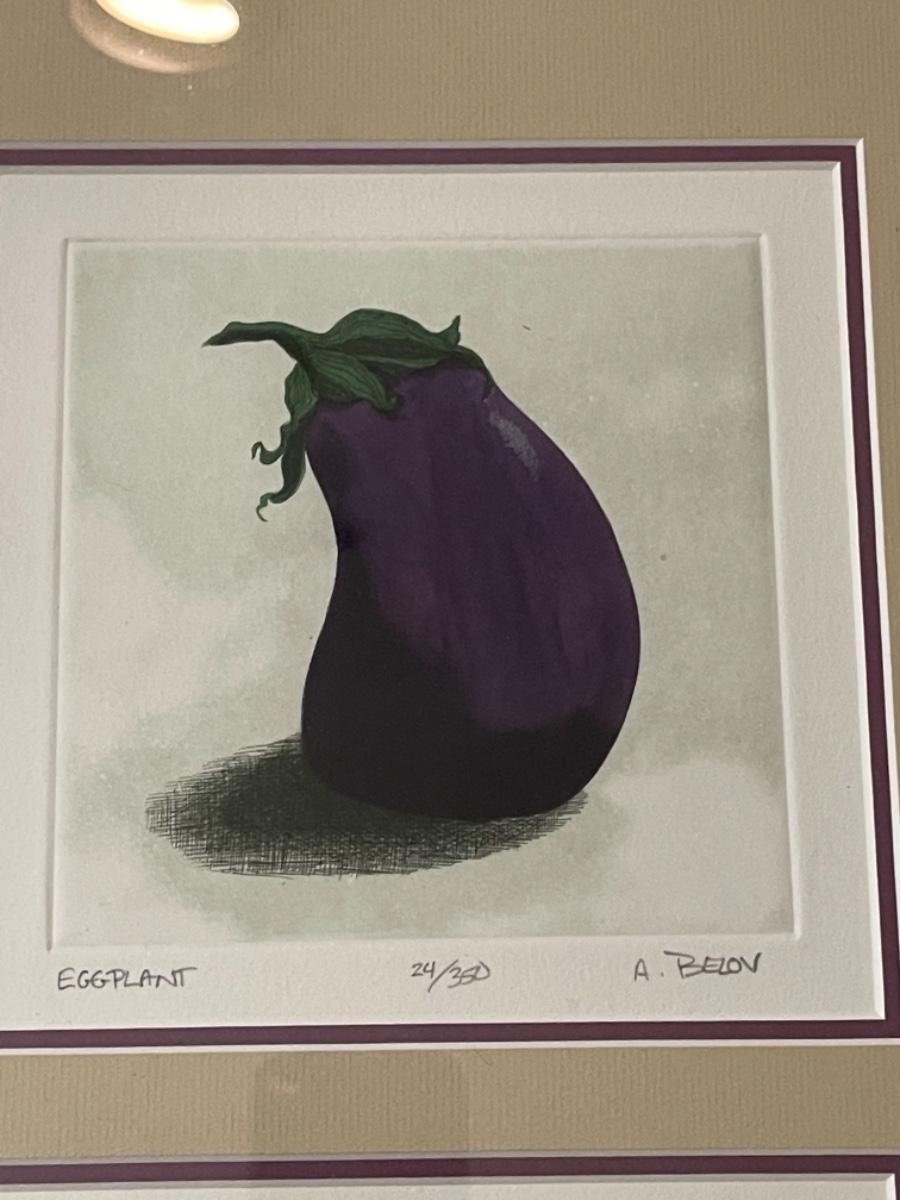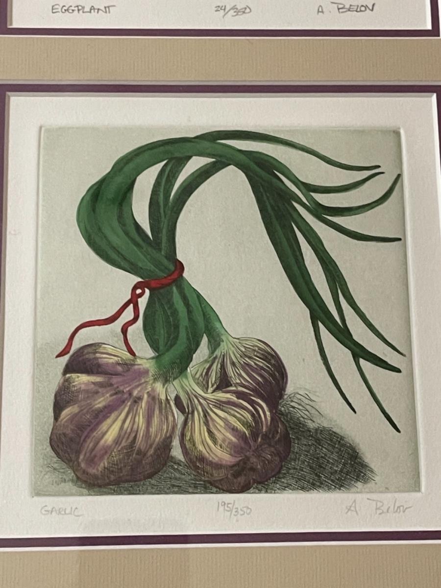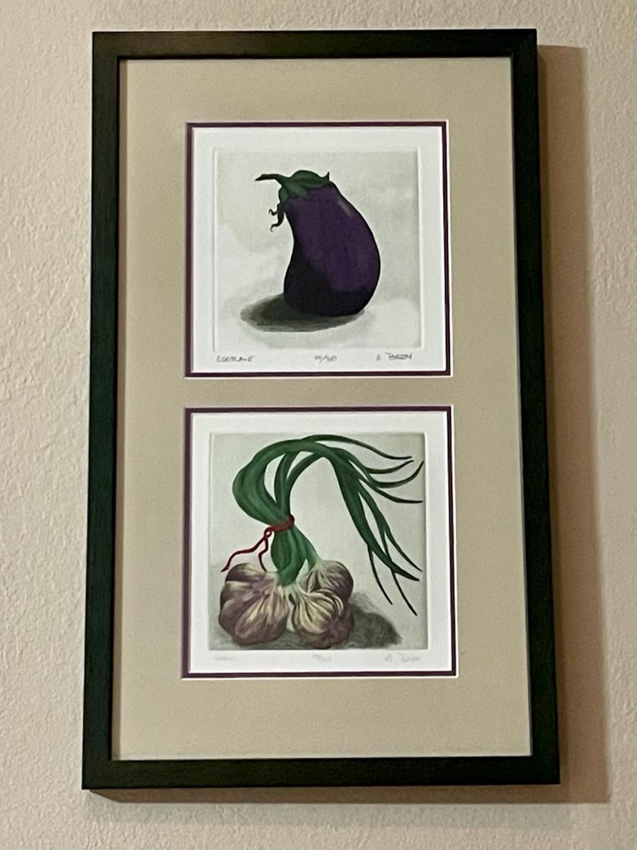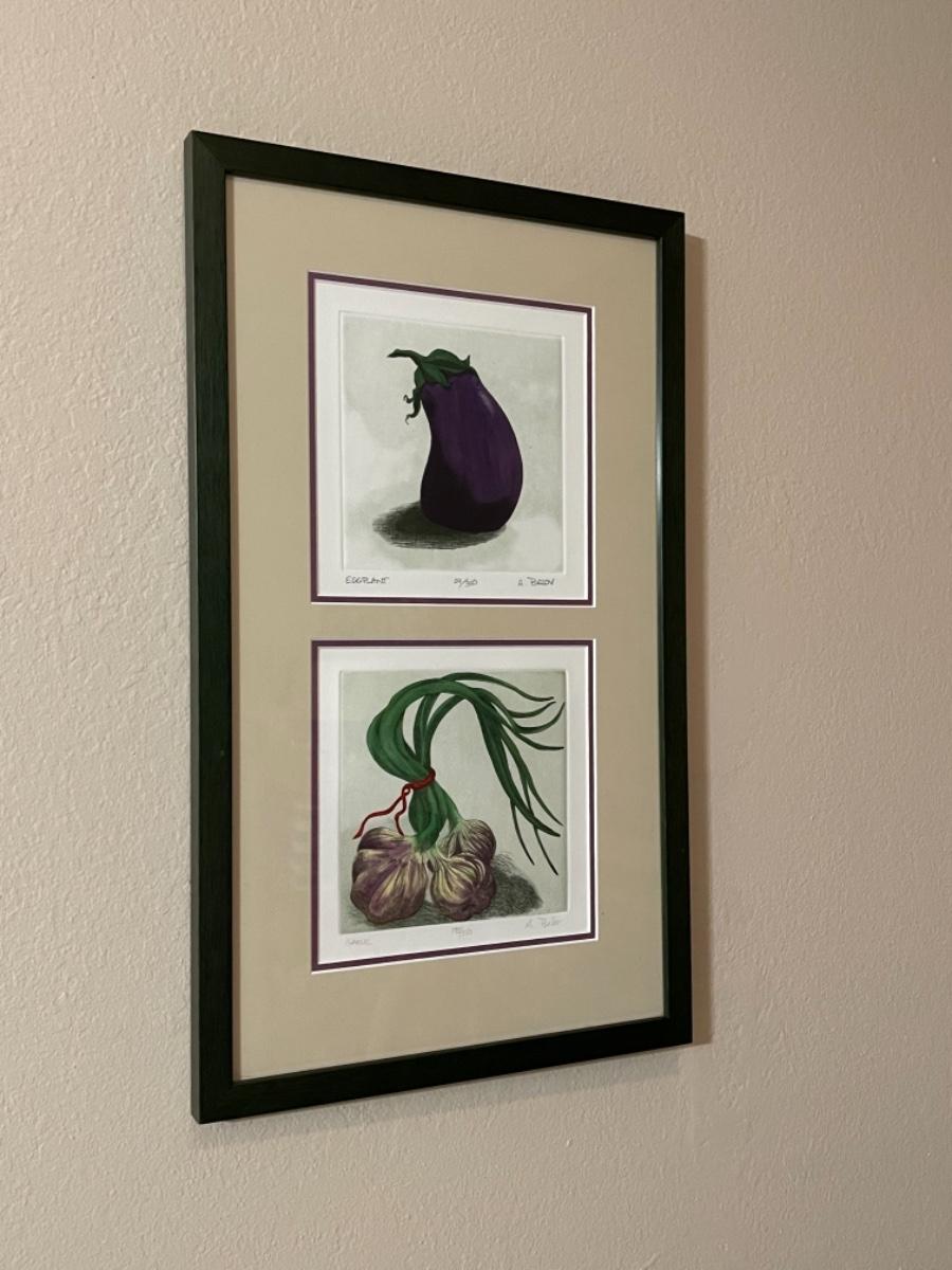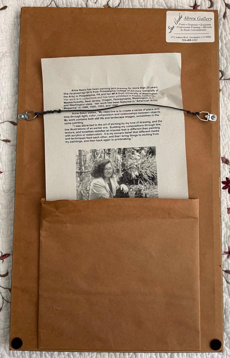 Lot of two, original etchings, numbered and signed by artist, Anne Belov (bio included on back). Both professionally framed together in one wood frame with glass front. Each etching measures 7” x 7” and frame measures 12 1/2” x 21” - shipping available.
