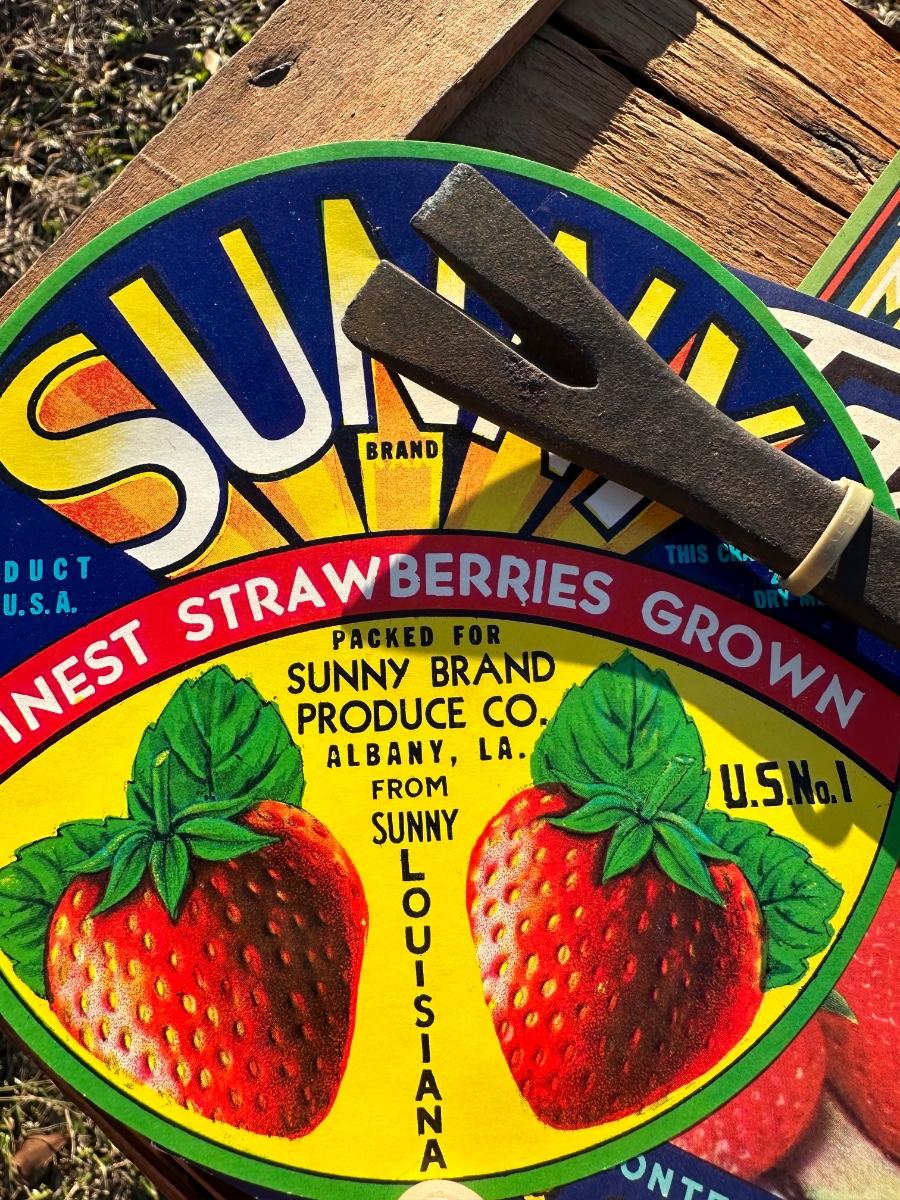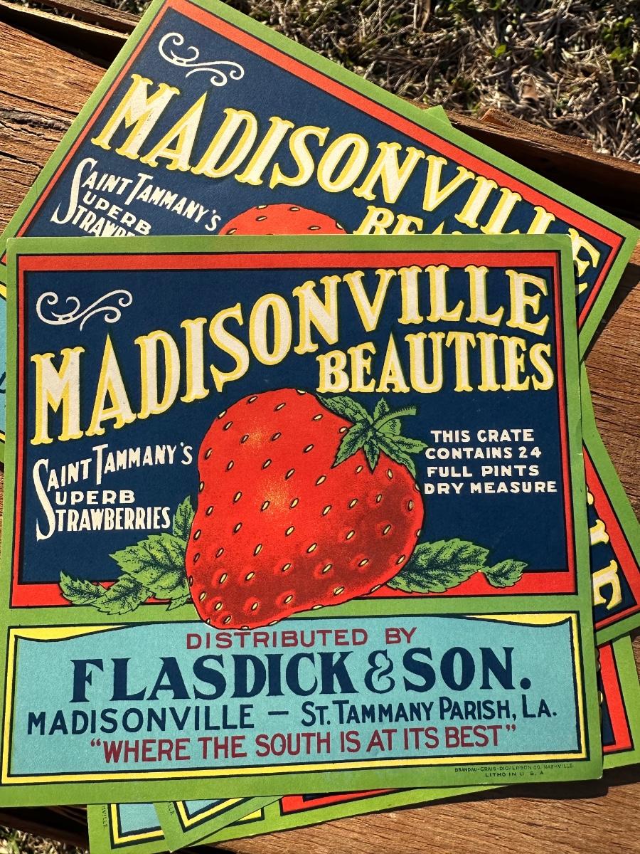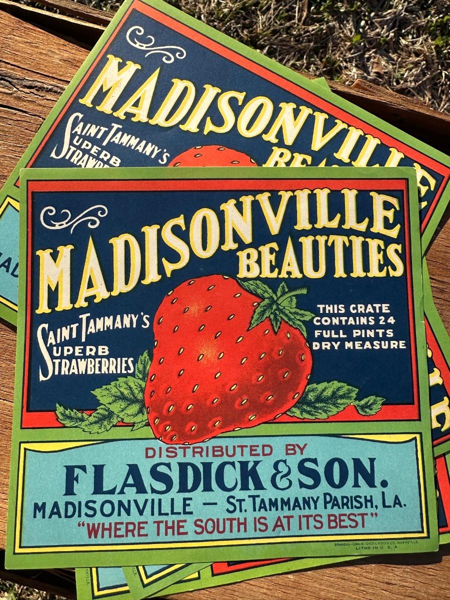 • Original printed strawberry crate labels (Madisonville Beauties, Sunny Brand, etc.)