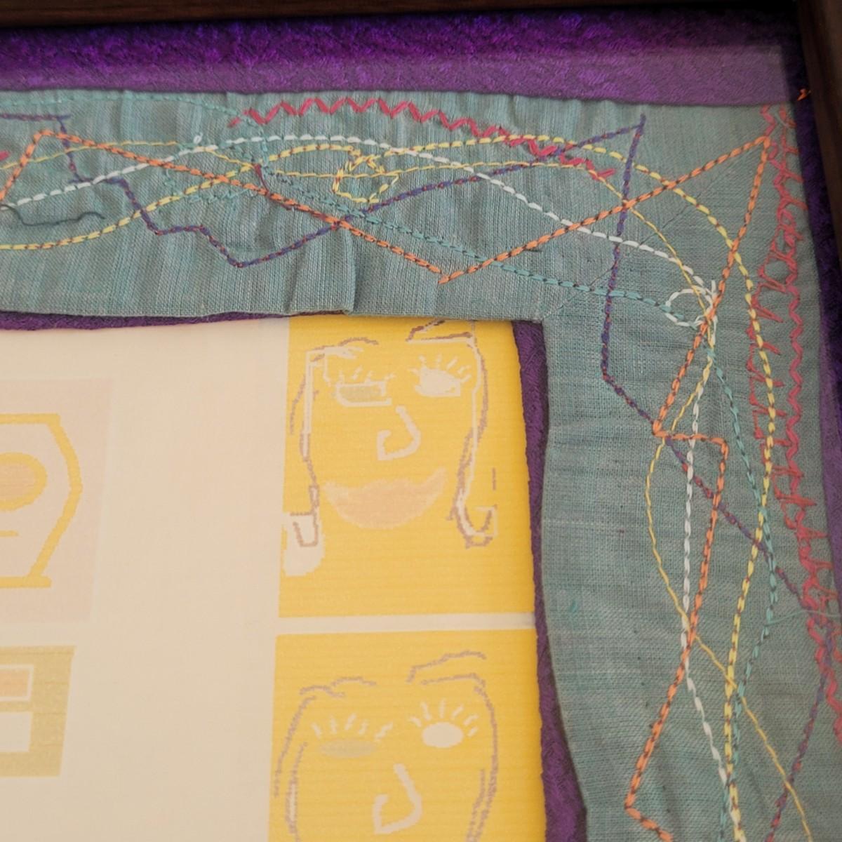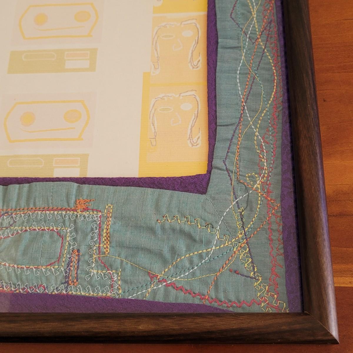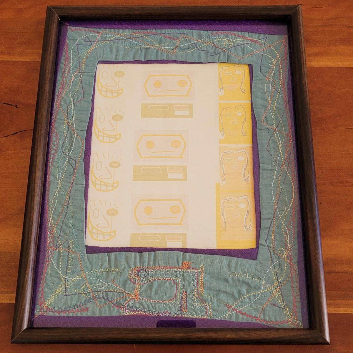 Mixed media art piece by an unknown artist. The work has no makers mark or signature to be seen. It is a mix of printed images of faces and sewn fabrics of varying colors. There is an image of a sewing machine hidden in the stitching. The piece is under glass and framed in wood. The frame measures 12" x 15"H.