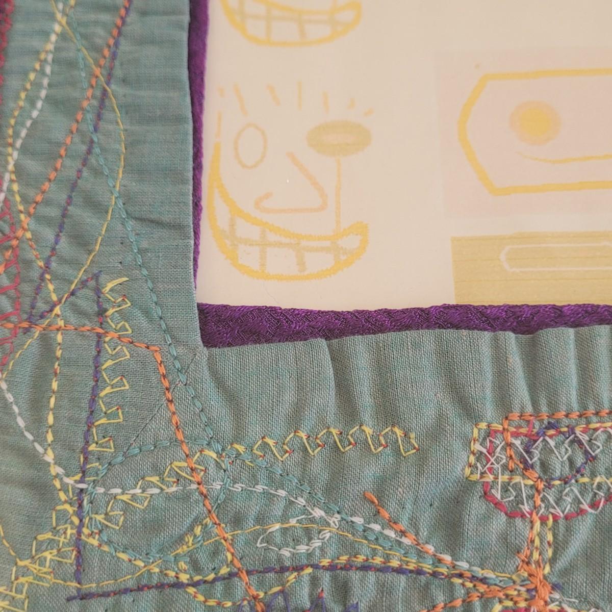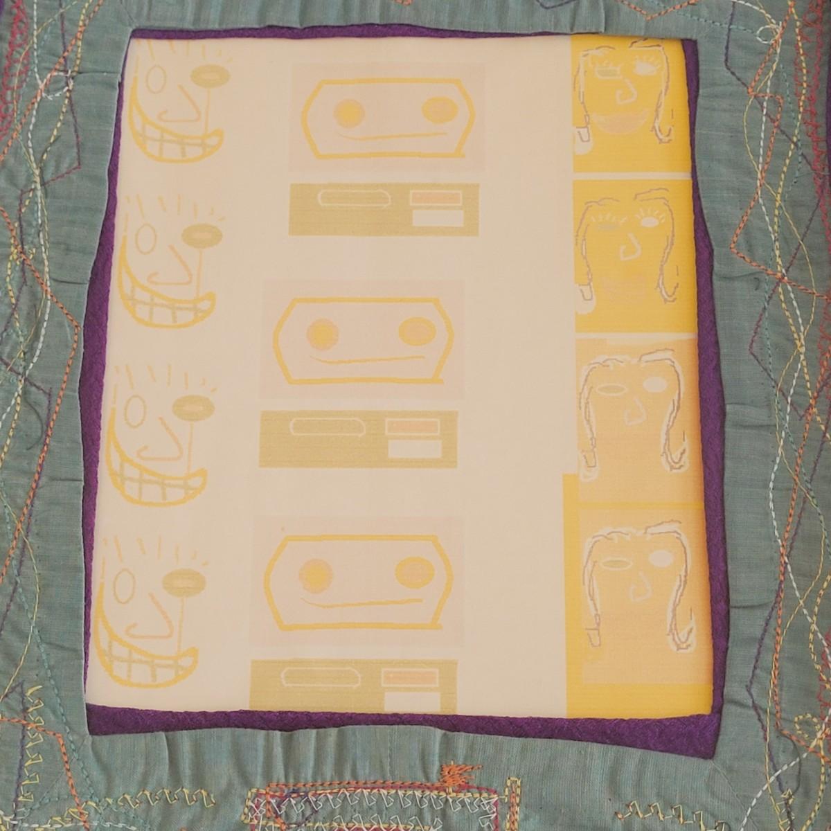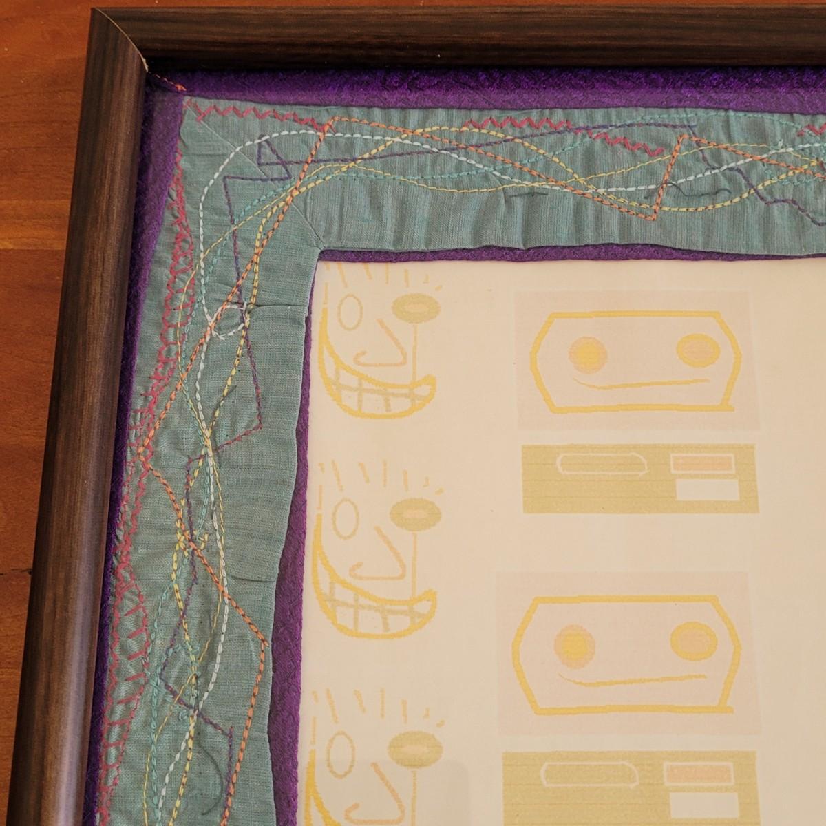 Mixed media art piece by an unknown artist. The work has no makers mark or signature to be seen. It is a mix of printed images of faces and sewn fabrics of varying colors. There is an image of a sewing machine hidden in the stitching. The piece is under glass and framed in wood. The frame measures 12" x 15"H.