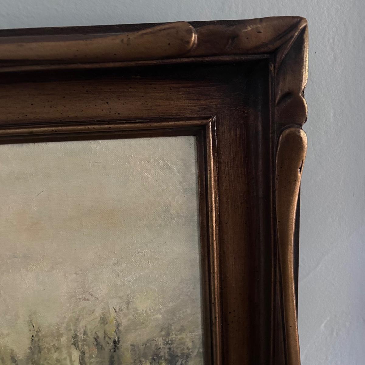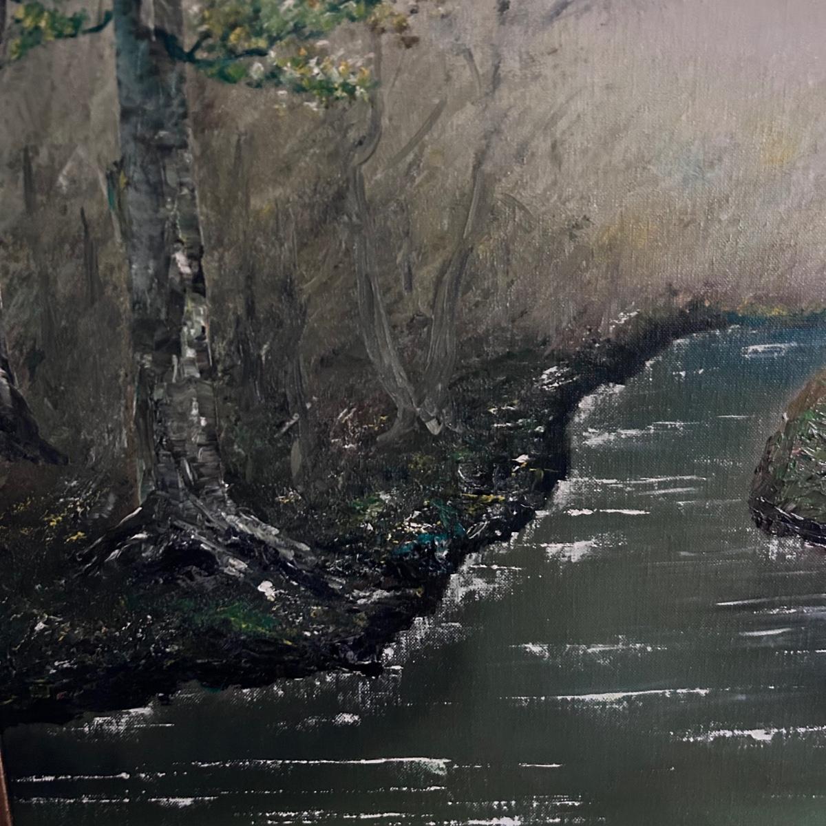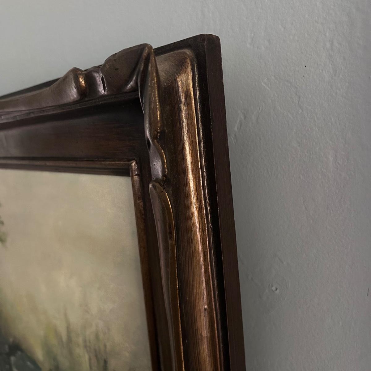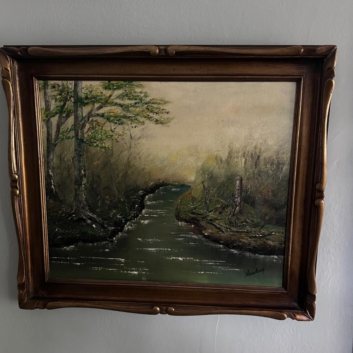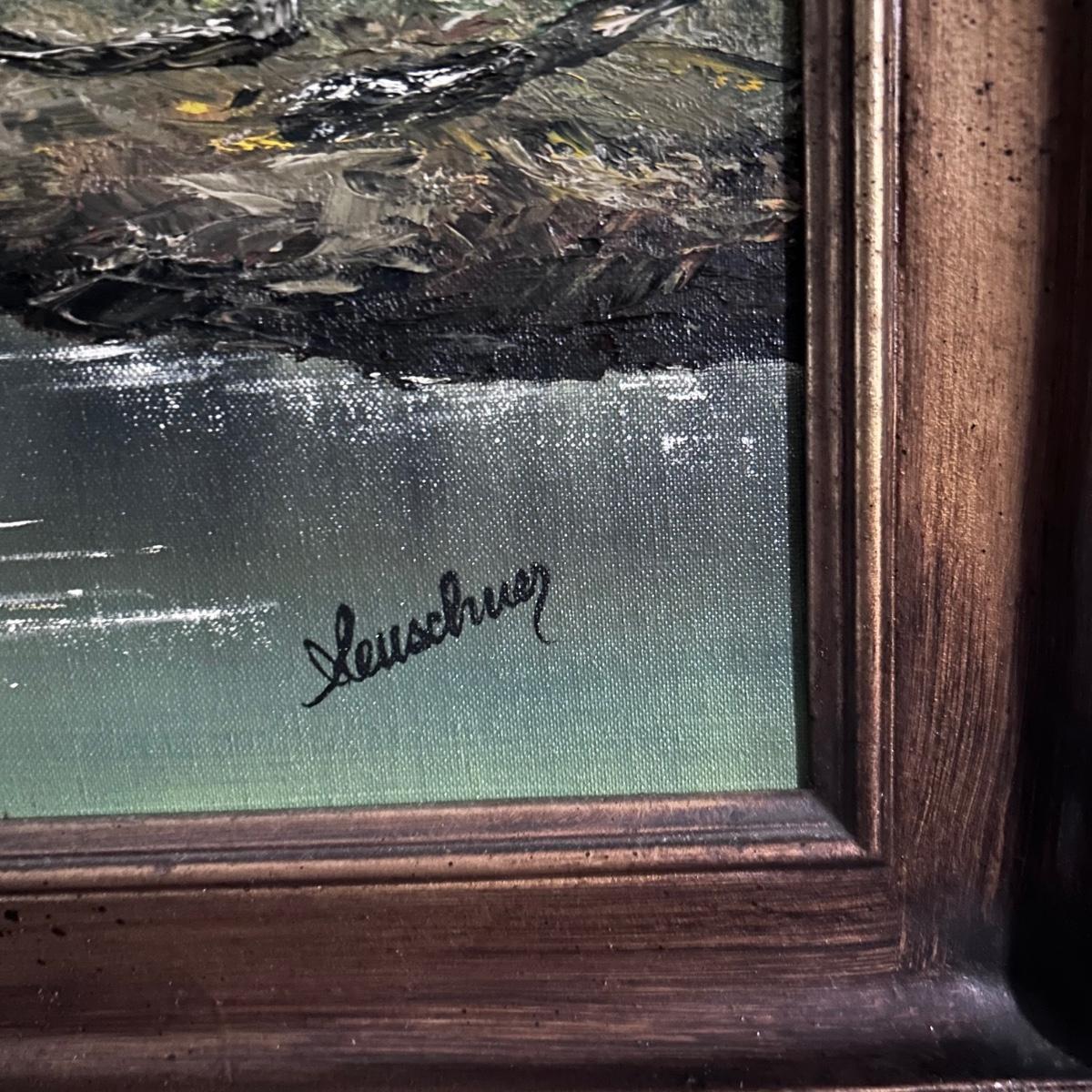 Framed original, what appears to be an oil painting or stream. Piece is signed and appears to read Seuschuer. Framed is bronze colored wood frame and art is on canvas board. Frame measures 29.5”x22.5”x2”. Shipping available. Shipping can be costly. We suggest contacting our preferred local shipping provider, Postage Express, with dimensions and getting an estimate before bidding: (828) 255-9250 or shipping@postageexpressnc.com