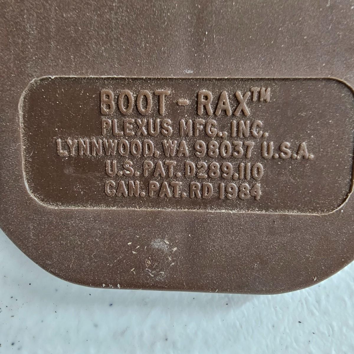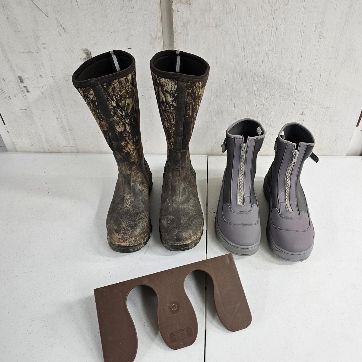 One pre-worn pair size 11-12 Boots from the Original Muck Boot Company. Boots are 15"H and have some wear on bottoms. Lot also contains a pair of pre-worn lavender Frogg Toggs short boots in size 12 with zipper fronts. One Boot Rax wall mount boot holder, 12" x 6" x 3.5"H. See photos for details. Shipping available.