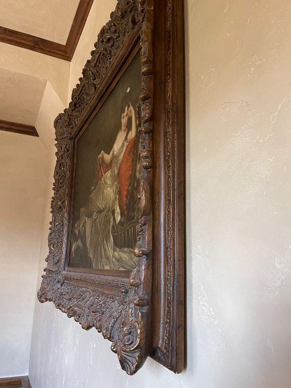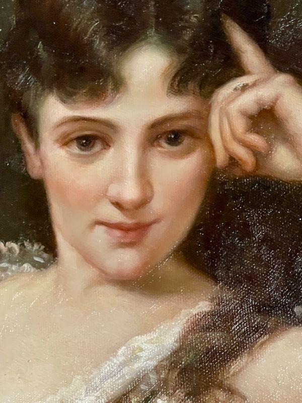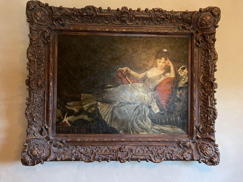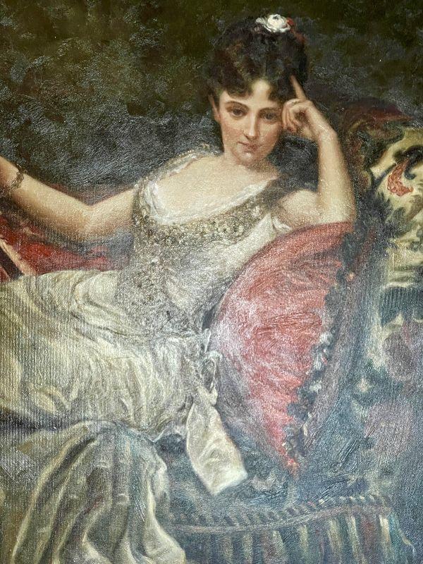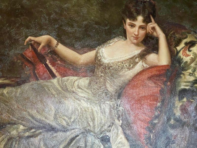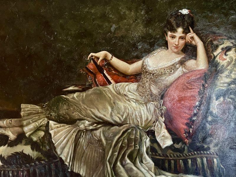 The subject item is a stunning French studio portrait of a beautiful, and obviously wealthy young woman dressed in an elaborate gown with a long train, posed and resting on a fainting couch, looking directly at the viewer. The painting has been signed lower right and is appropriately set into a museum style dark, molded frame.