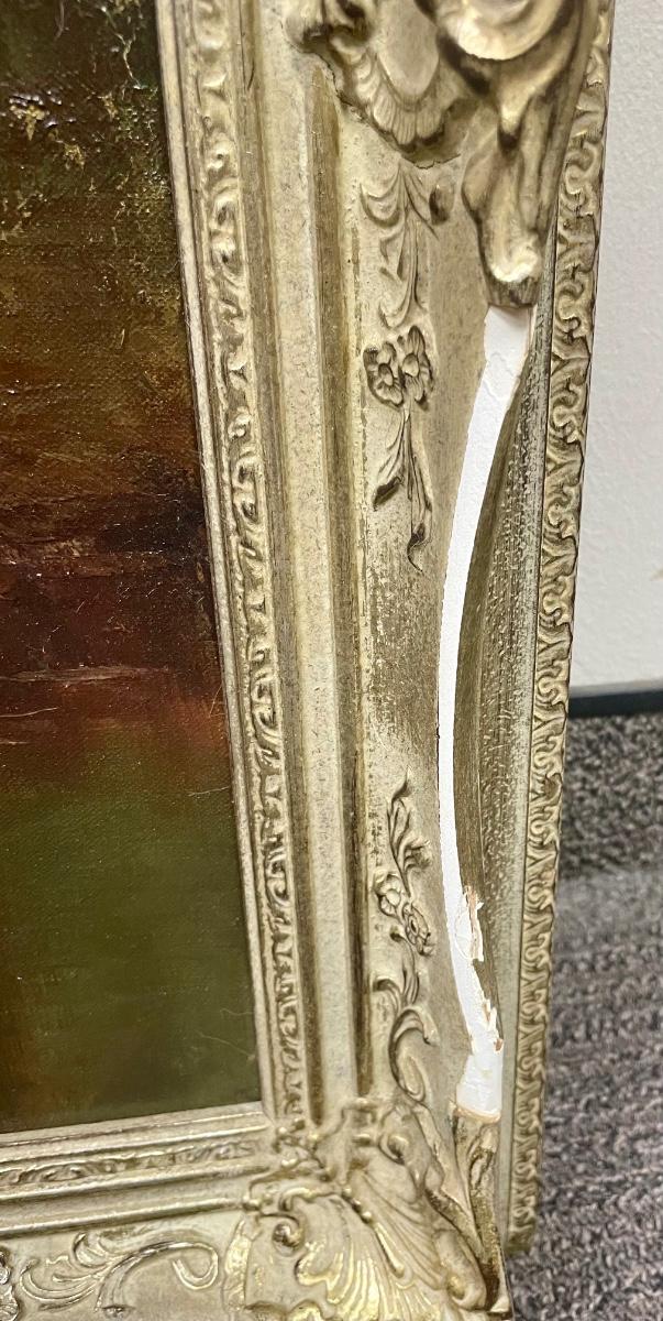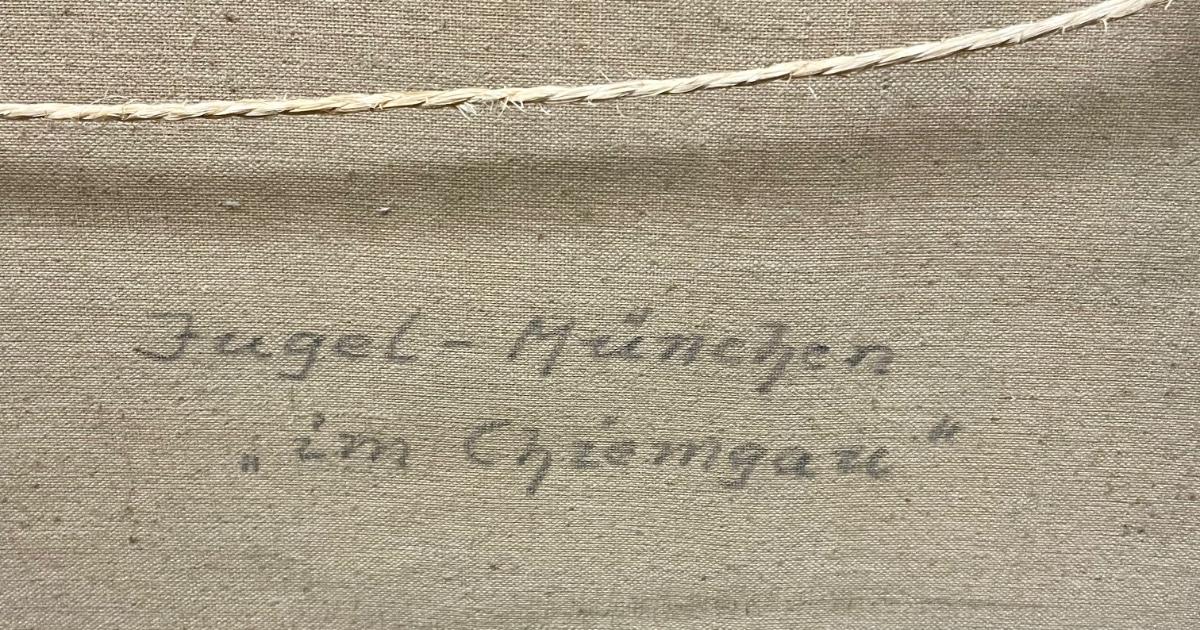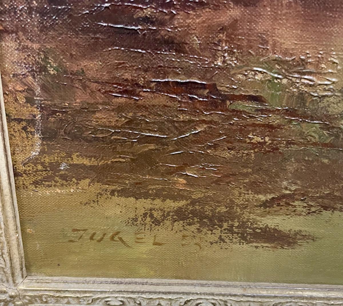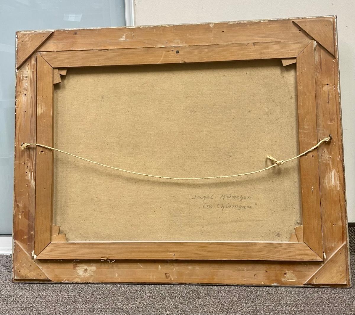From Munich, Germany by artist Jugel. Framed size is approx. 30” x 36”. Note that right side of frame has minor damage, see photos. Painting is in good condition.