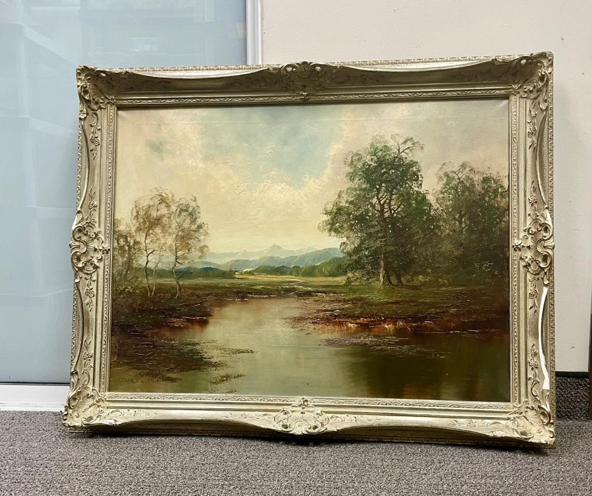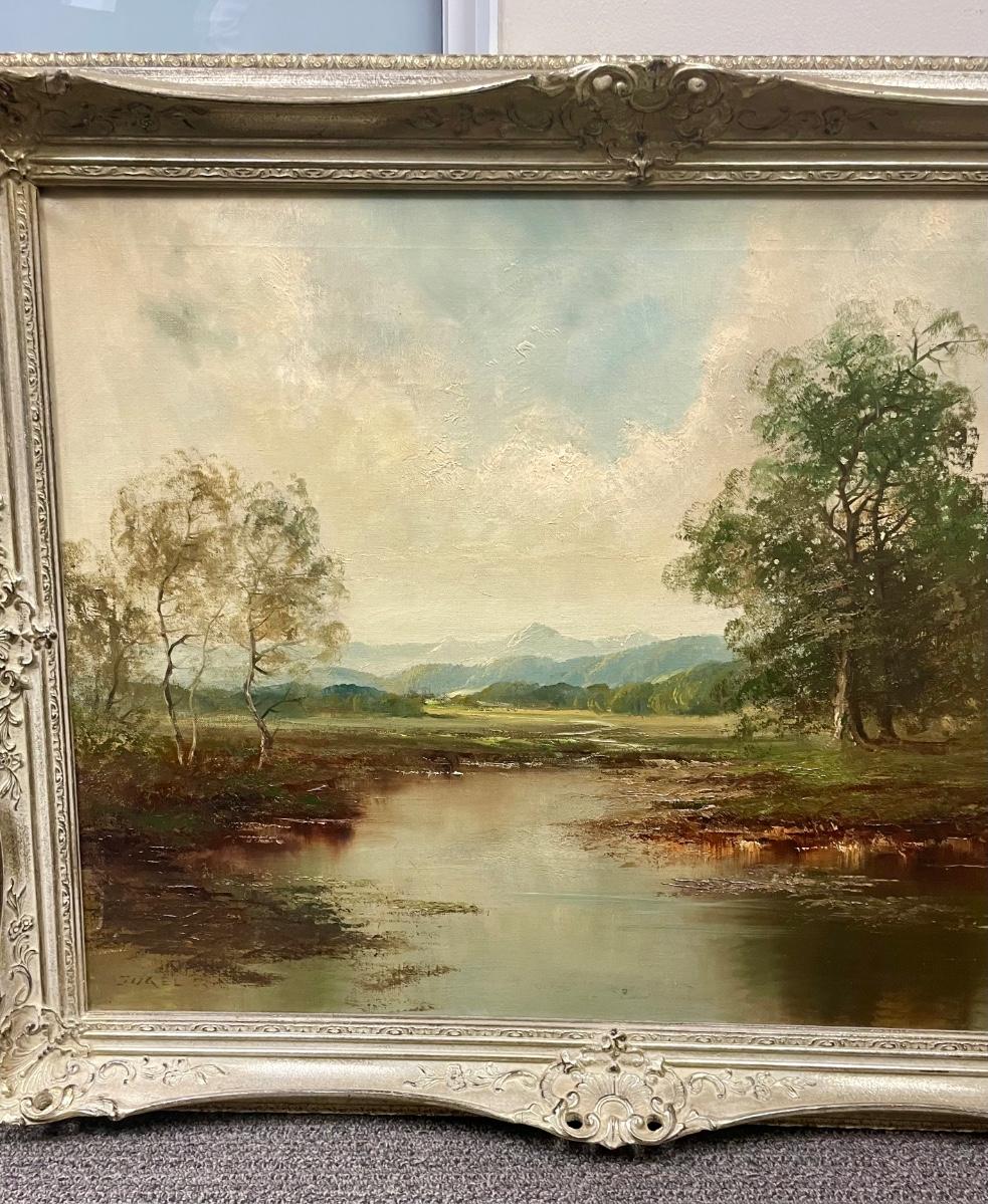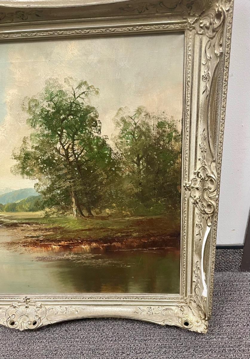 From Munich, Germany by artist Jugel. Framed size is approx. 30” x 36”. Note that right side of frame has minor damage, see photos. Painting is in good condition.