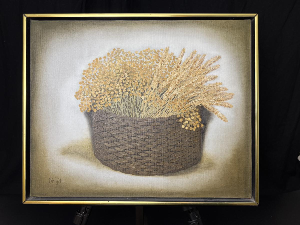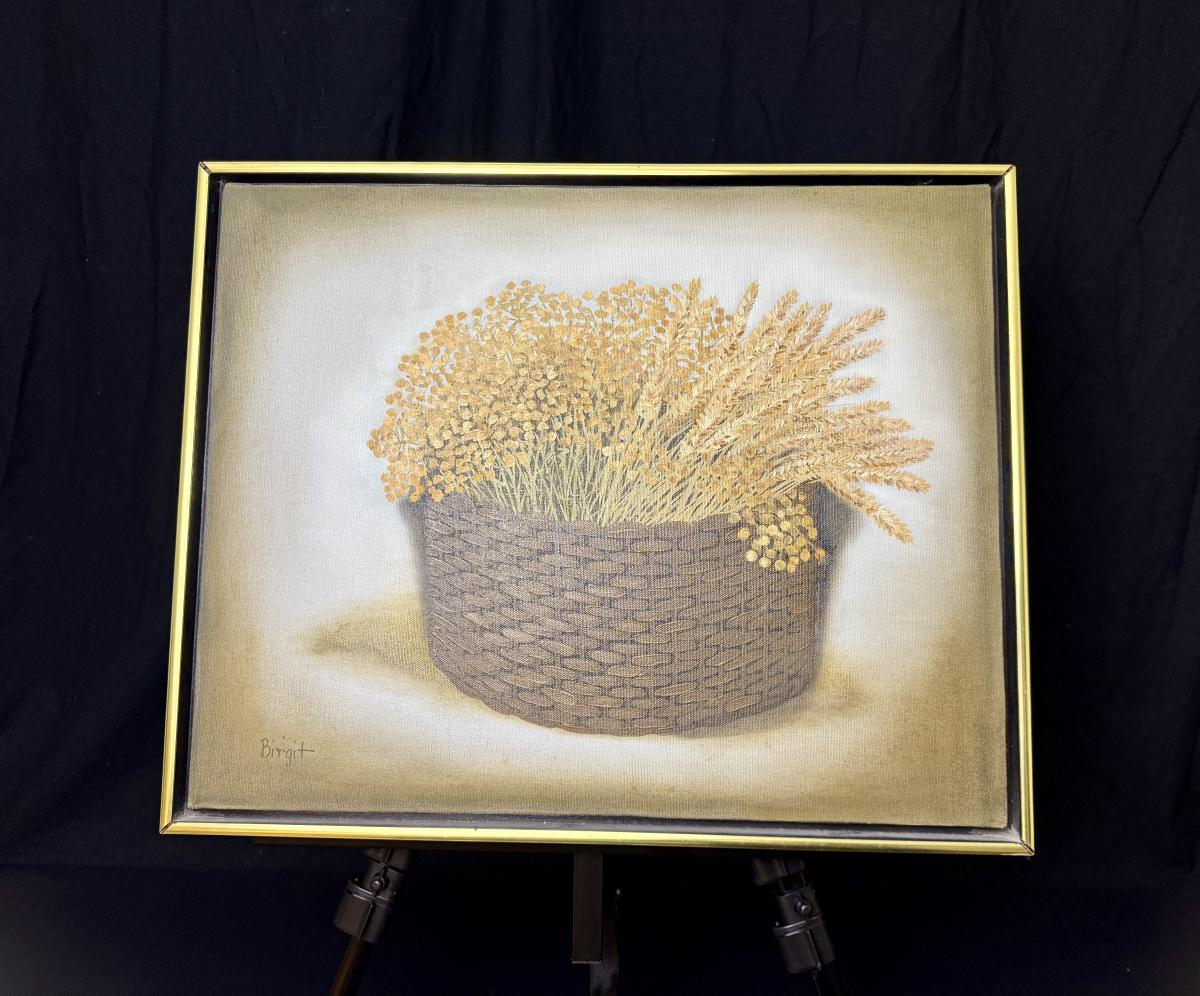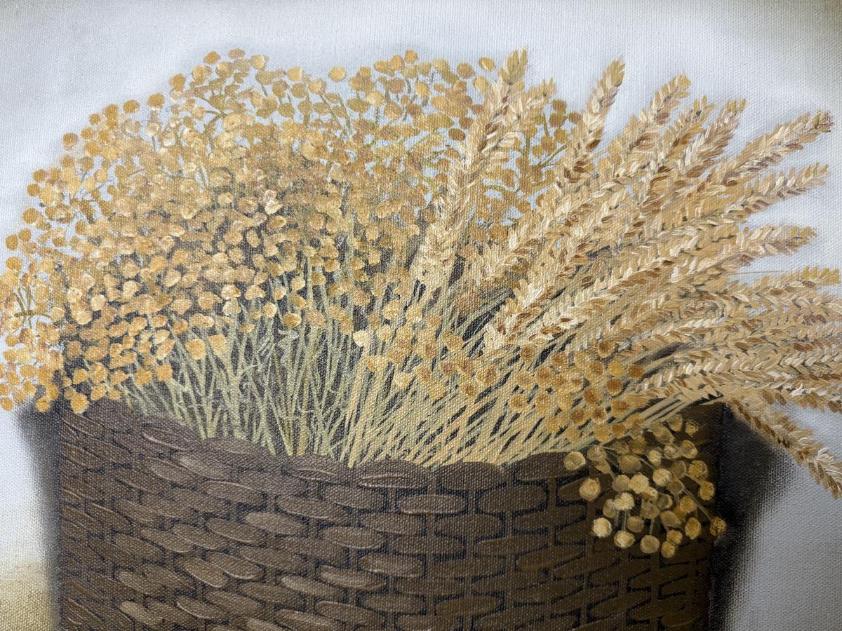 Nice original oil painting by Birgit showing a basket of wheat and dried flowers.