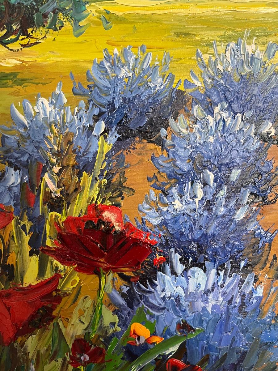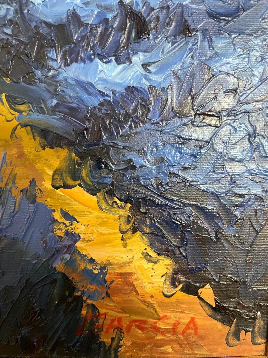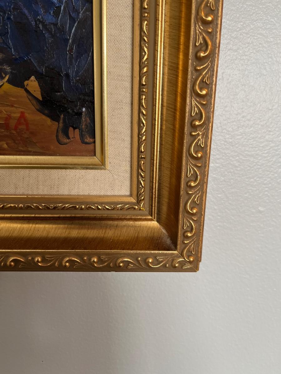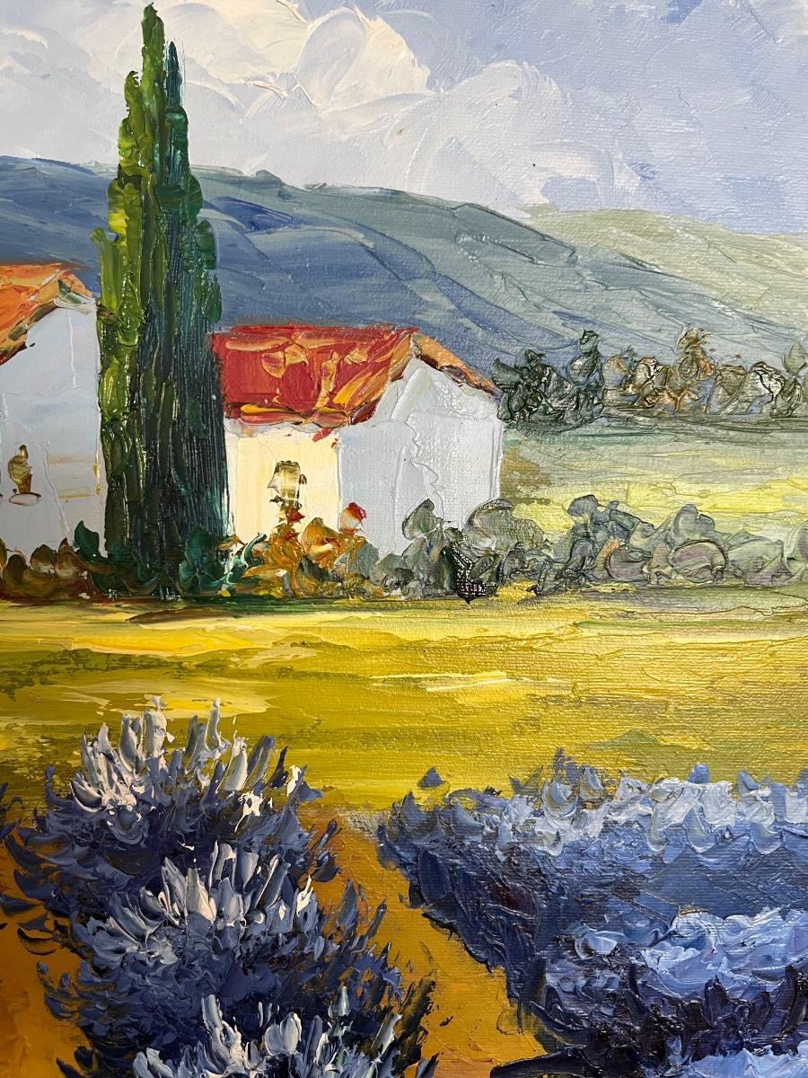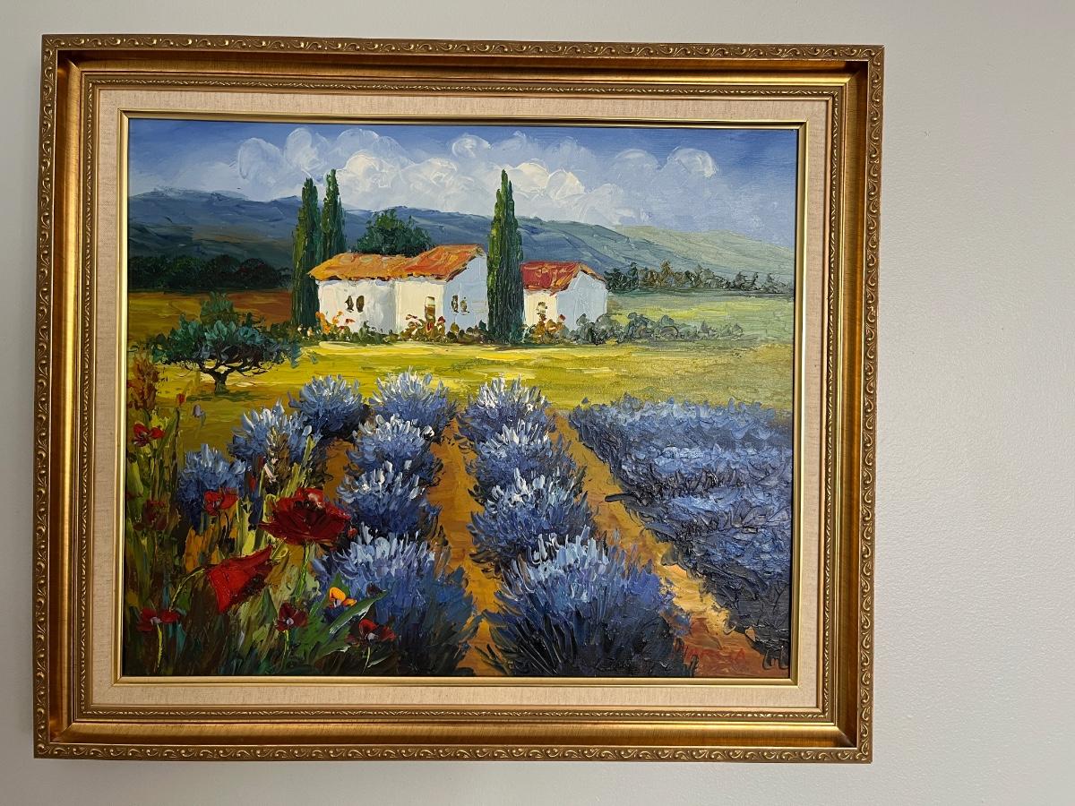 This is a lovely painting of the lavender fields in the south of France with a little farmhouse and mountains in the distance. The painting is signed Garcia and is encased in a gold frame with a linen rabbit. It's a very attractive and well done painting, perfect for anyone who loves France.