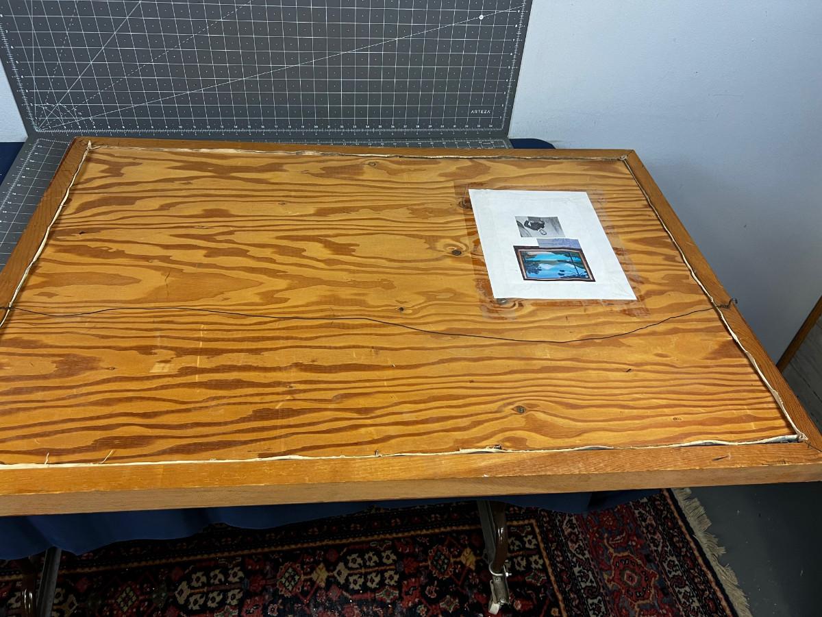 A printout of Pricing on the back. This is on Plywood. 39" X 25" Canvas is attached to plywood. Could be removed to ship. Art packing fee of an additional $35.00 for Packing.