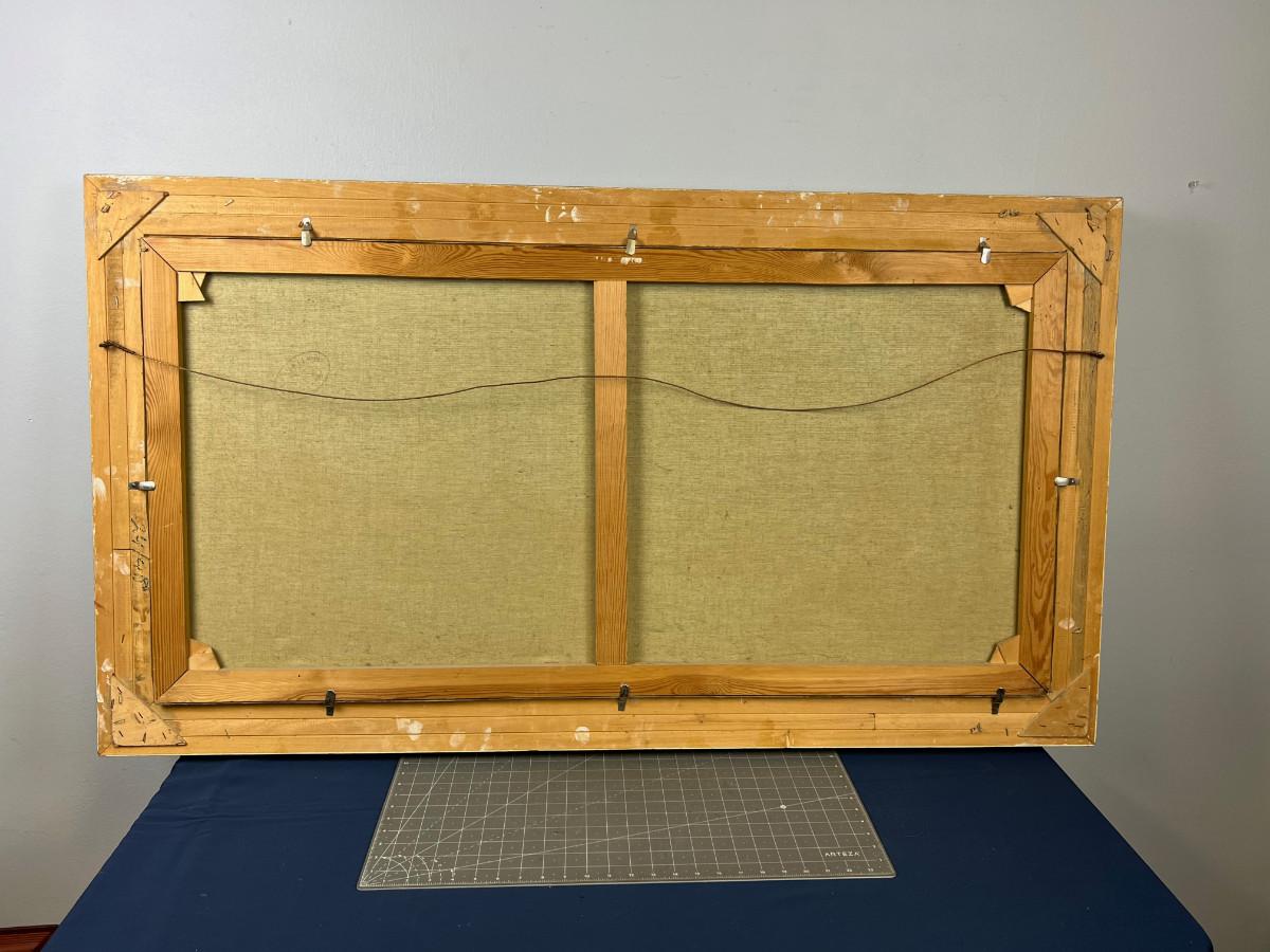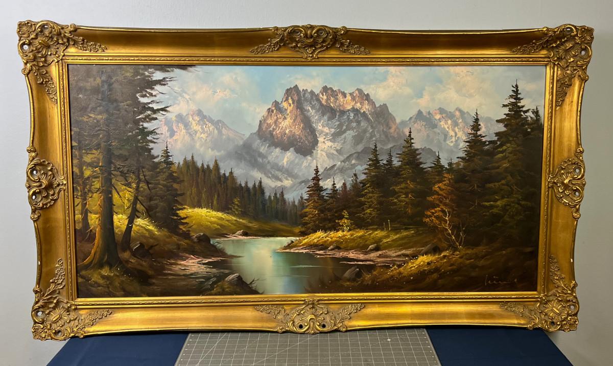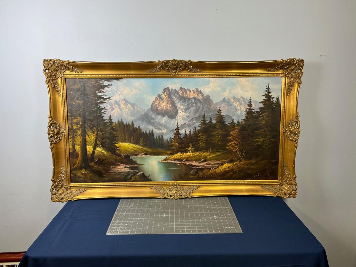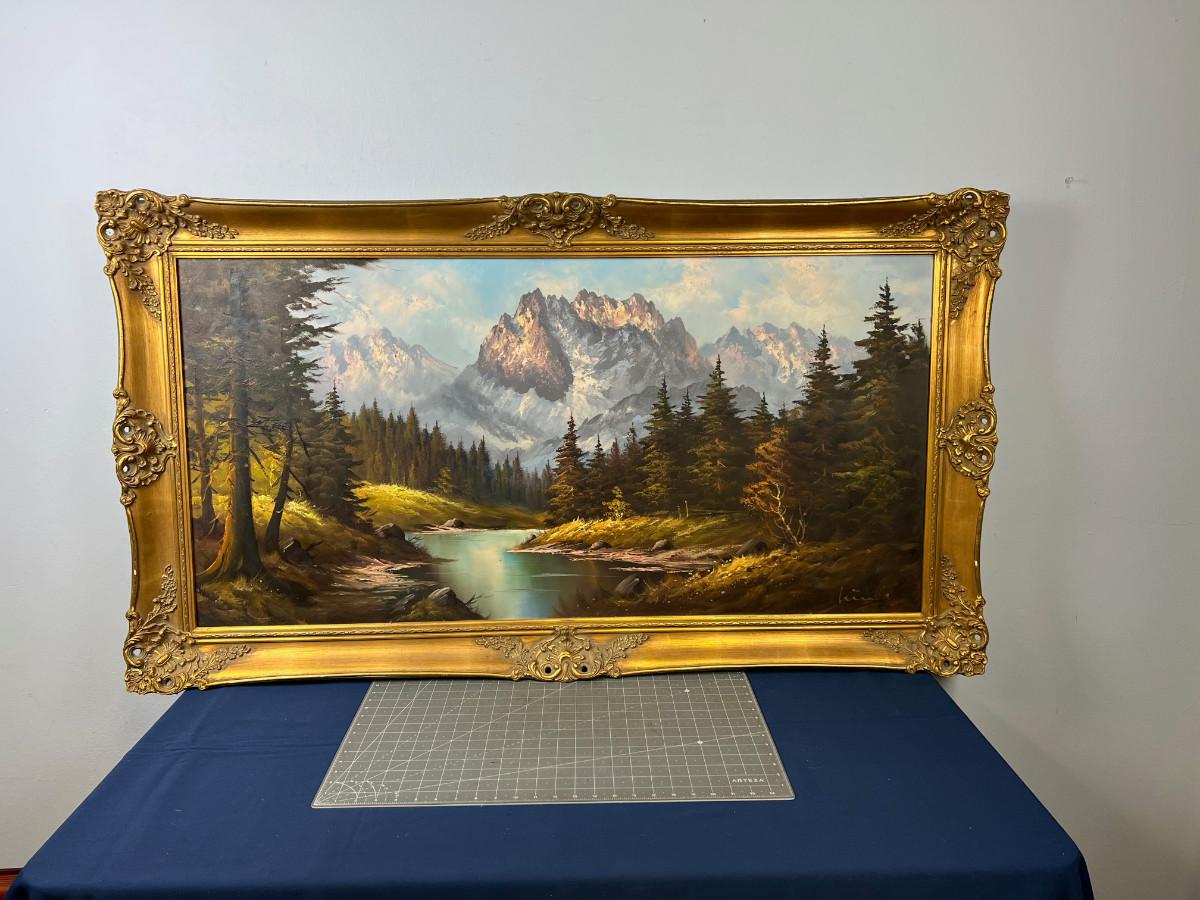 painting is in good overall condition, country of origin Germany, painting is 48" by 24" plus the frame. marked West Germany on the stretcher so most likely late 1960's for the age of this impressive landscape.