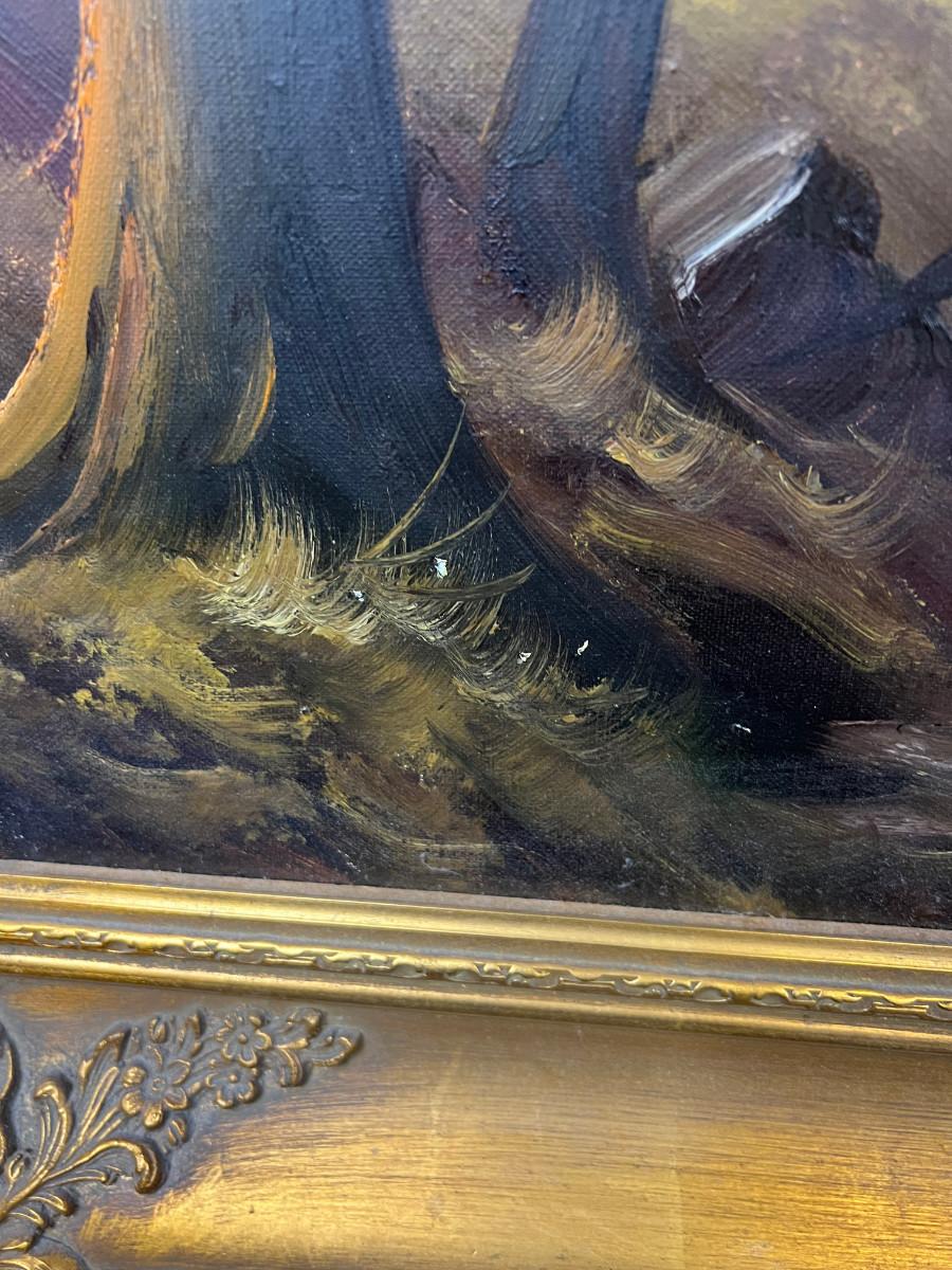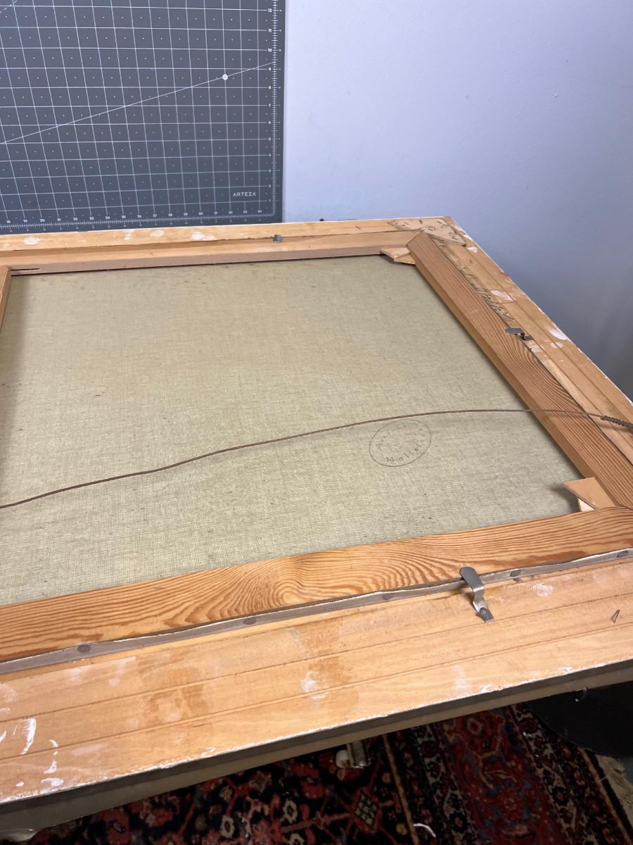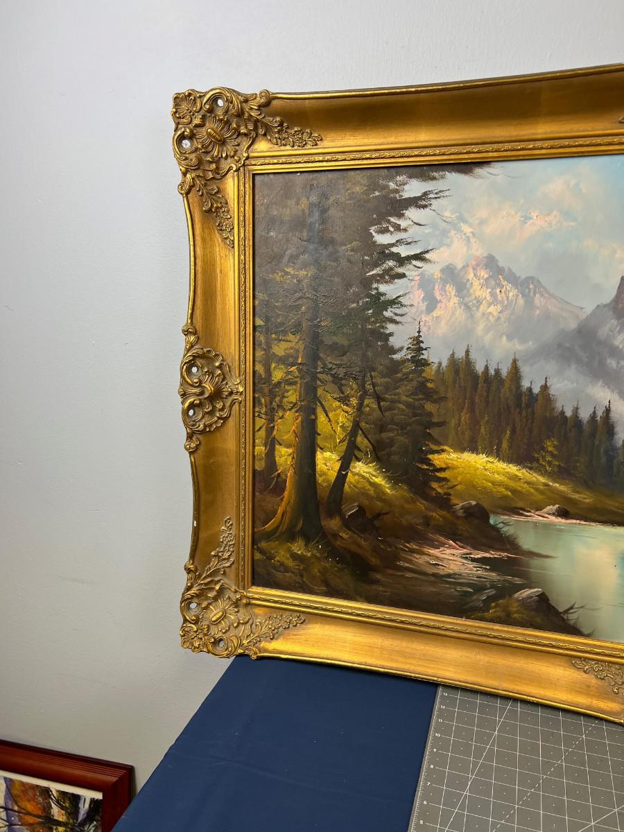 painting is in good overall condition, country of origin Germany, painting is 48" by 24" plus the frame. marked West Germany on the stretcher so most likely late 1960's for the age of this impressive landscape.