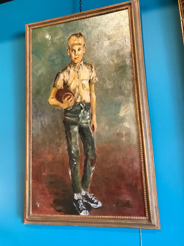 Beautiful original oil on canvas by noted California artist Helen Koepke. She was known for her wonderful children's portraiture, and this portrait entitled "Todd" is a great example. Full length portrait of a blond haired boy with gleaming blue eyes stands casually with his football, wearing a button down shirt, blue jeans, and tennis shoes, in front of a neutral background. Framed in an antique gold frame. Signed and dated lower right. Koepke's work is found in many art galleries and private collections throughout the US. 22 1/2" x 37" H.