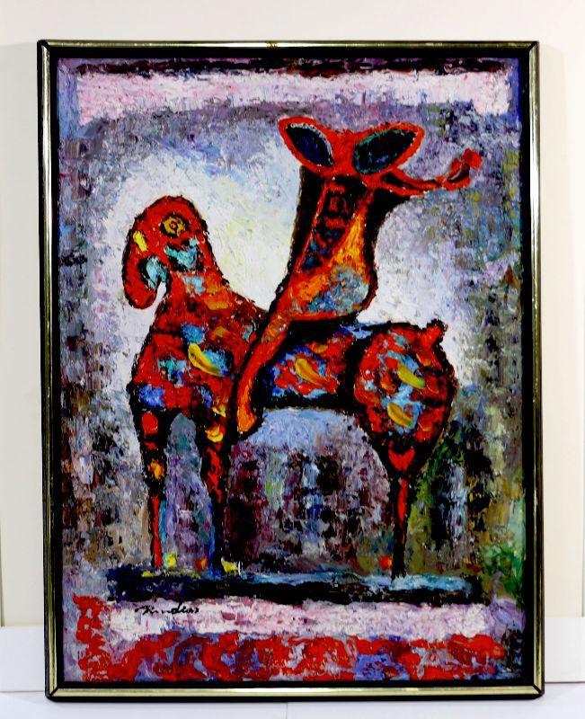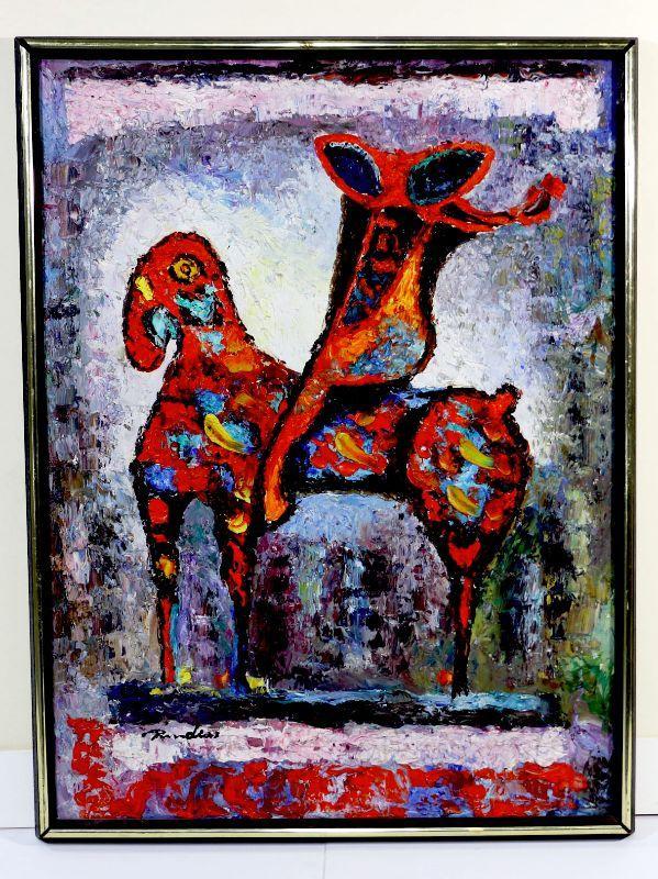Mid-century era painting - oil on canvas featuring Red Horse or Horse and Rider after Marino Marini, Signed at lower left corner, artist name not readable, amazing abstract piece after famous Italian painter. Approximate dimensions: painting - 18" x 24", frame - 19" x 25".