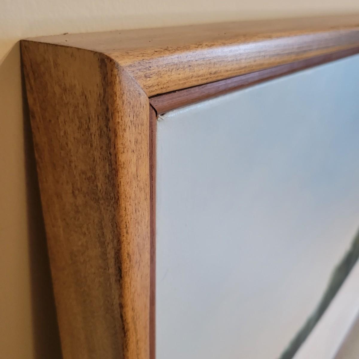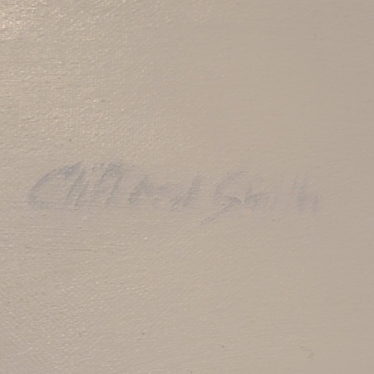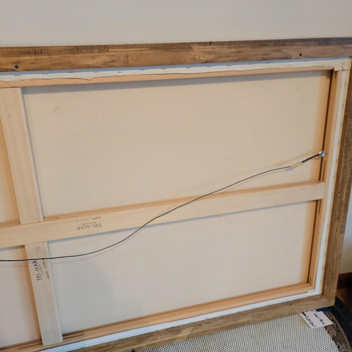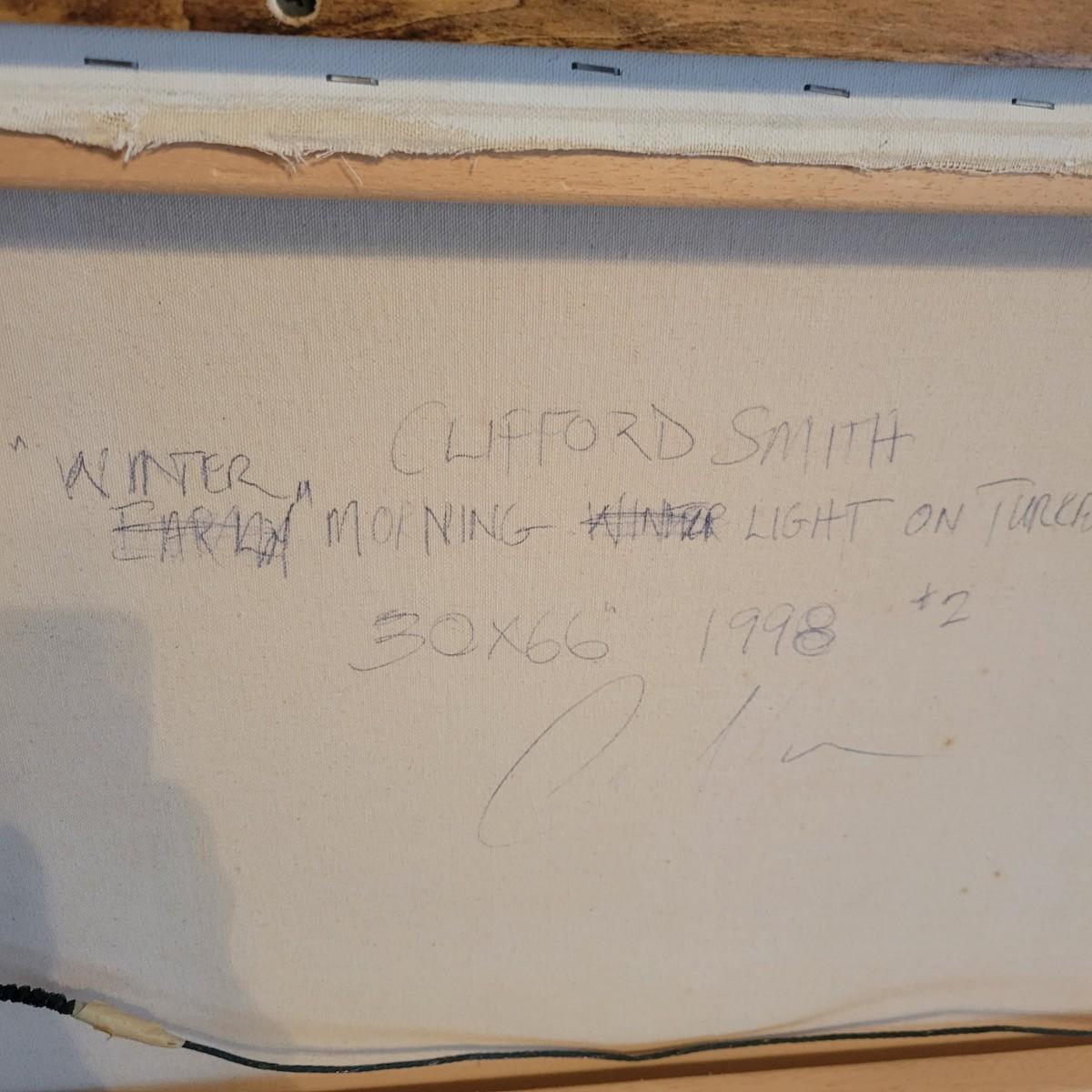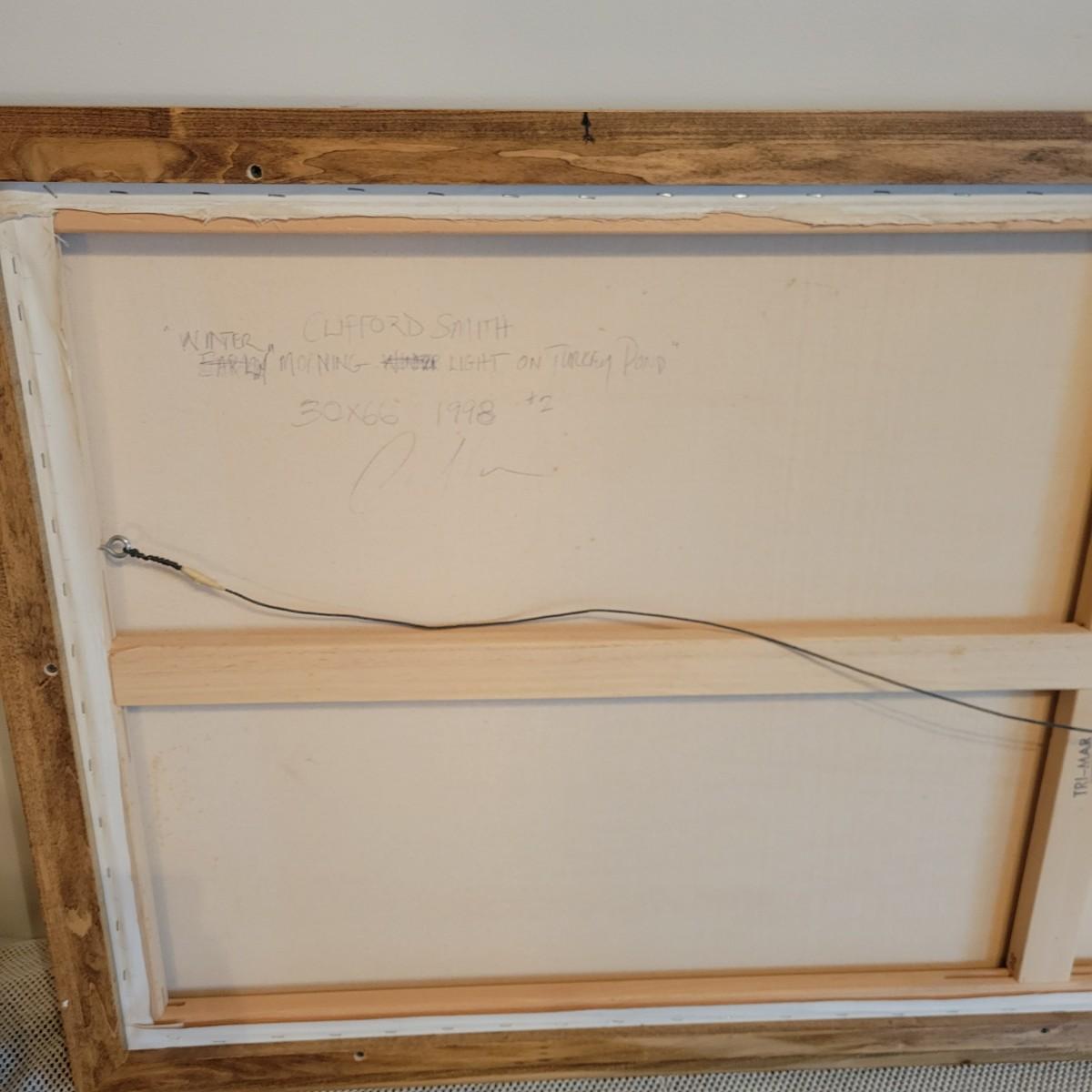 A framed original oil painting by Clifford Smith titled "Winter Light and Snow on Turkey Creek". It is framed in a double, solid wood canvas frame with two different stain tones. It measures approximately 68.5" x 2.5" x 32.5"H. Shipping available. Shipping can be costly. We suggest contacting our preferred local shipping provider, Postage Express, with dimensions and getting an estimate before bidding: (828) 670-5501 or postageexpress@yahoo.com.