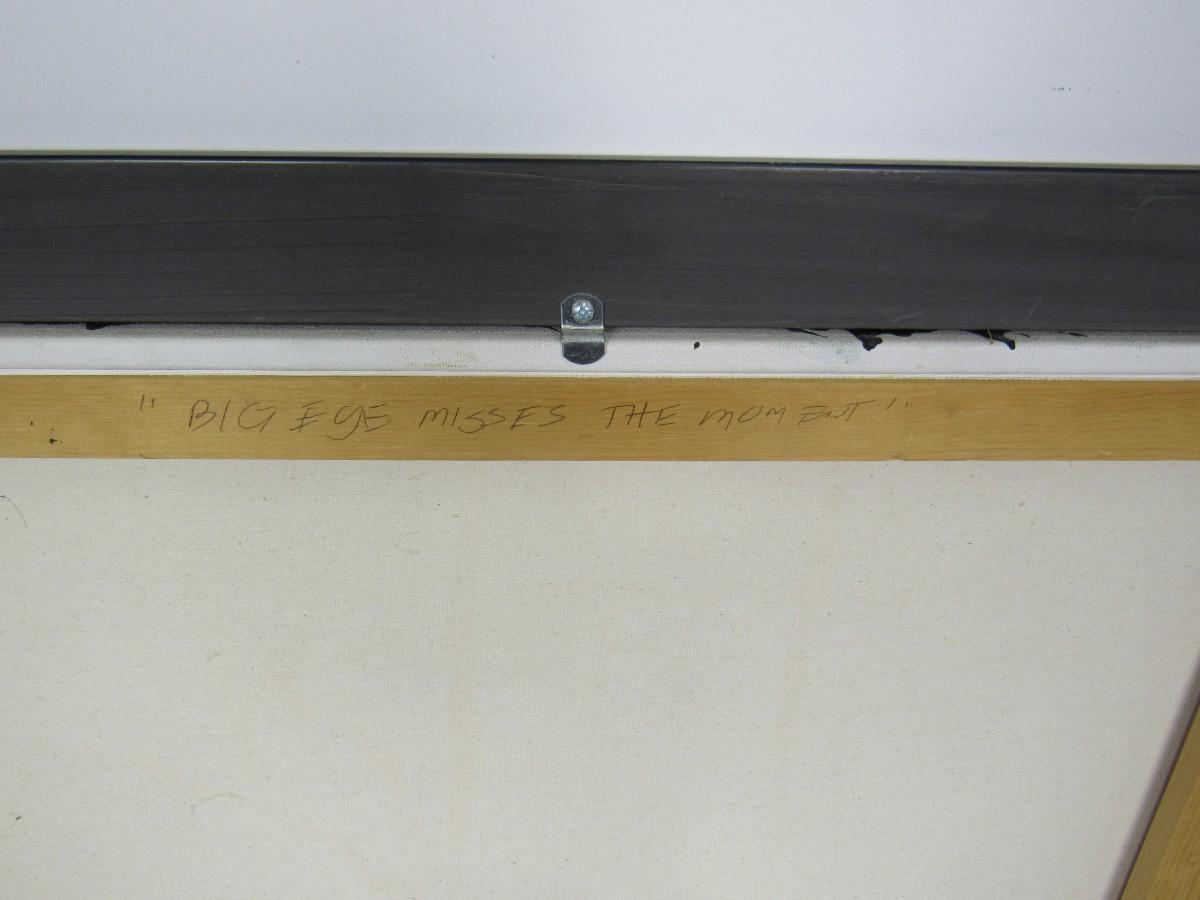 Original painting on canvas, signed by the artist on the back. Titled "Big Eye Misses the Moment". Excellent condition. Custom framed. 28" x 41". Canvas: 24" x 36".