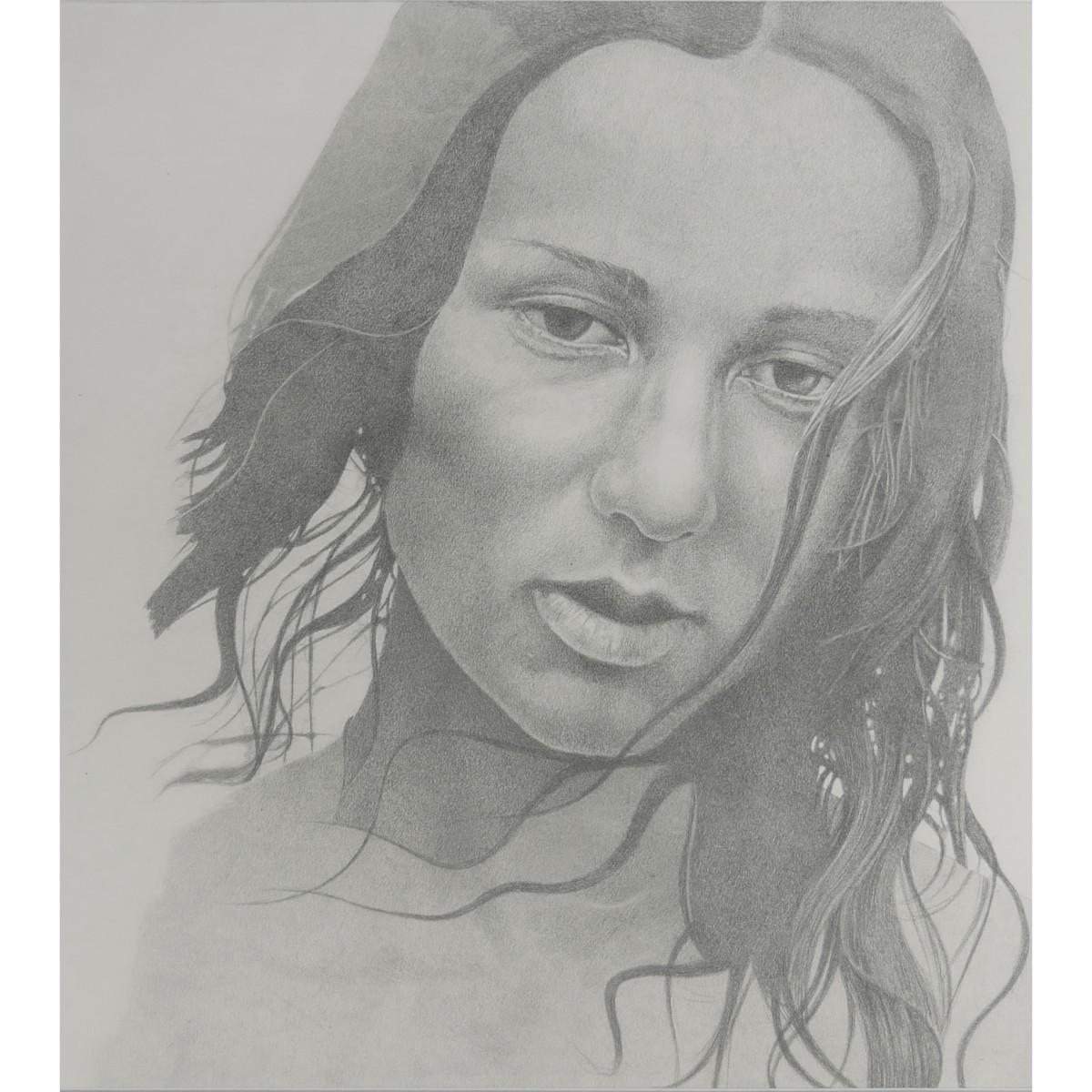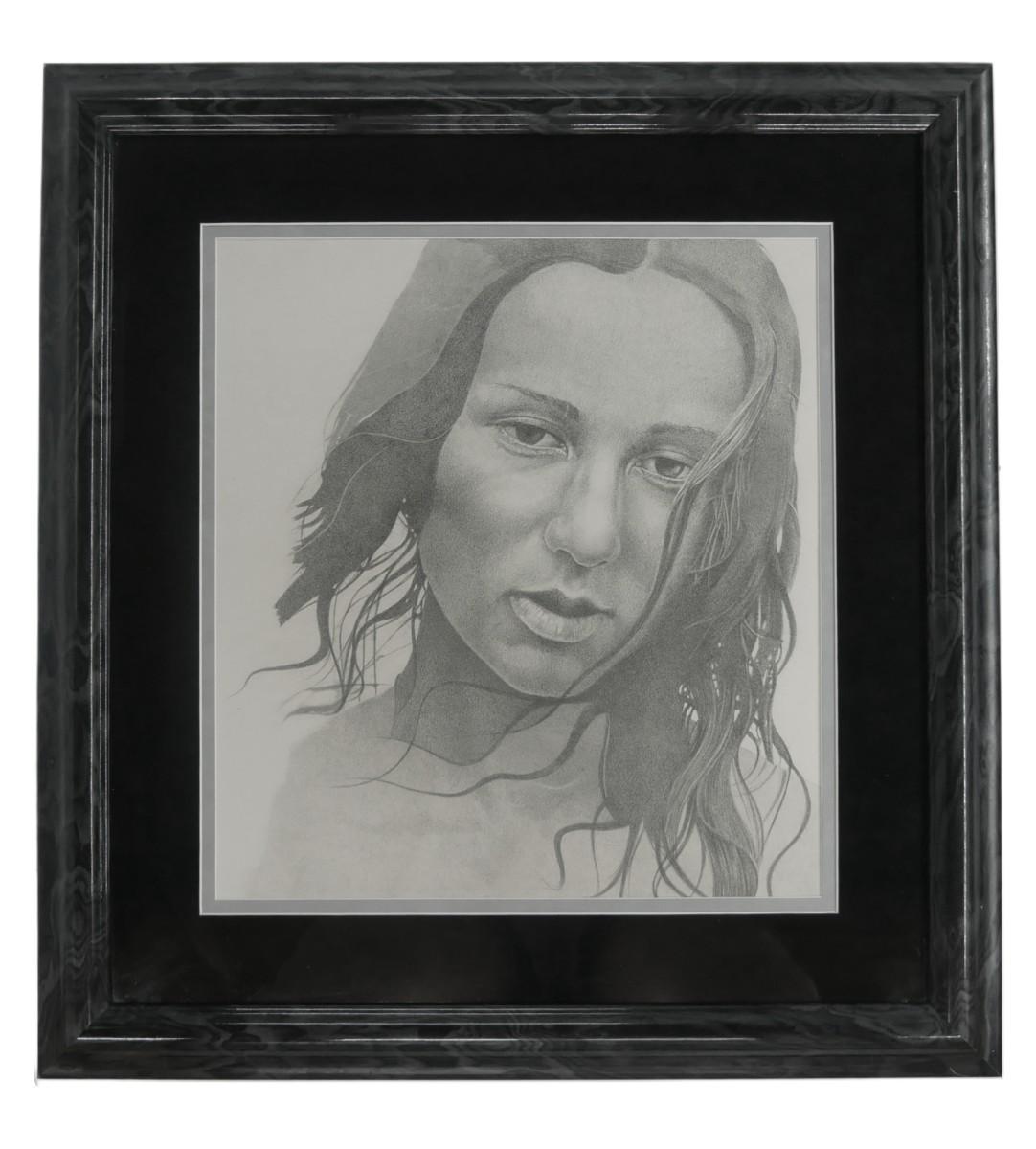 Original pencil portrait of young woman, artist is unknown. Piece is framed and matted. Art is in excellent condition, frame needs new paper backing. Art measures 16" x 17", total frame measures 25.5" x 27" x 1". (A33)