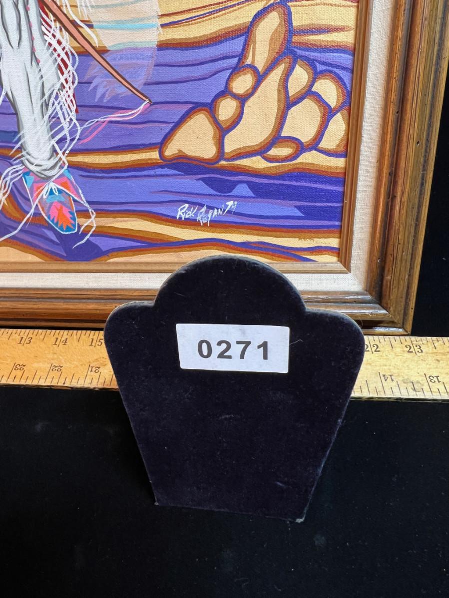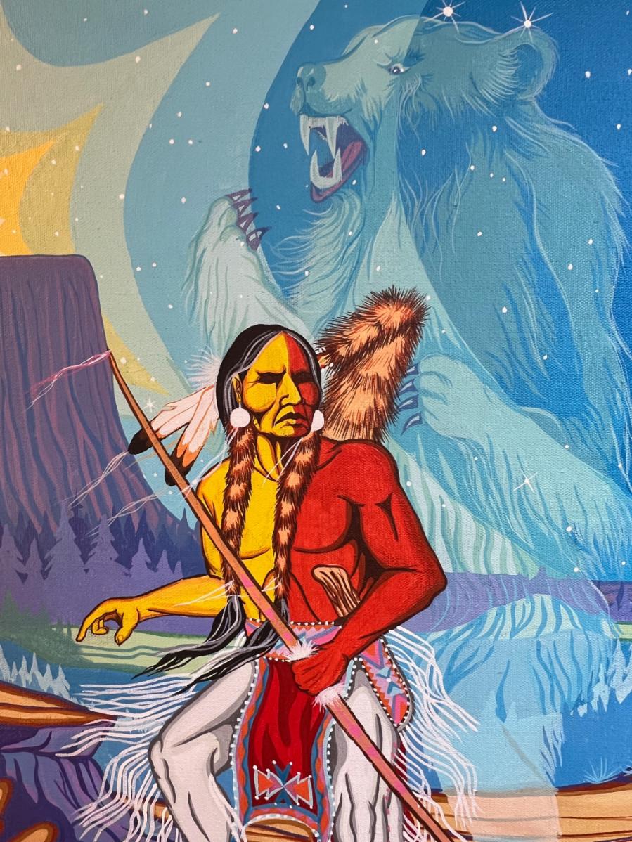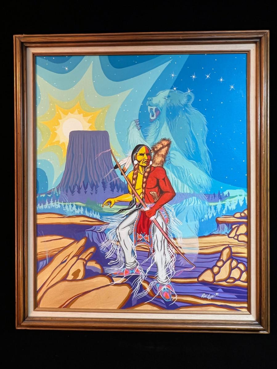 DESCRIPTION: The subject item is an original painting by noted Native American artist and actor, Rick Regan aka Ricky Lee. This talented artist has beautifully rendered a dream-like landscape featuring a Native American hunter armed with a bow looking over his shoulder as the star-studded image of a grizzly bear looms in the sky behind him.