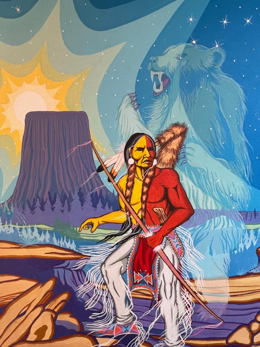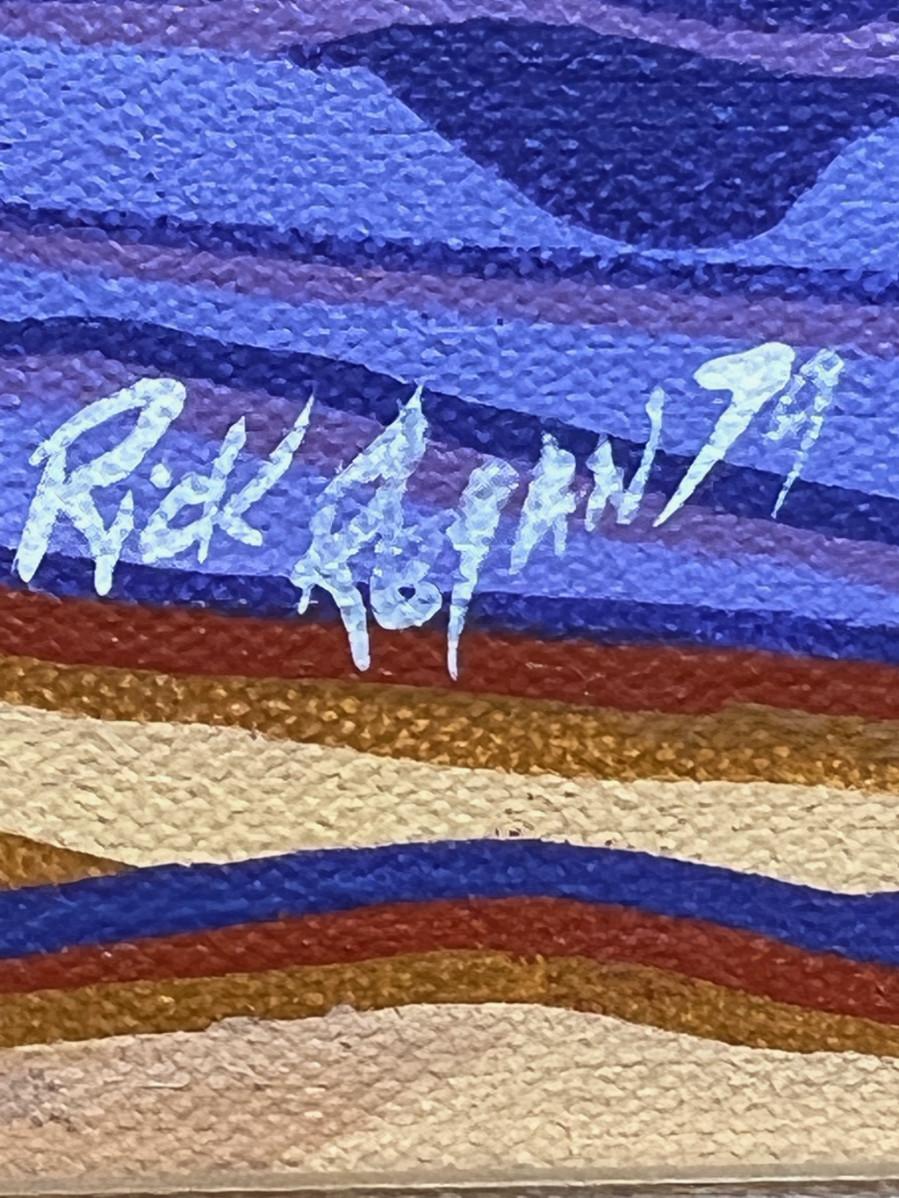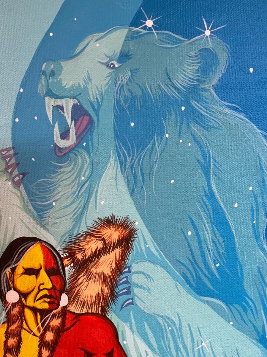 DESCRIPTION: The subject item is an original painting by noted Native American artist and actor, Rick Regan aka Ricky Lee. This talented artist has beautifully rendered a dream-like landscape featuring a Native American hunter armed with a bow looking over his shoulder as the star-studded image of a grizzly bear looms in the sky behind him.