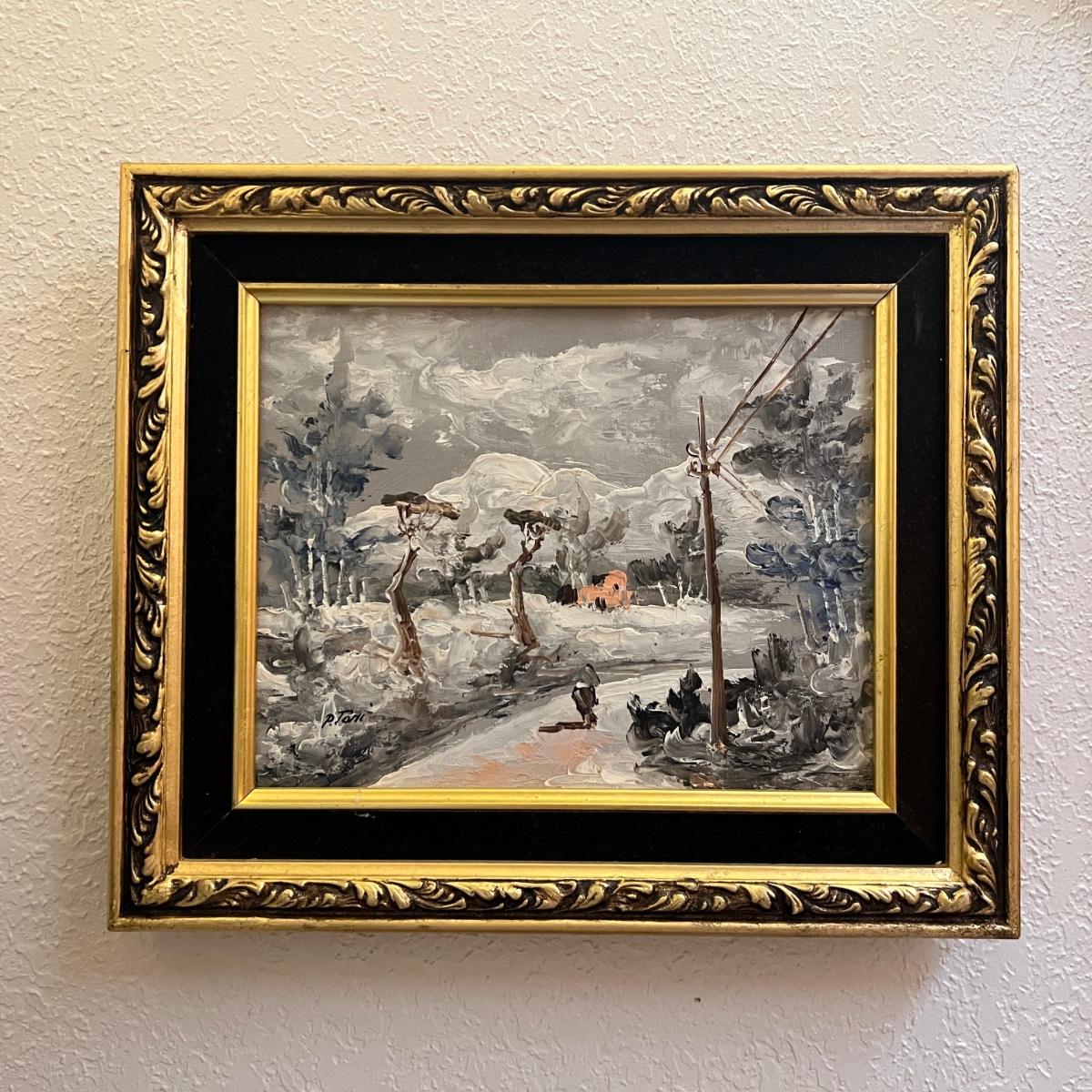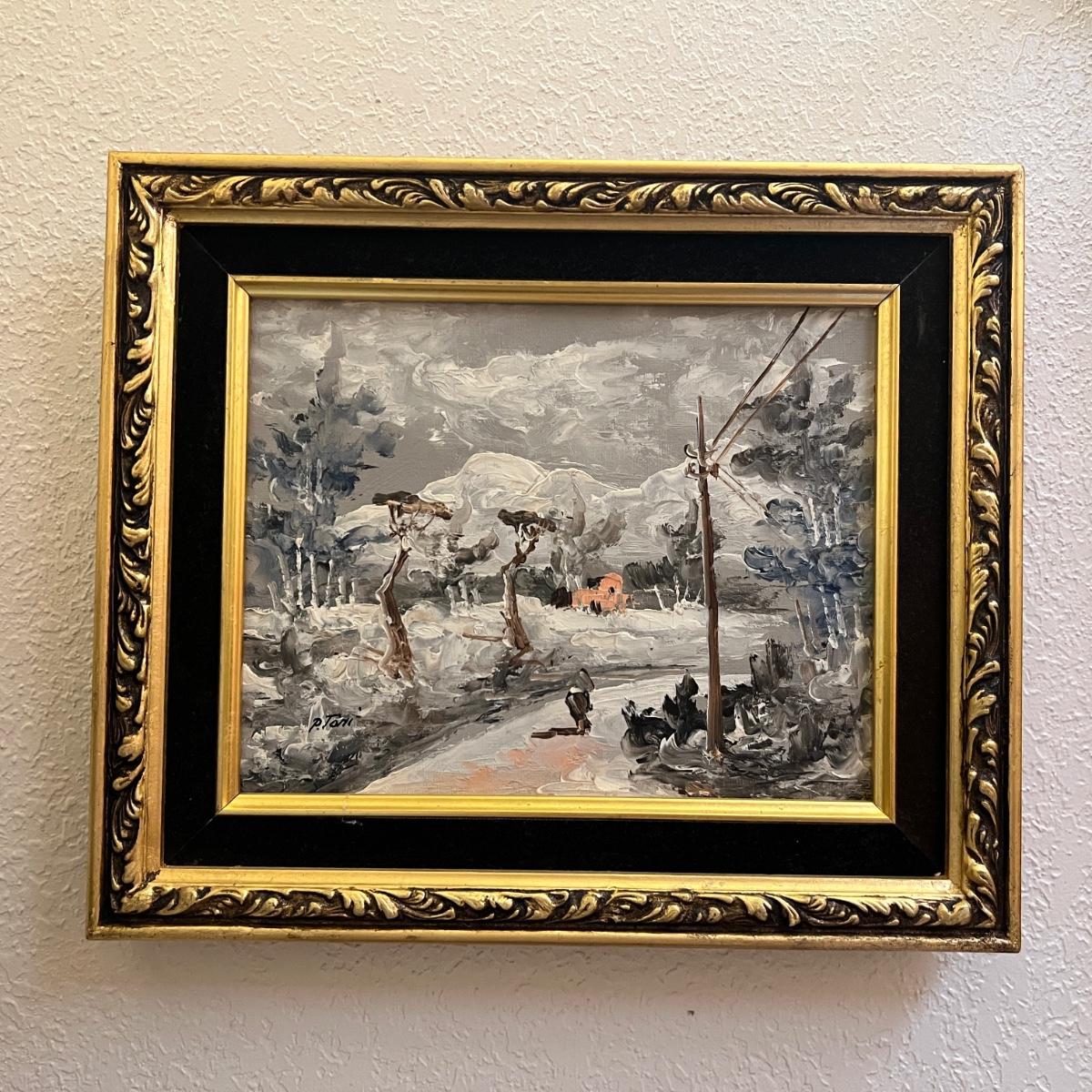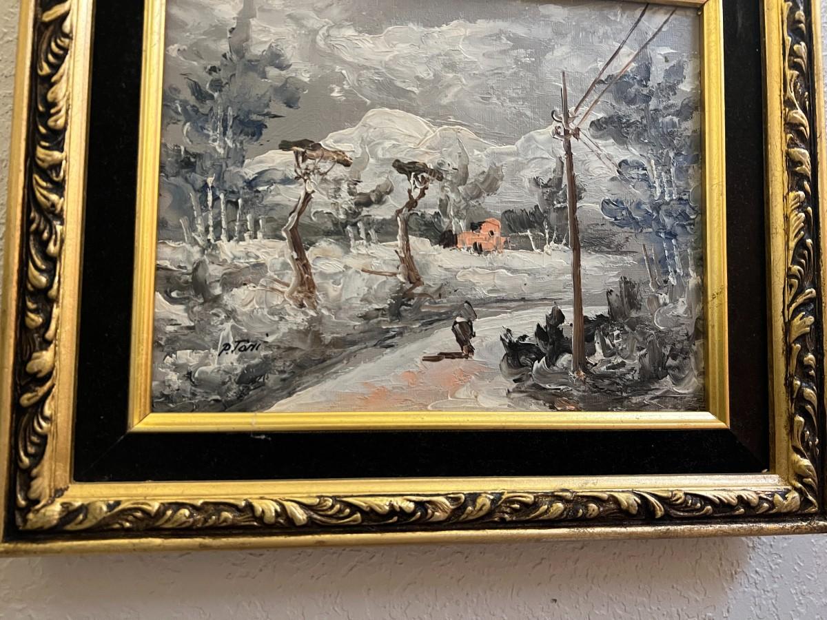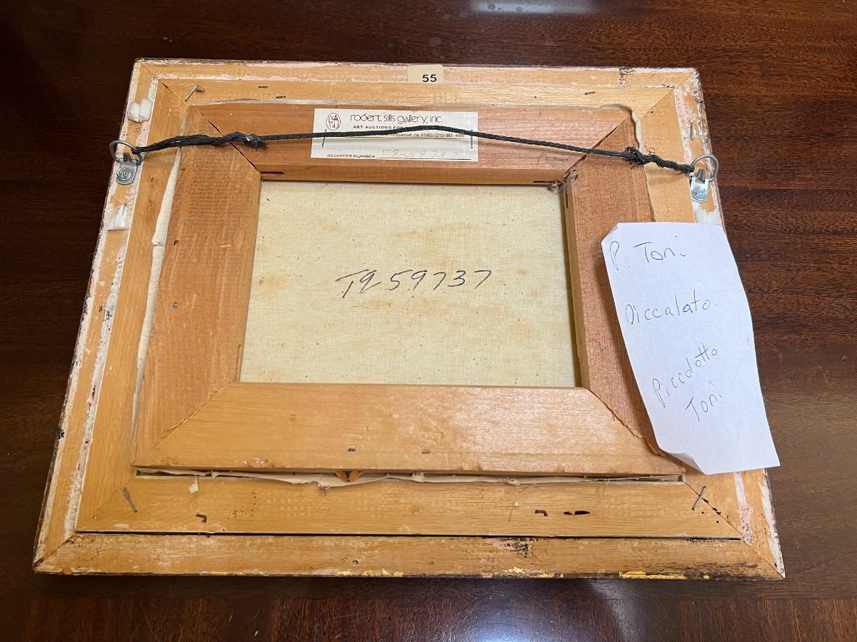 Original Signed Framed Painting Expressionist Scene of Figure Walking Down Road. Signed P. Toni (which note on the back of the painting attributes to Toni Piccolotto 1903-1970, this is not verified). Potentially a plein air piece. Further provenance information on the back indicates this art was acquired at a fundraising auction in Hollywood, California at the Robert Sills Gallery, Inc. In good condition, as shown.
