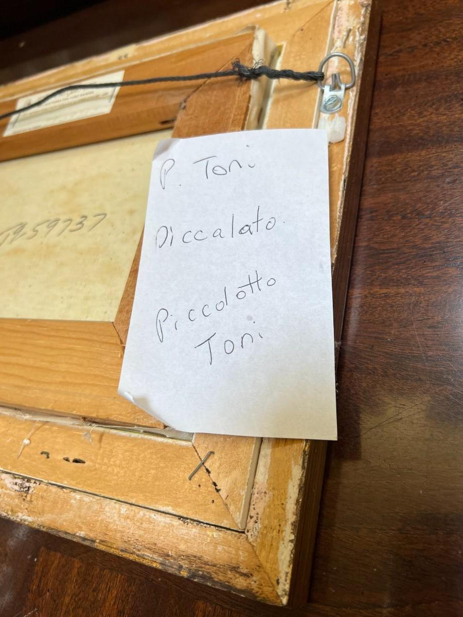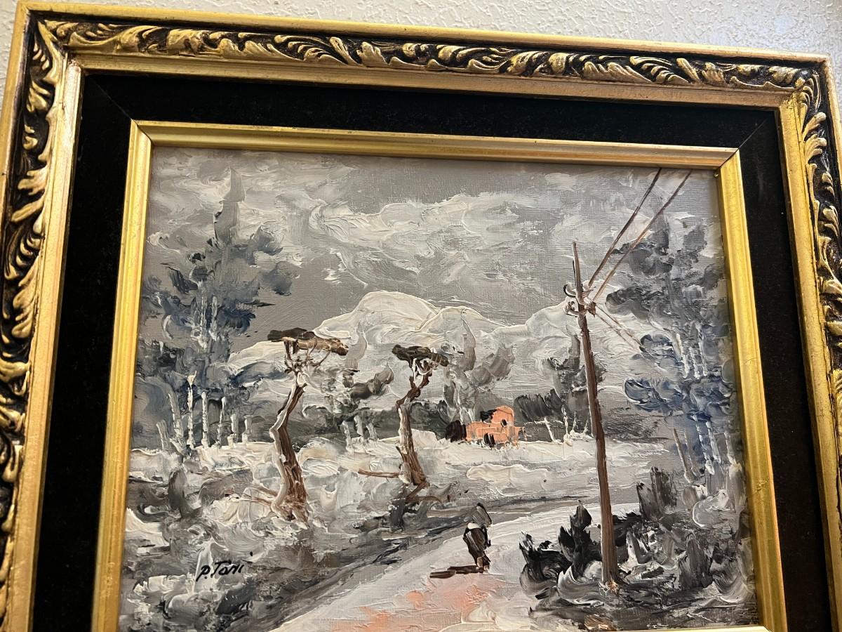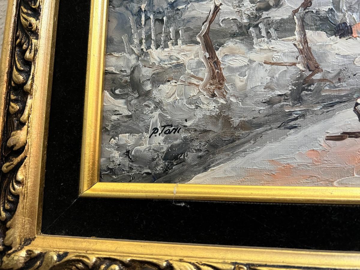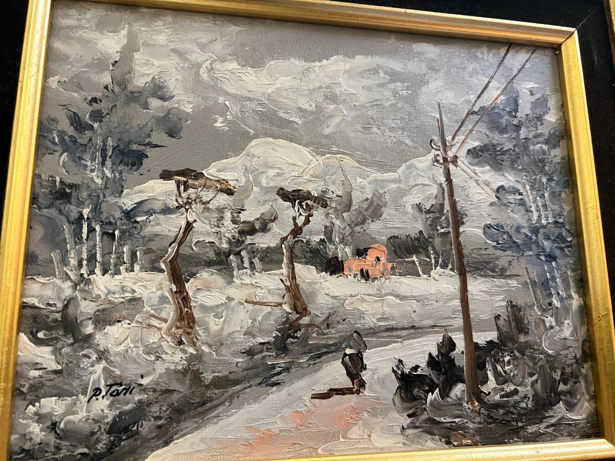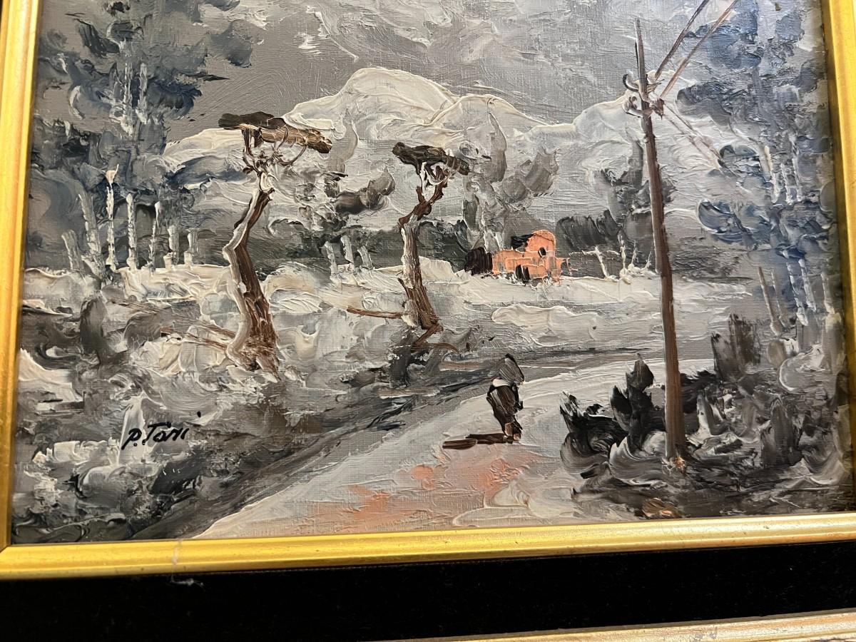 Original Signed Framed Painting Expressionist Scene of Figure Walking Down Road. Signed P. Toni (which note on the back of the painting attributes to Toni Piccolotto 1903-1970, this is not verified). Potentially a plein air piece. Further provenance information on the back indicates this art was acquired at a fundraising auction in Hollywood, California at the Robert Sills Gallery, Inc. In good condition, as shown.