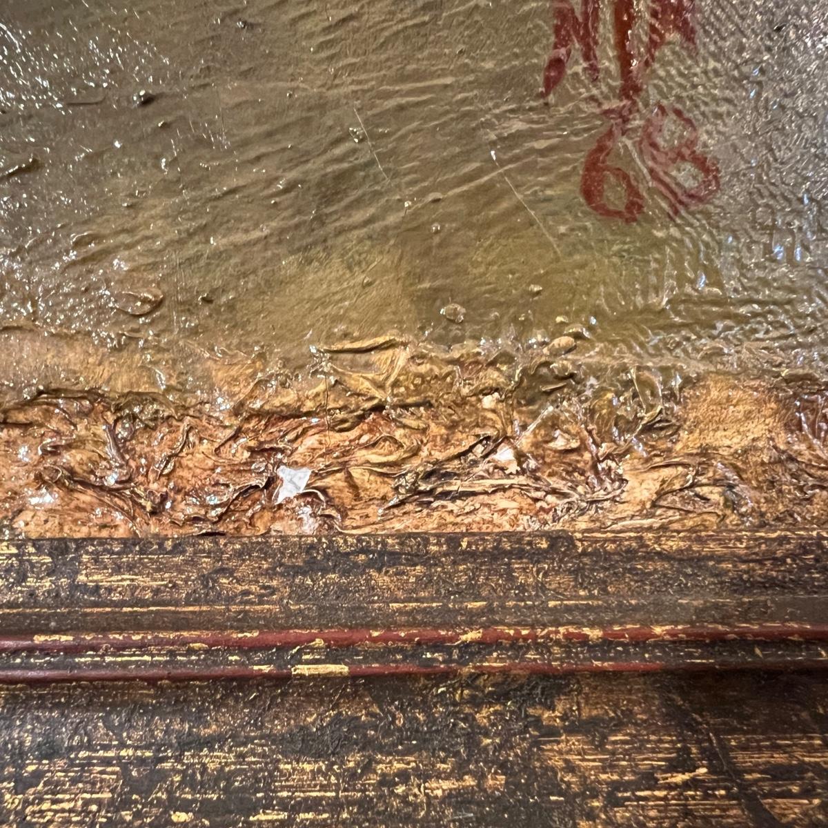 Original Signed Mid Century Painting of Red Barn. Dated 1968. Really great piece of 1960s art! In good condition, with some small areas of paint cracking and a chip (shown in photos).