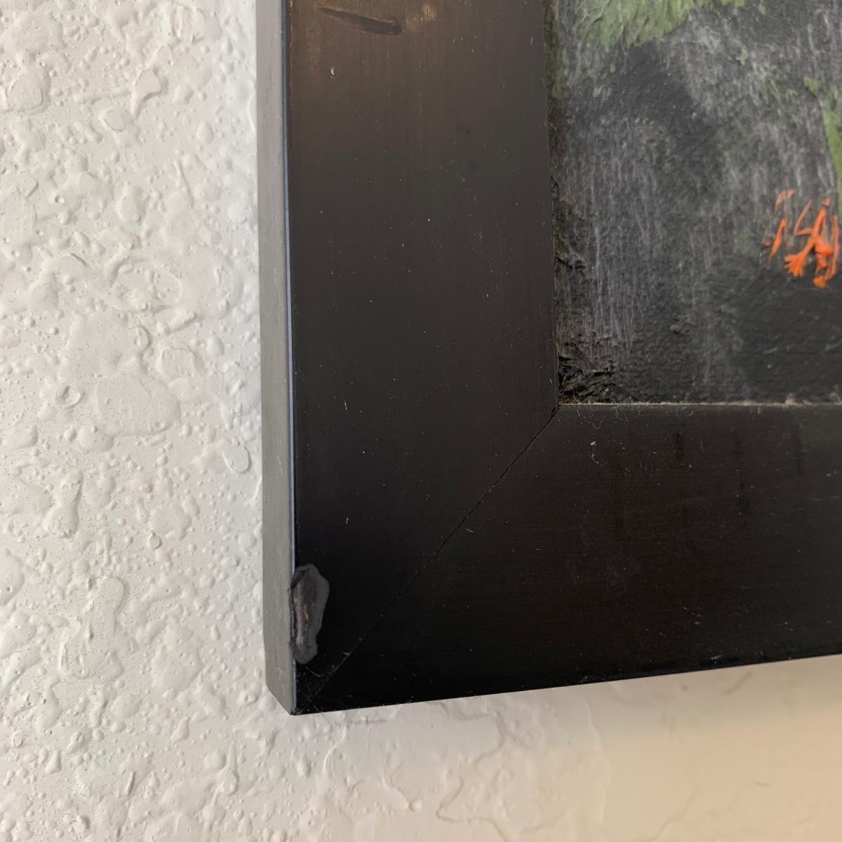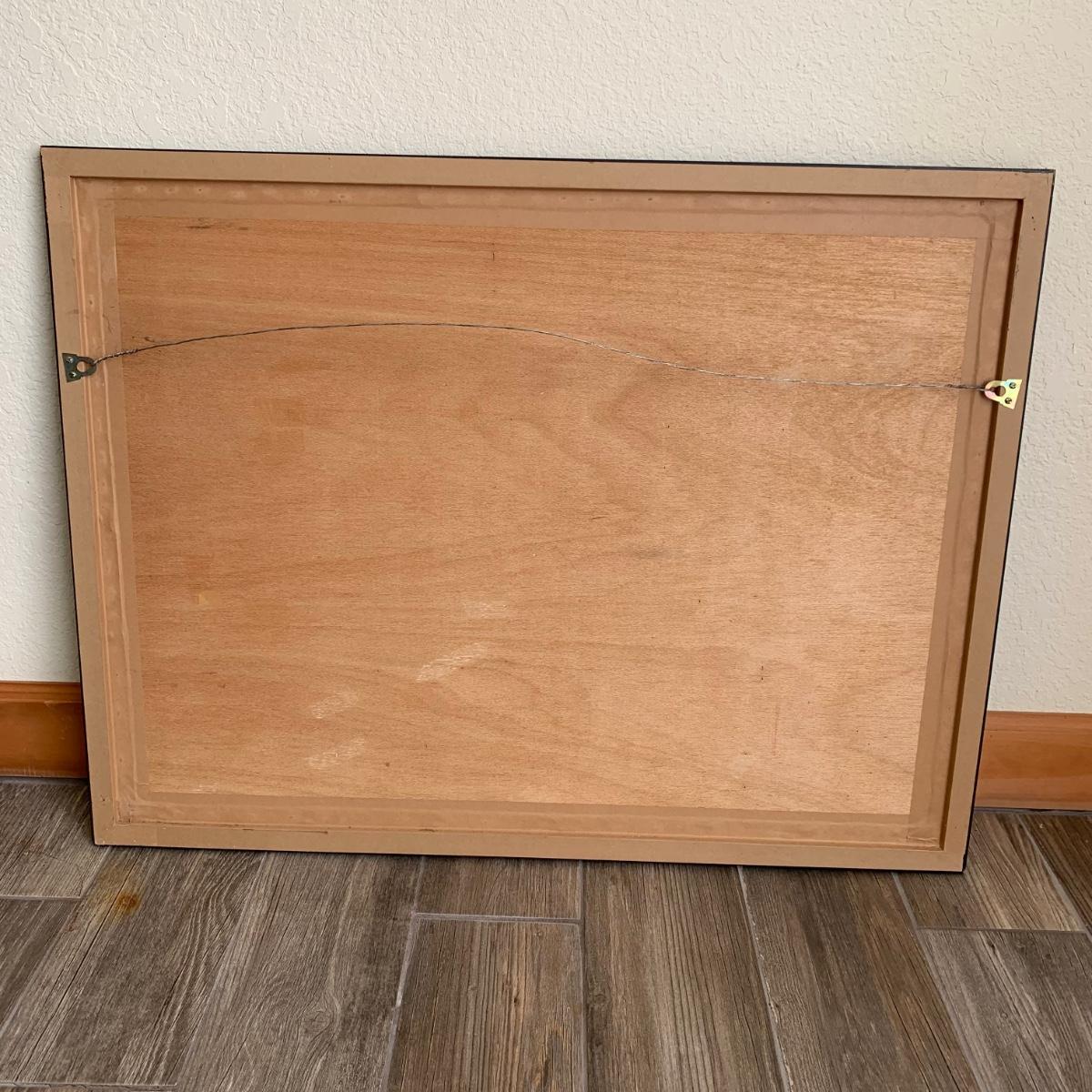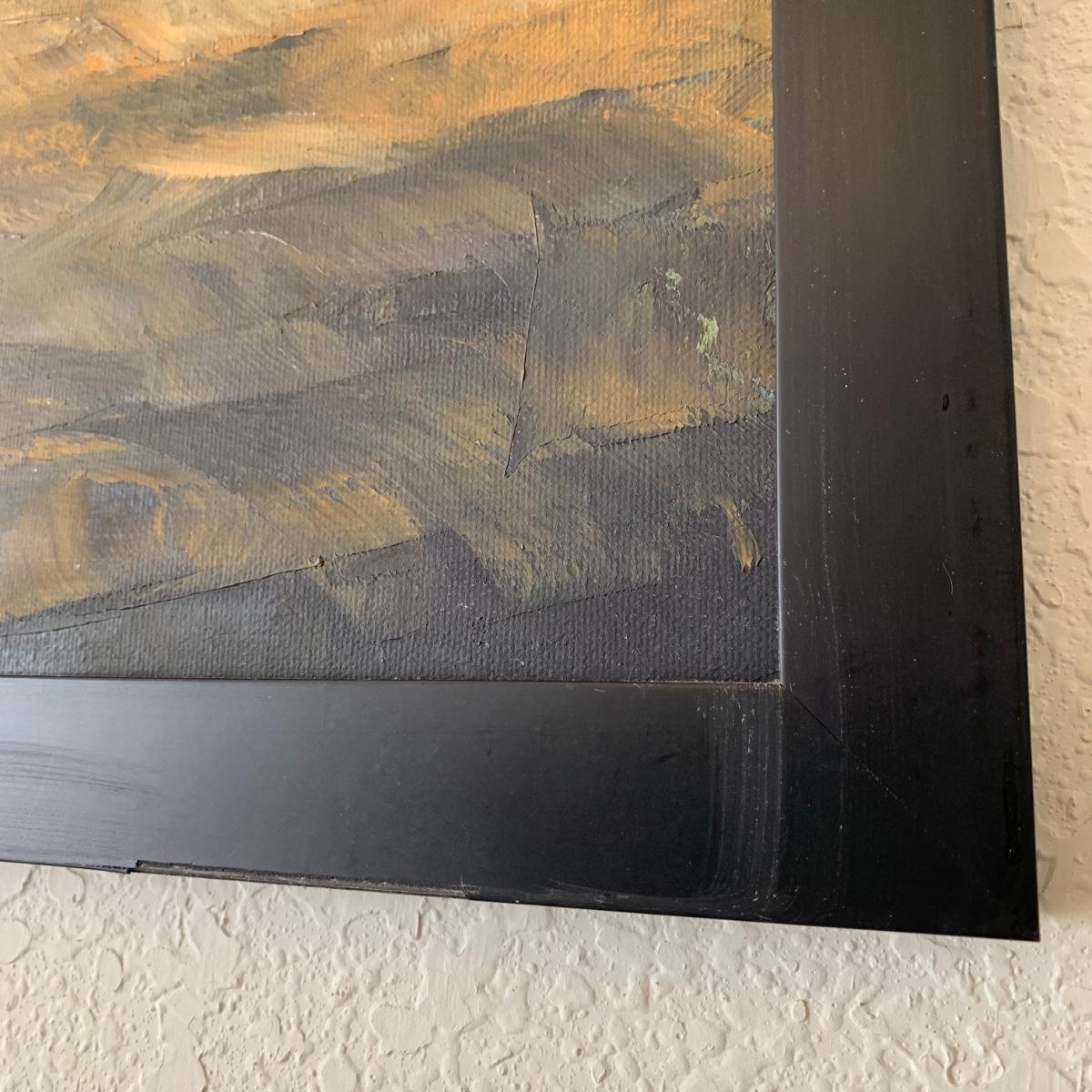 Original painting, signed by the artist. Signature appears to say Lacey as last name. Medium appears to be oil on canvas. Painting is framed in a black frame that has a smooth plastic feel. Frame measures 33.25” x 25.5”. A few chips are seen on the frame. Metal hardware is attached to the back for hanging the painting.