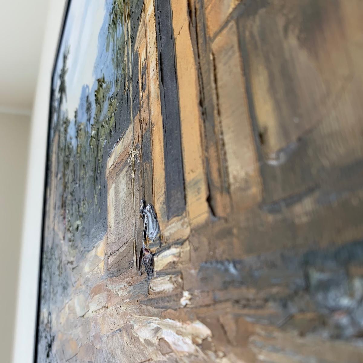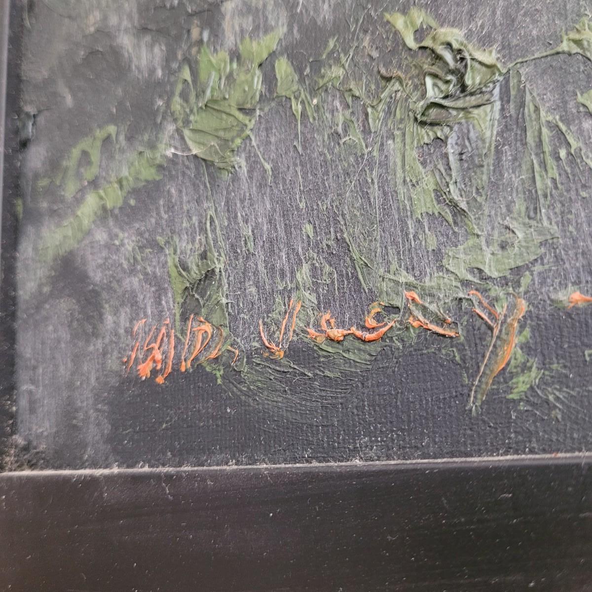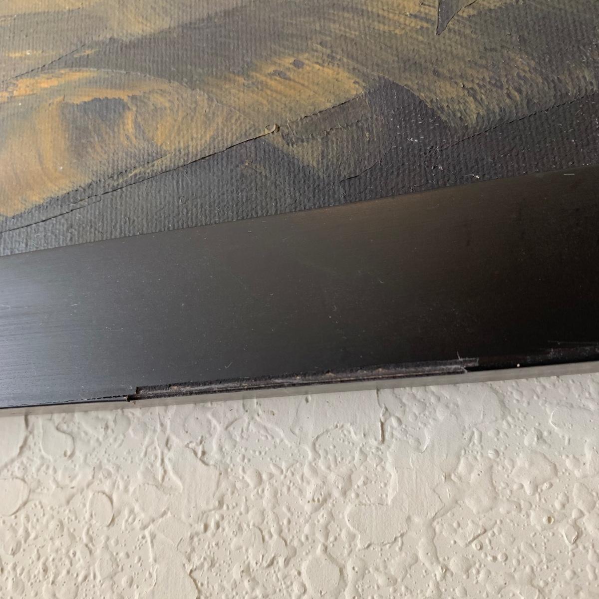 Original painting, signed by the artist. Signature appears to say Lacey as last name. Medium appears to be oil on canvas. Painting is framed in a black frame that has a smooth plastic feel. Frame measures 33.25” x 25.5”. A few chips are seen on the frame. Metal hardware is attached to the back for hanging the painting.