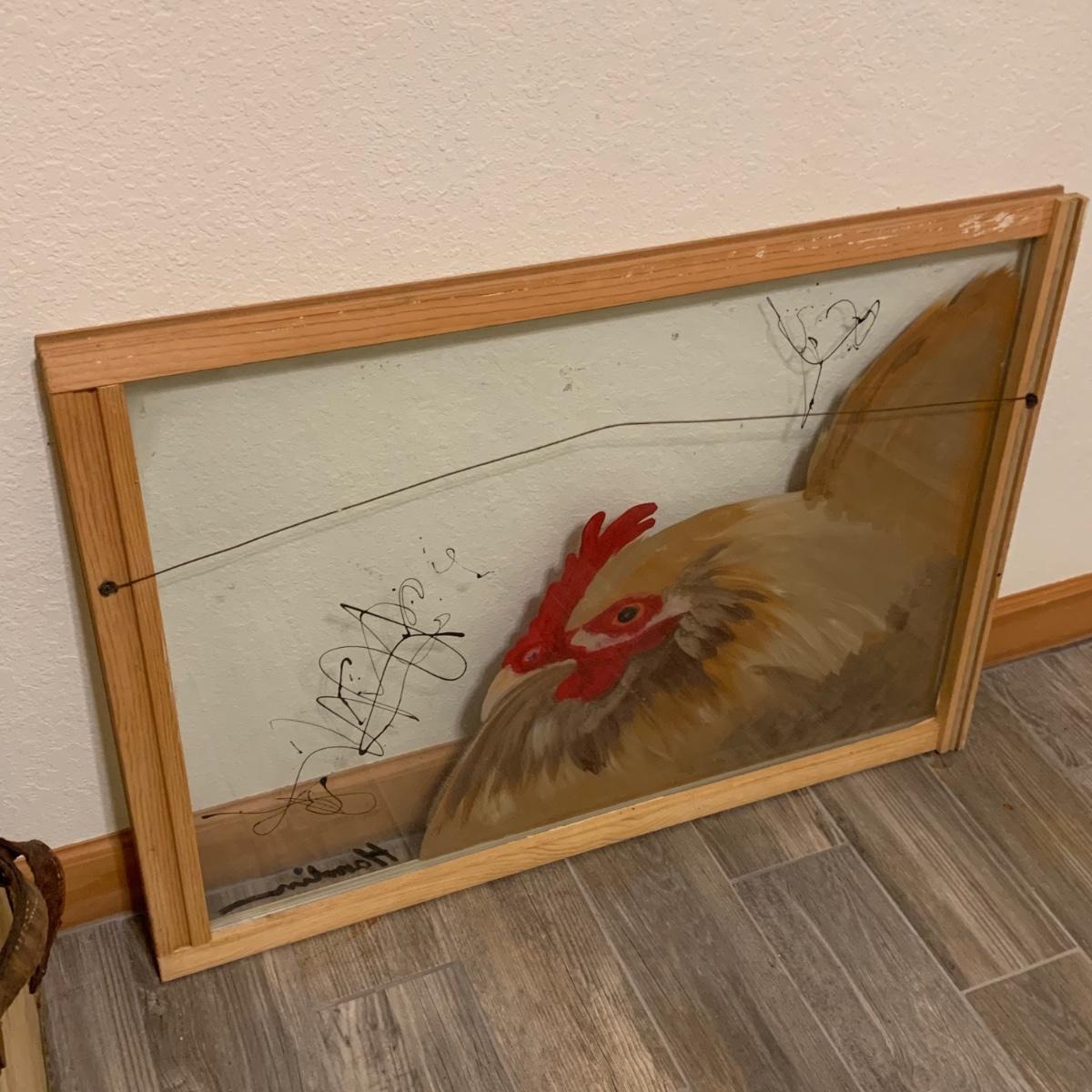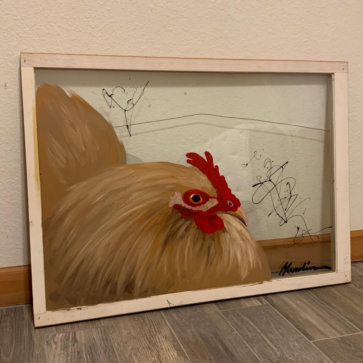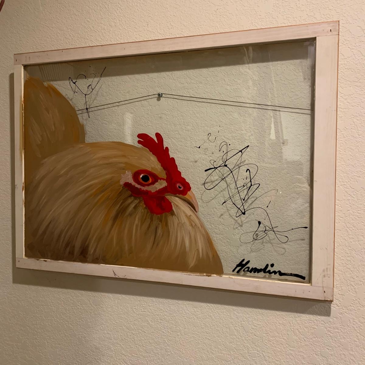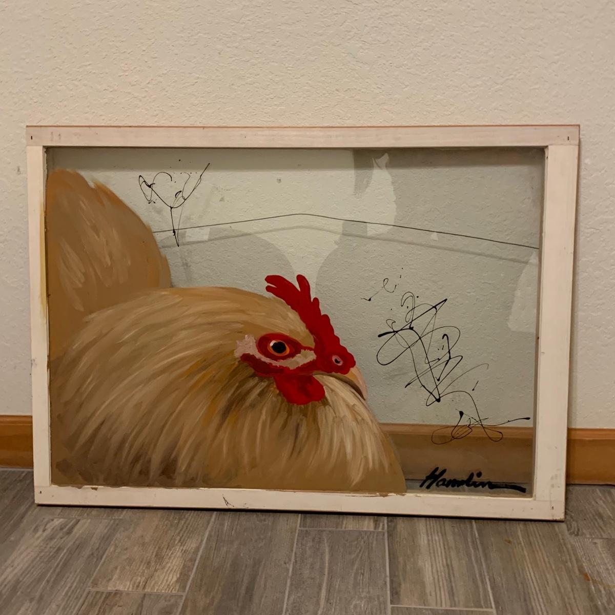 Original painting of a chicken on a glass window pane in a wood frame. Art is signed by what appears to read “Hamlin”. Frame measures 37” x 26.5”. A wire is attached to the back for hanging.