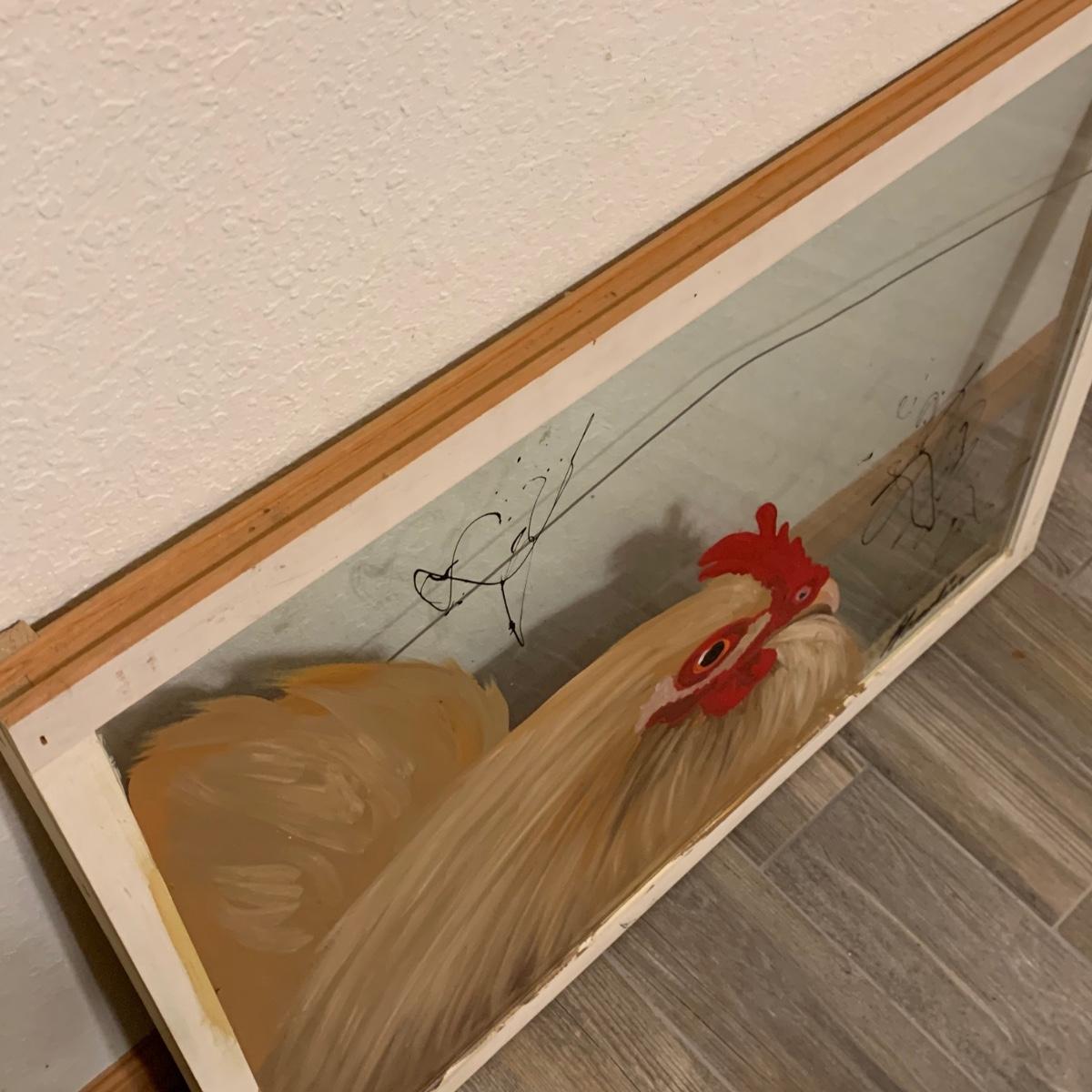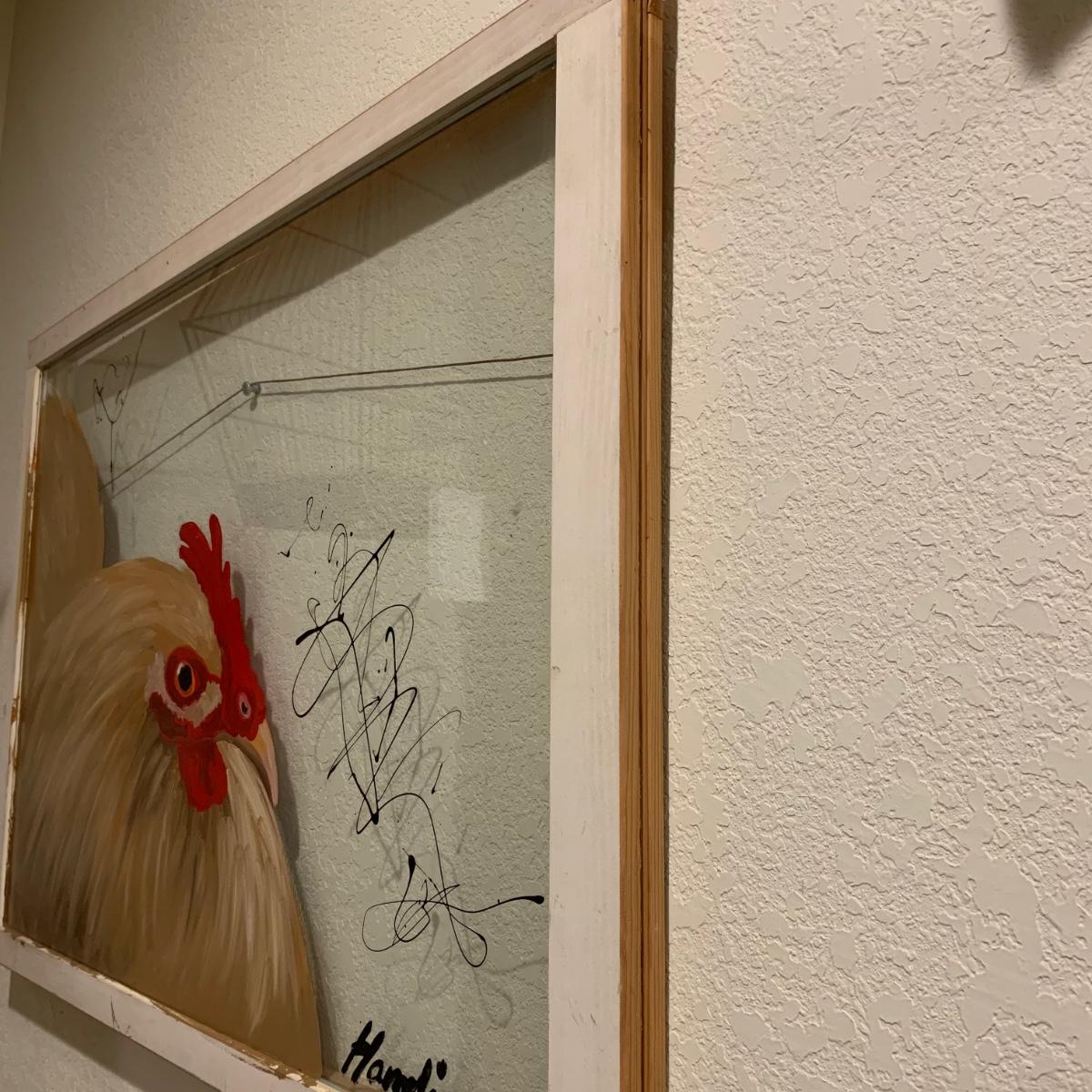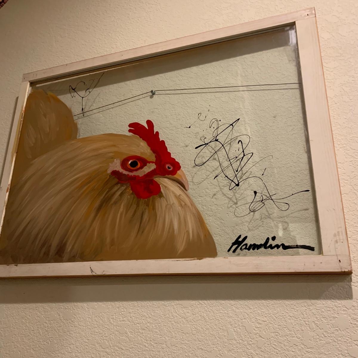 Original painting of a chicken on a glass window pane in a wood frame. Art is signed by what appears to read “Hamlin”. Frame measures 37” x 26.5”. A wire is attached to the back for hanging.