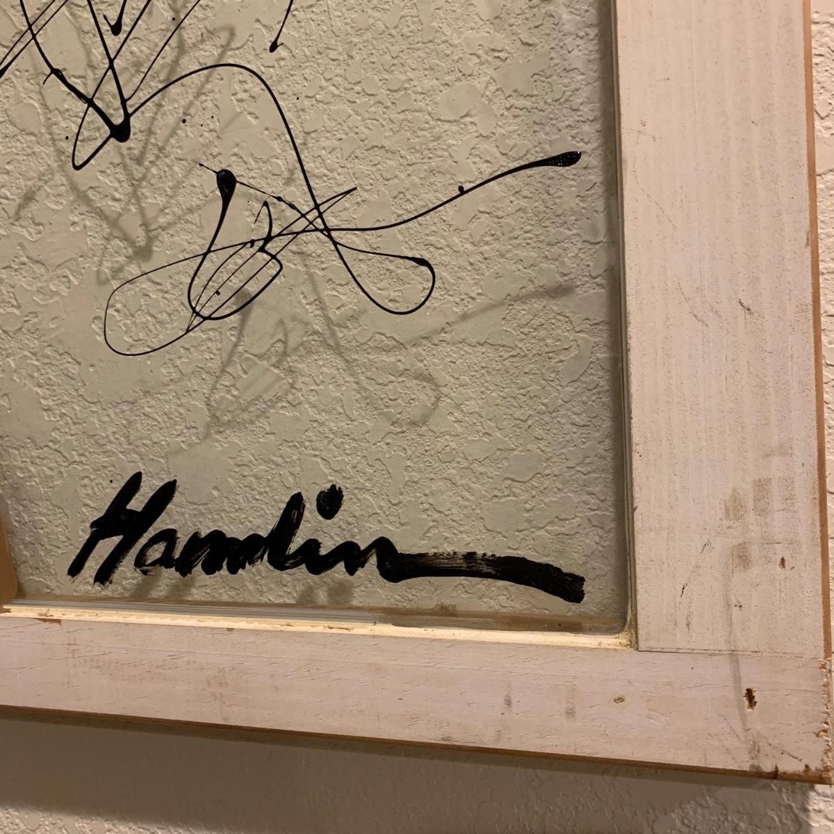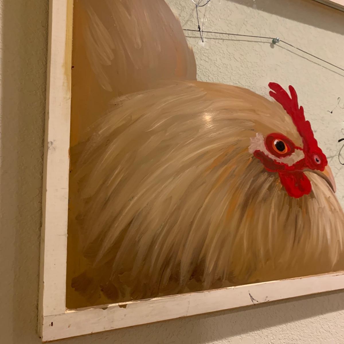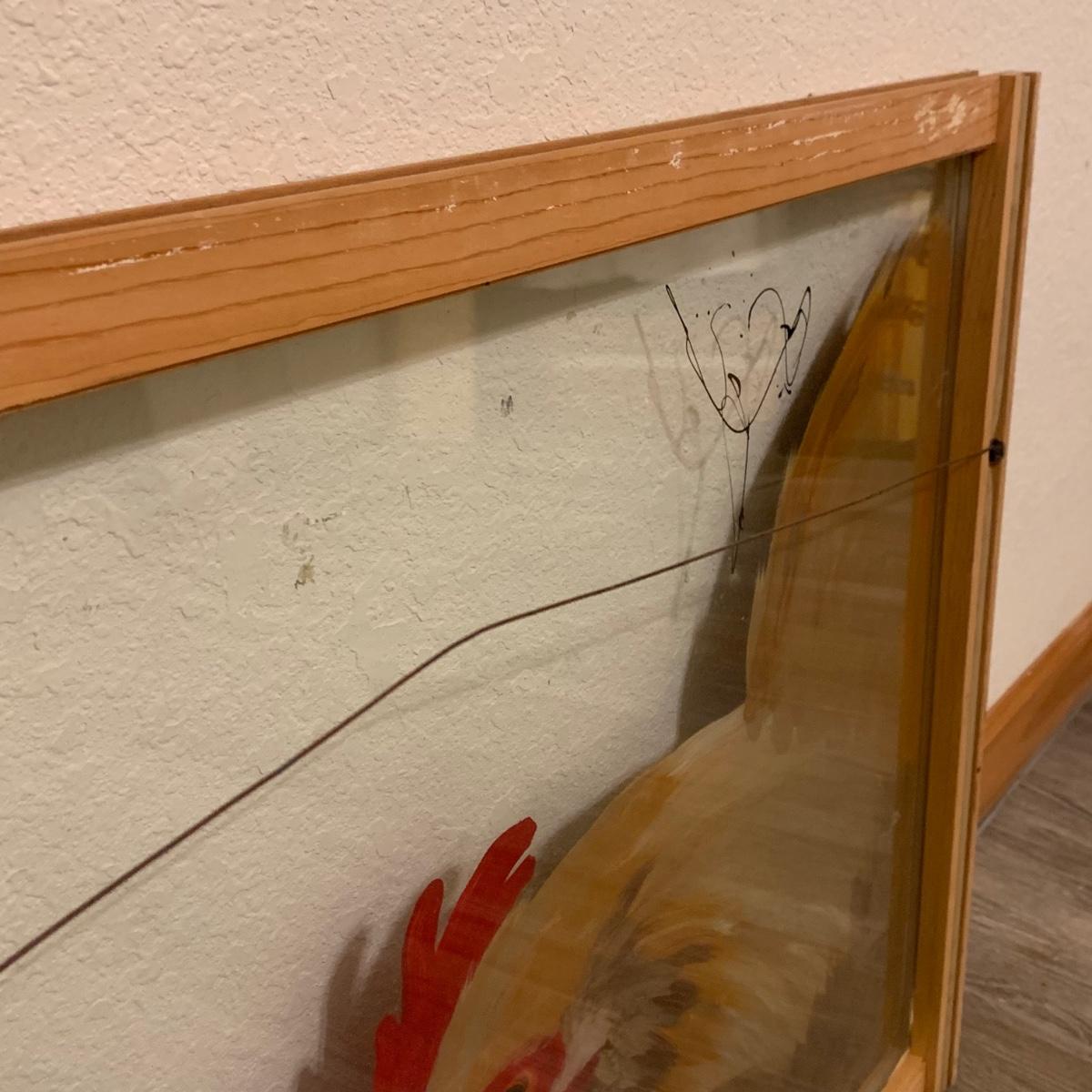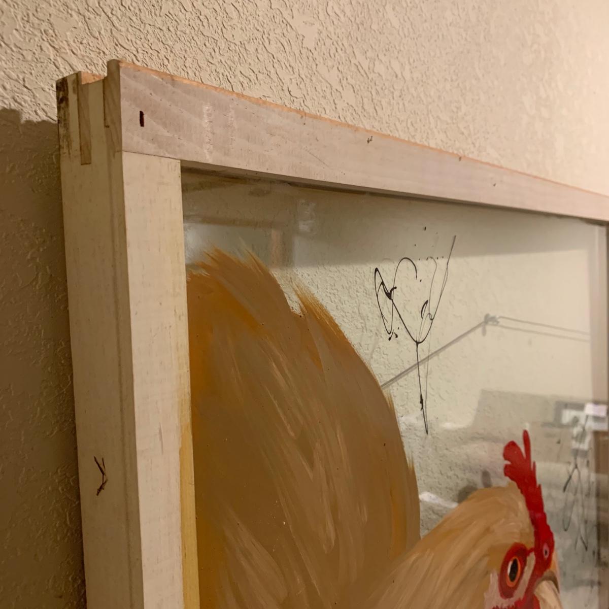 Original painting of a chicken on a glass window pane in a wood frame. Art is signed by what appears to read “Hamlin”. Frame measures 37” x 26.5”. A wire is attached to the back for hanging.