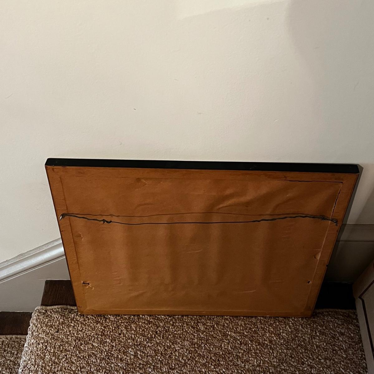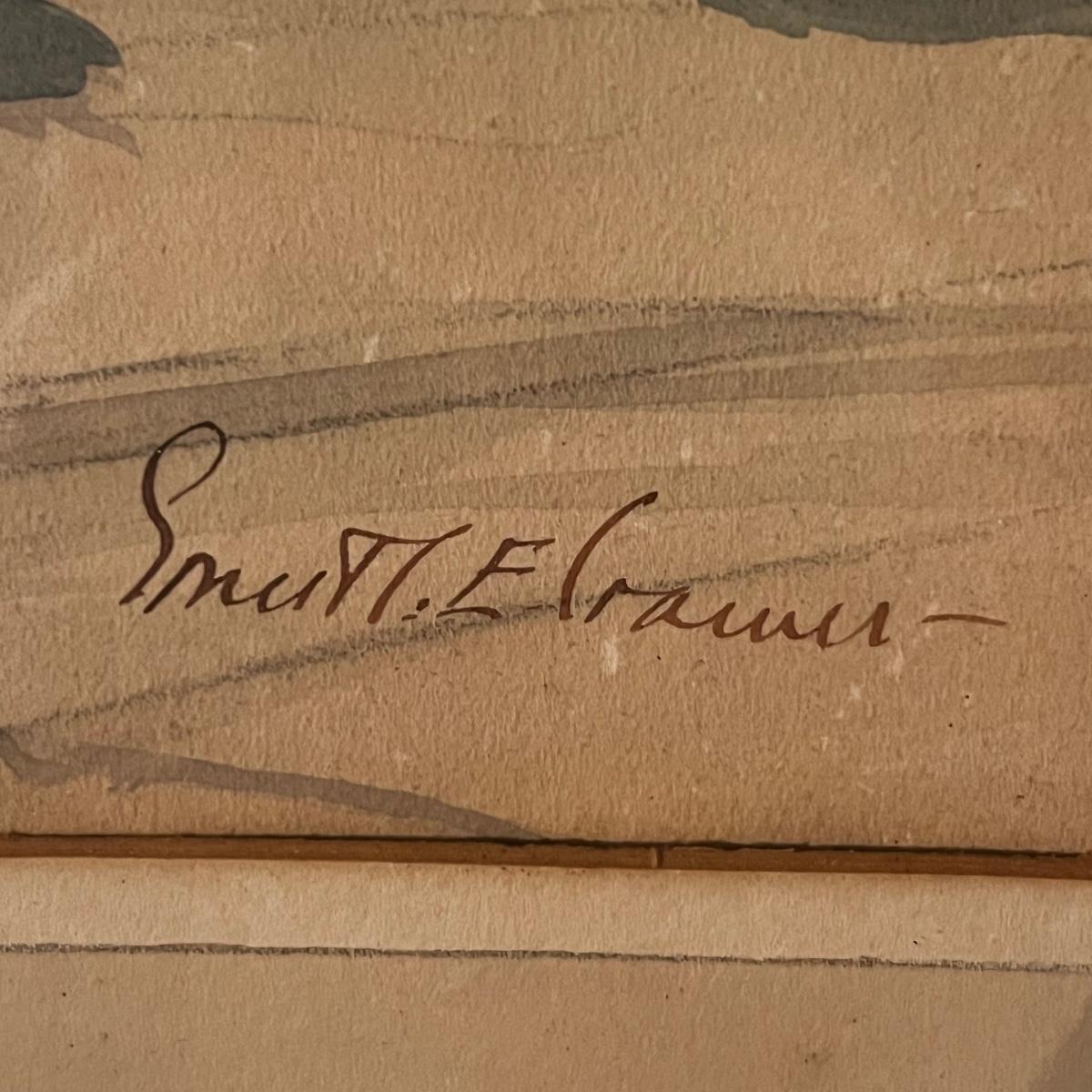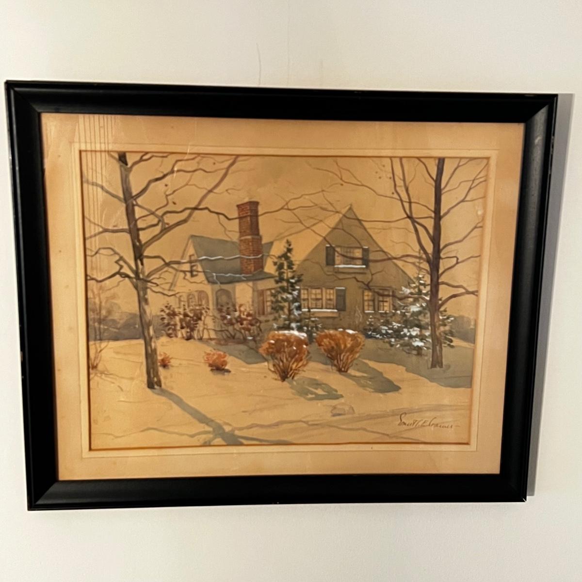 This watercolor appears to be an original but we cannot authenticate it. Painting is on a sepia colored paper with a simple and similar colored mat. Signature is indecipherable. Frame is a black wood that measures 18.5” x 15”H. Art is under glass.