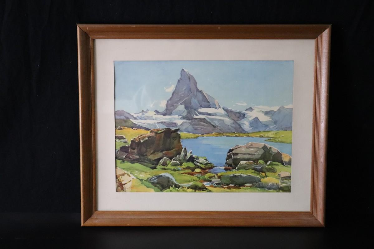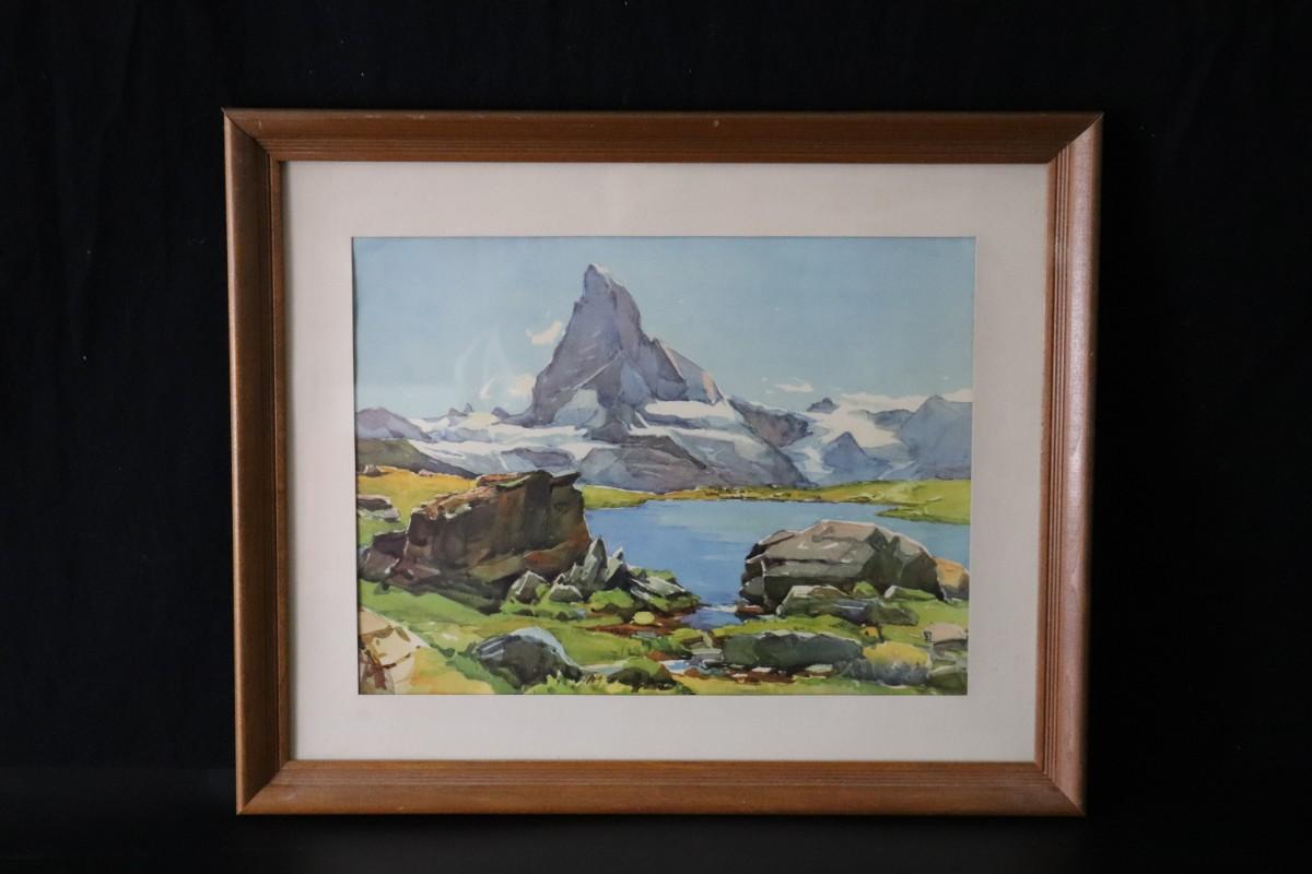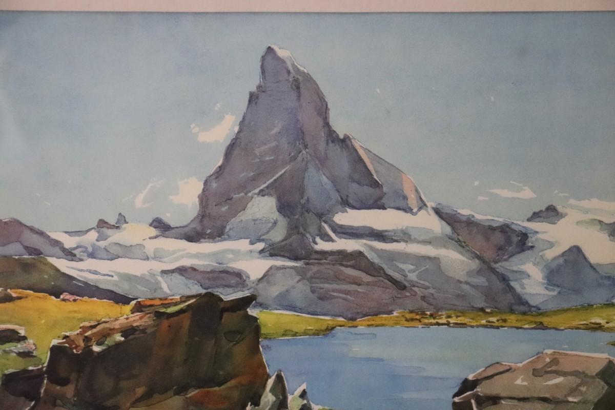 Original Signed Watercolor Painting of Matterhorn Mountain and Lake Scene. Partial Signature visible. In very good condition, as shown. From a private estate collection.