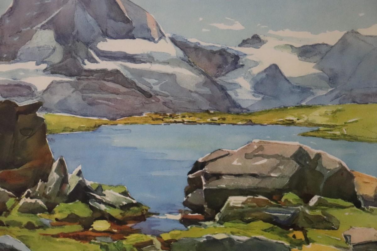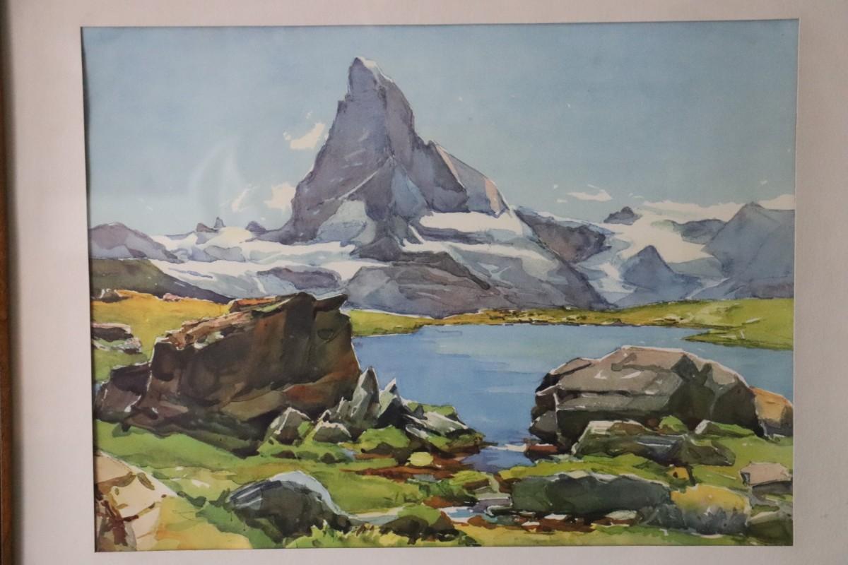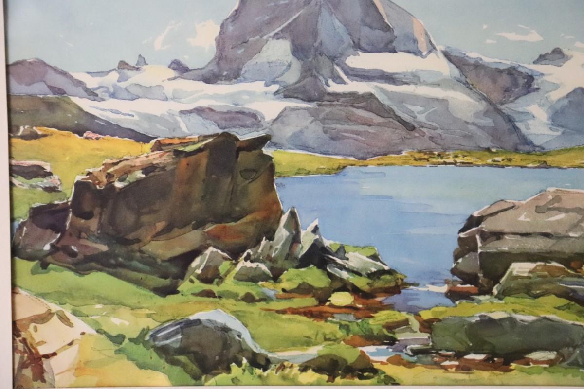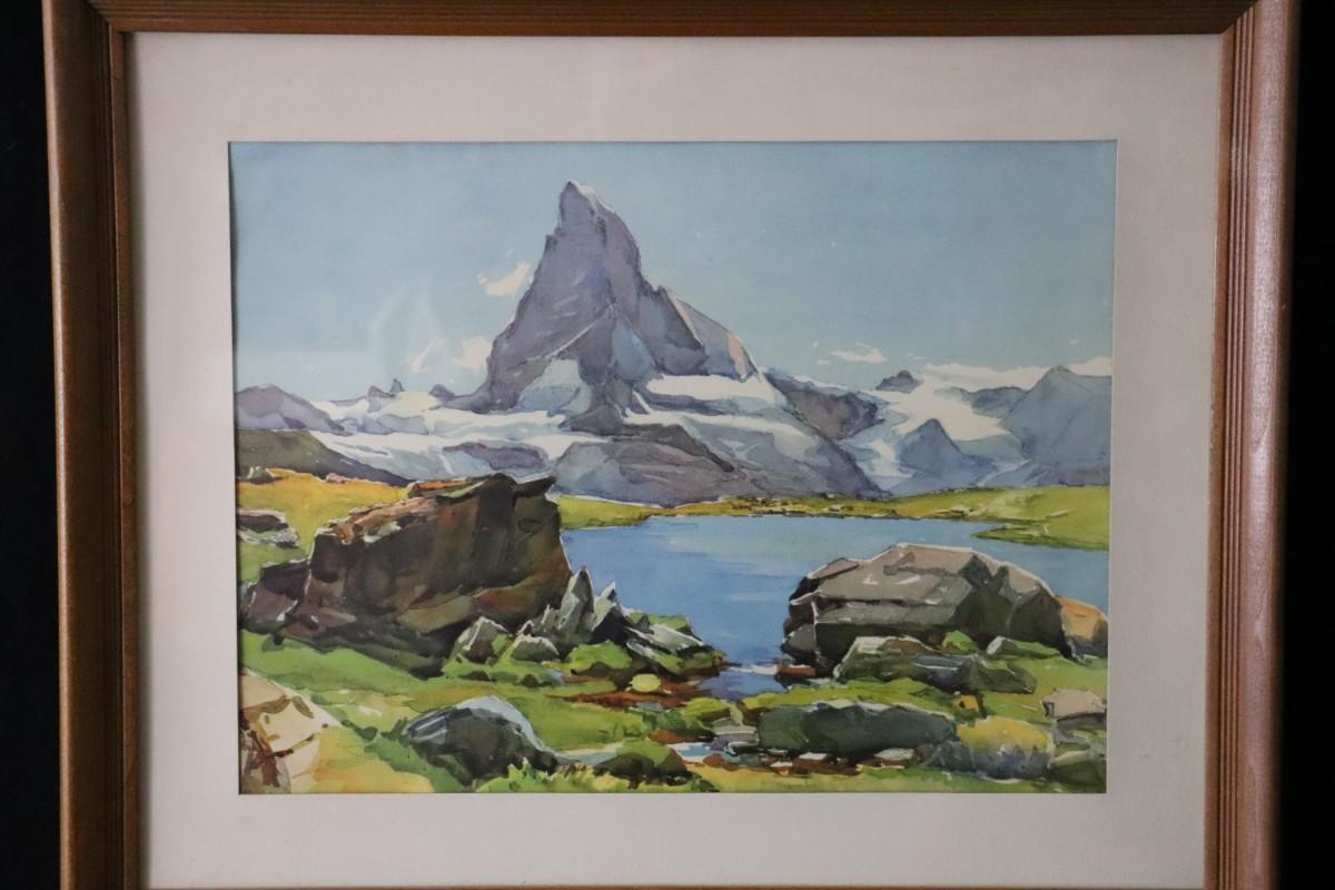 Original Signed Watercolor Painting of Matterhorn Mountain and Lake Scene. Partial Signature visible. In very good condition, as shown. From a private estate collection.