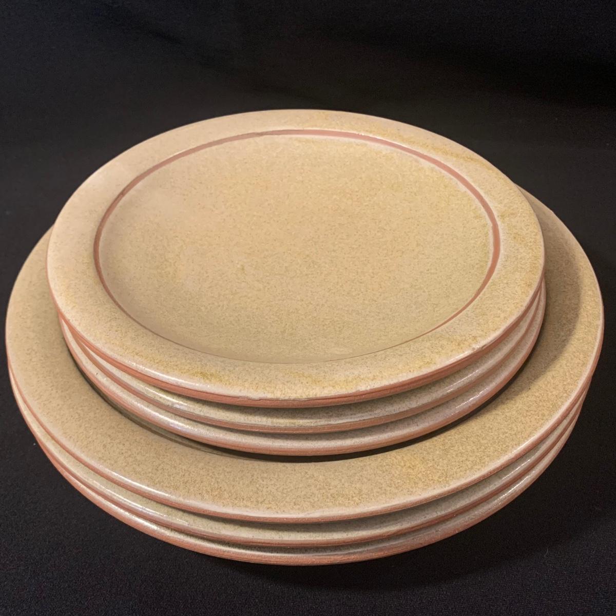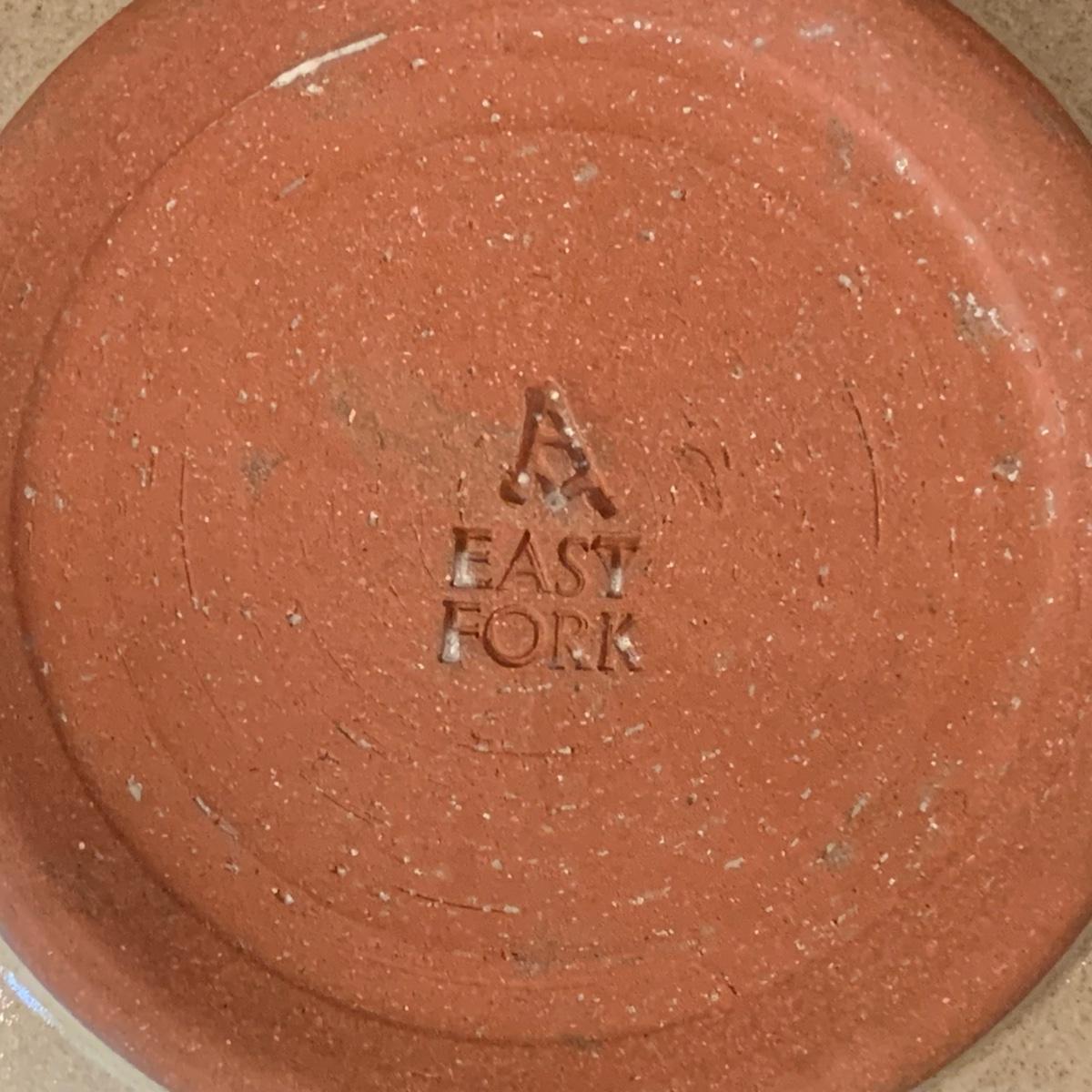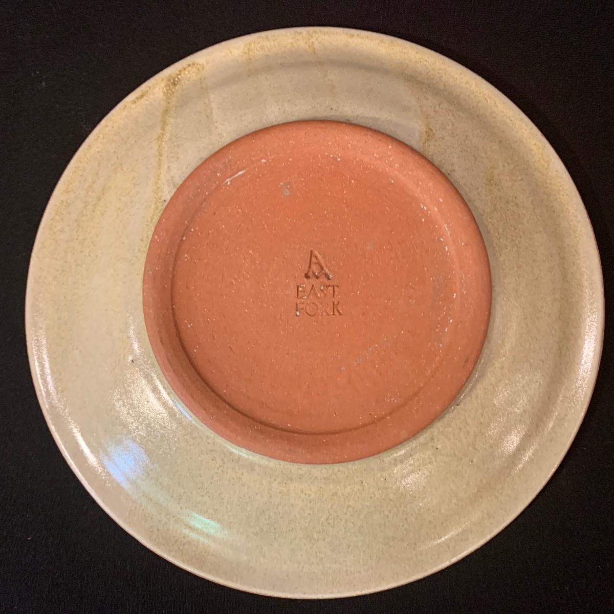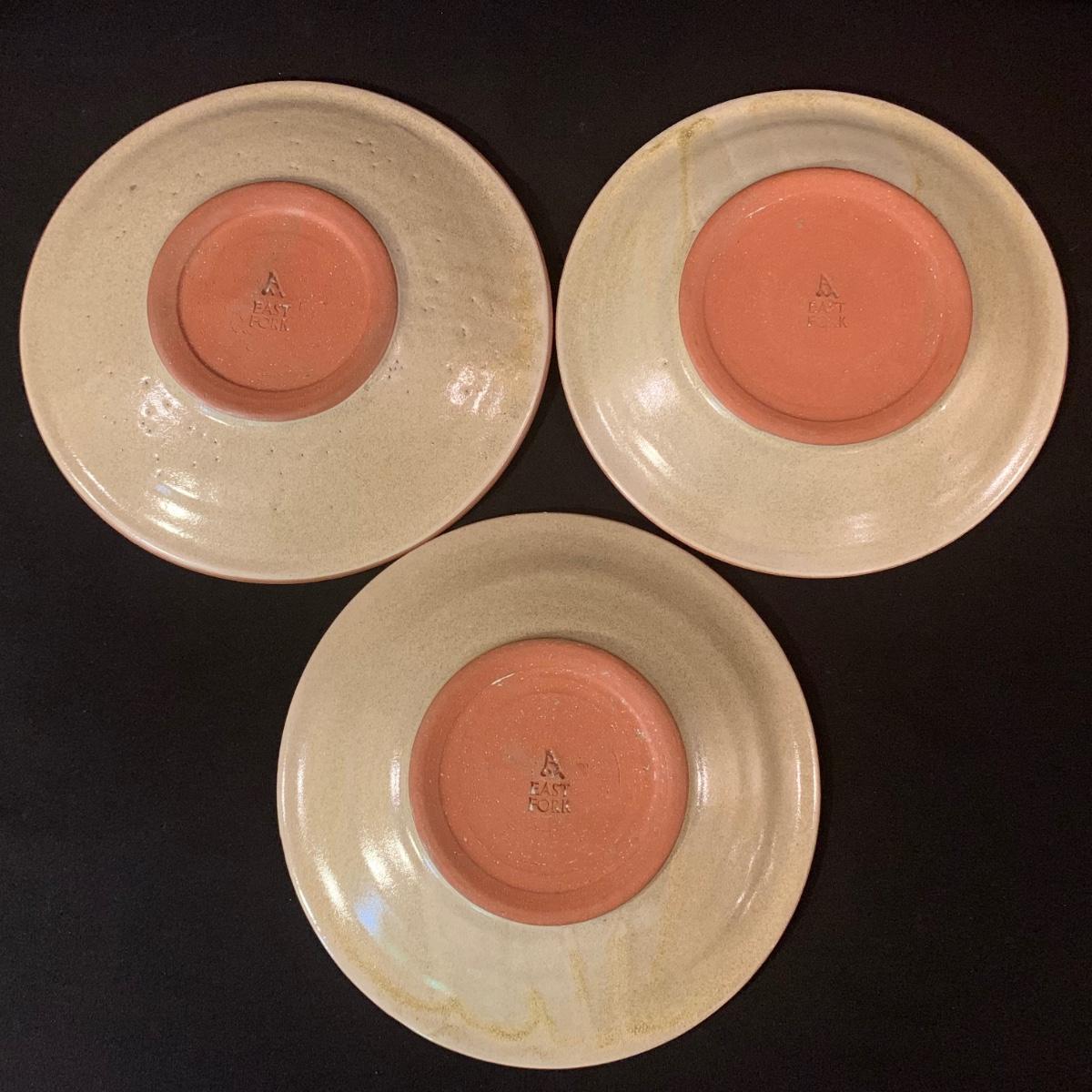 This lot includes original stone colored glazed plates handmade and wood-kiln fired by local potter and founder of East Fork Pottery, Alex Matisse. Lot includes three salad plates and three dinner plates. Each piece is unique and stamped, “A East Fork," the personal stamp of Alex Matisse used circa 2011-2014.