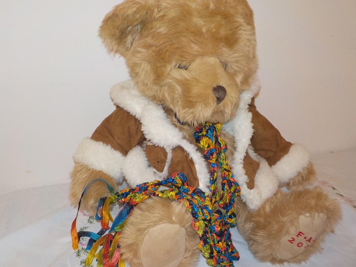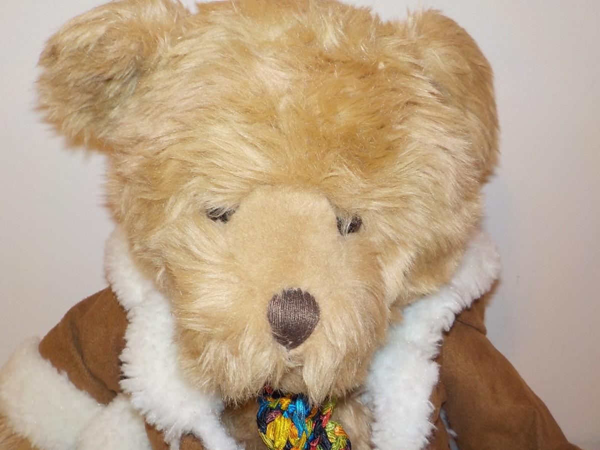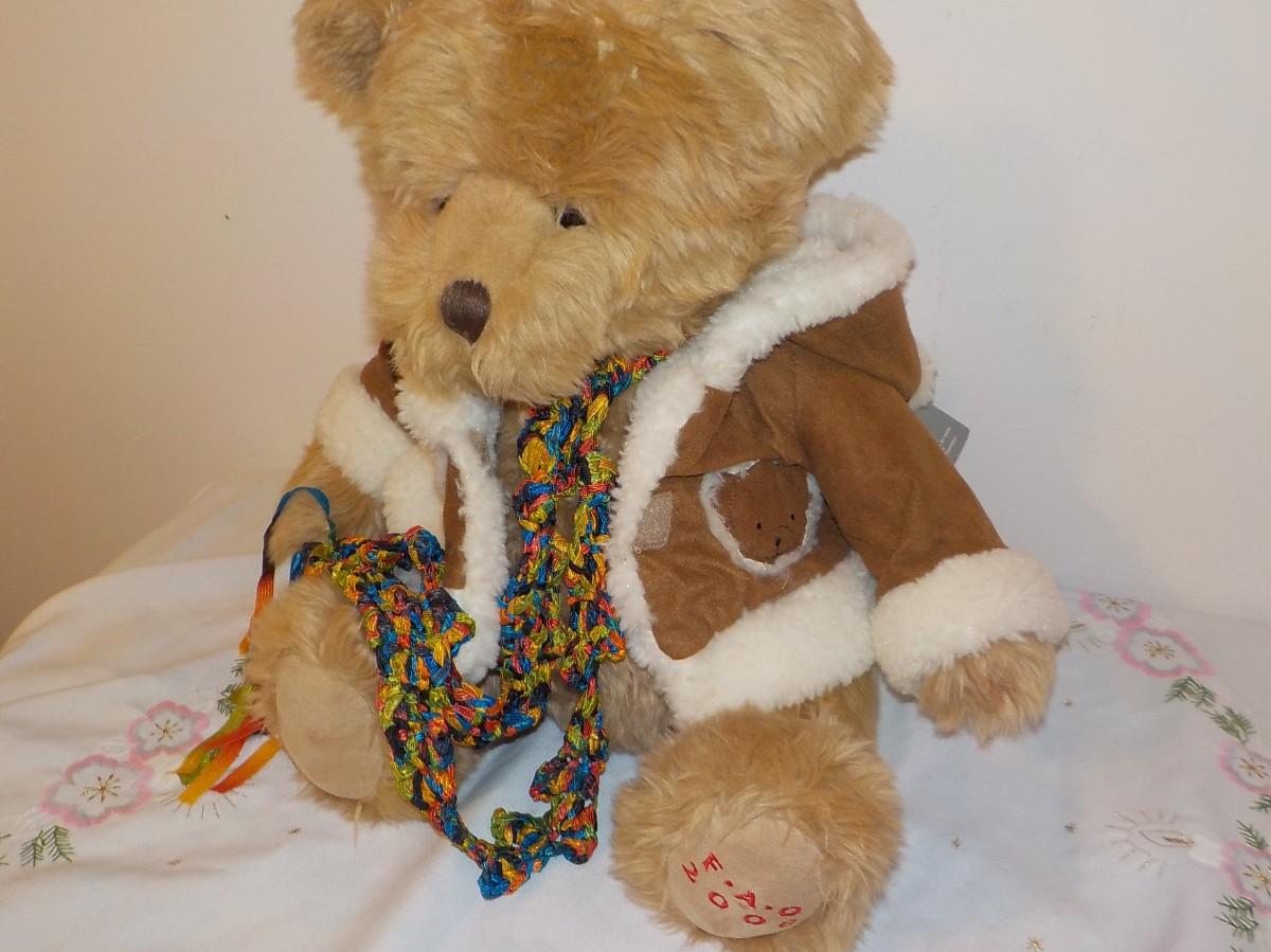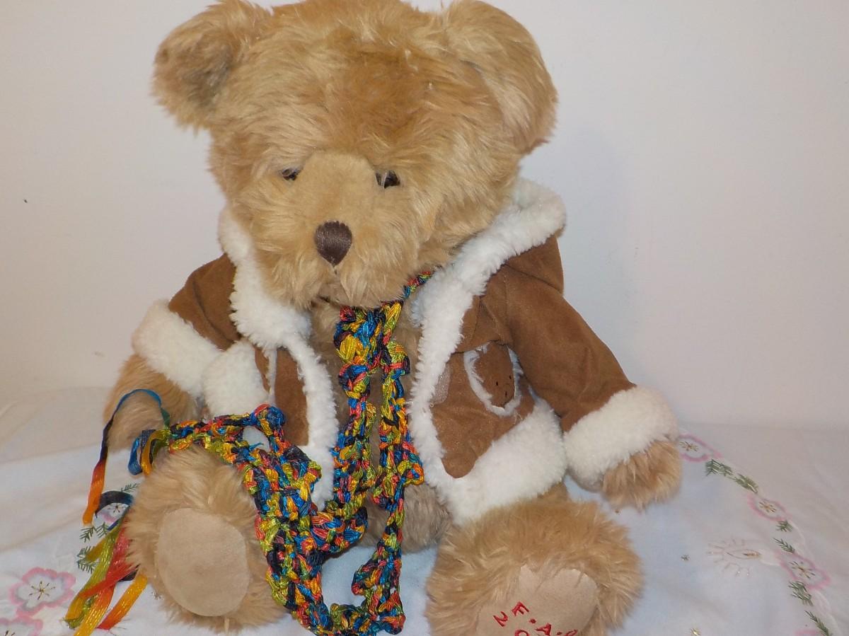 This beauitful Teddy Bear is 23 inches long and more than super soft. jacket is real leather.