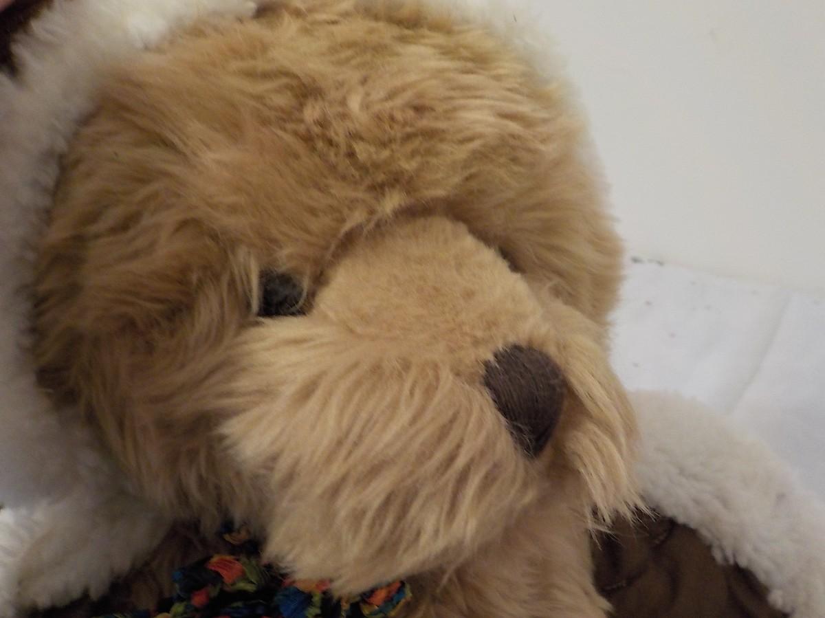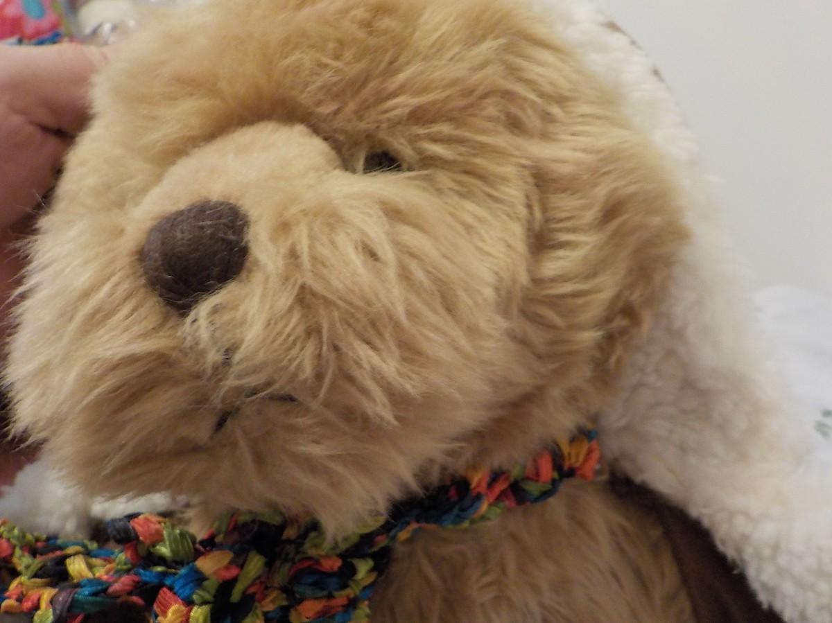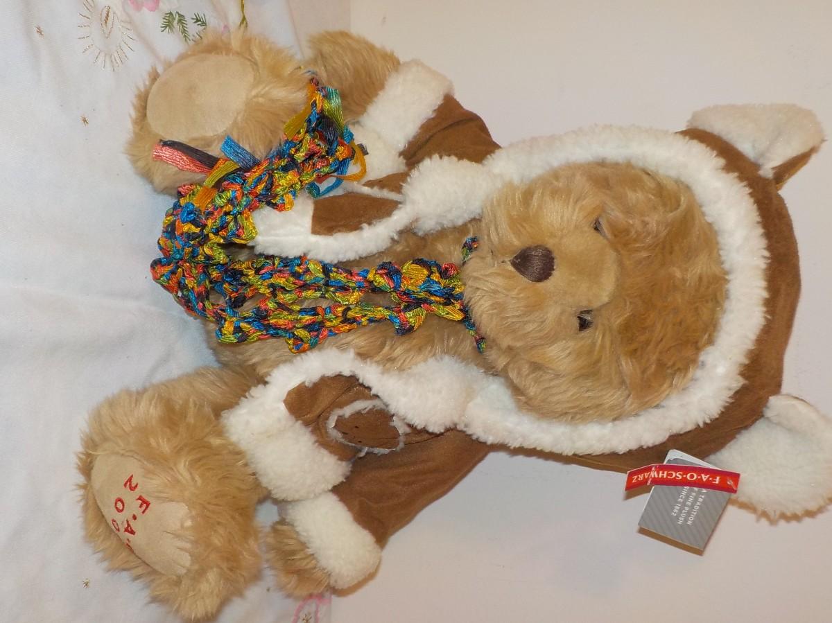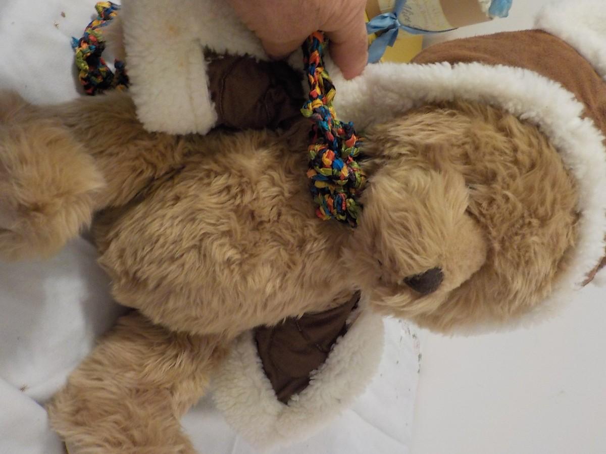 This beauitful Teddy Bear is 23 inches long and more than super soft. jacket is real leather.