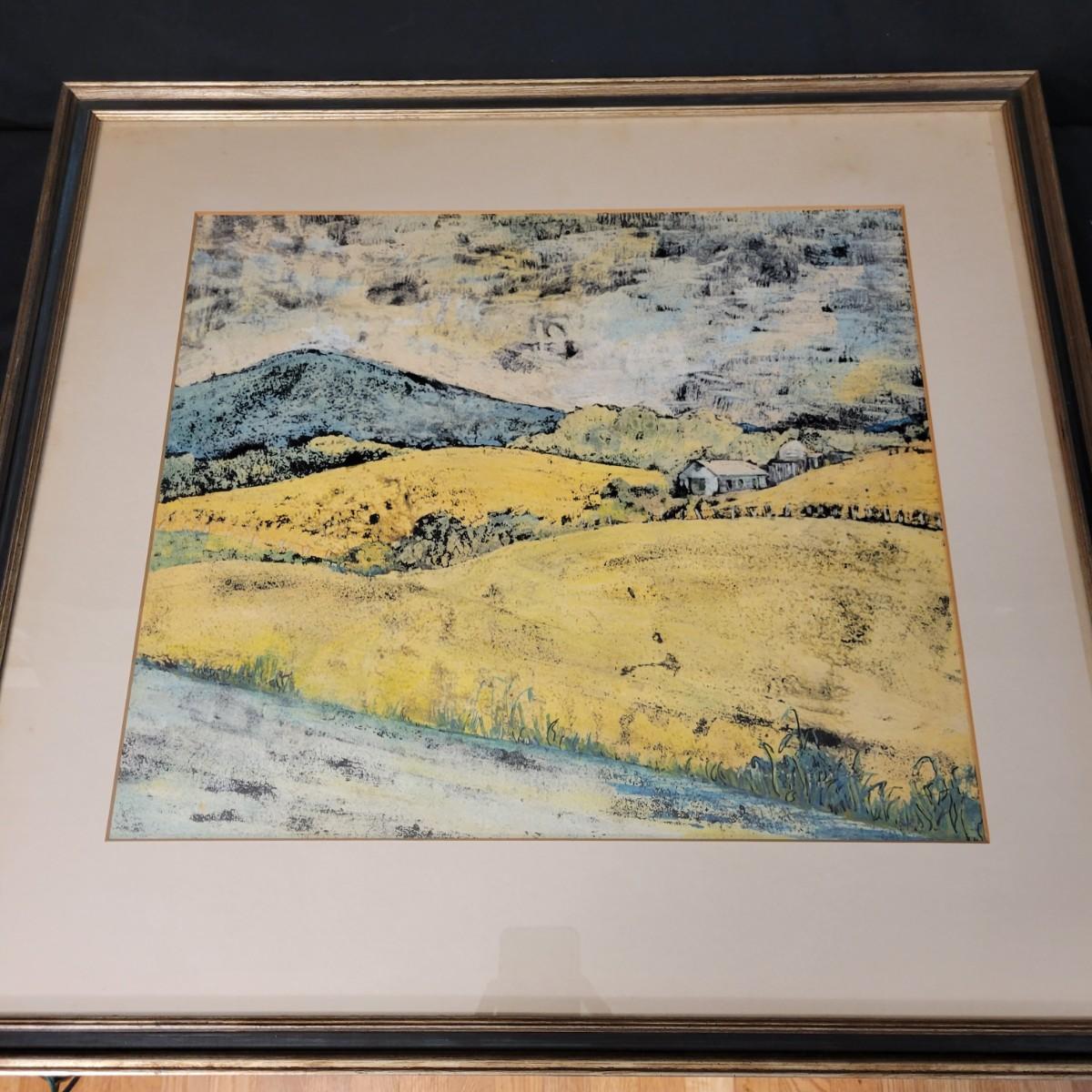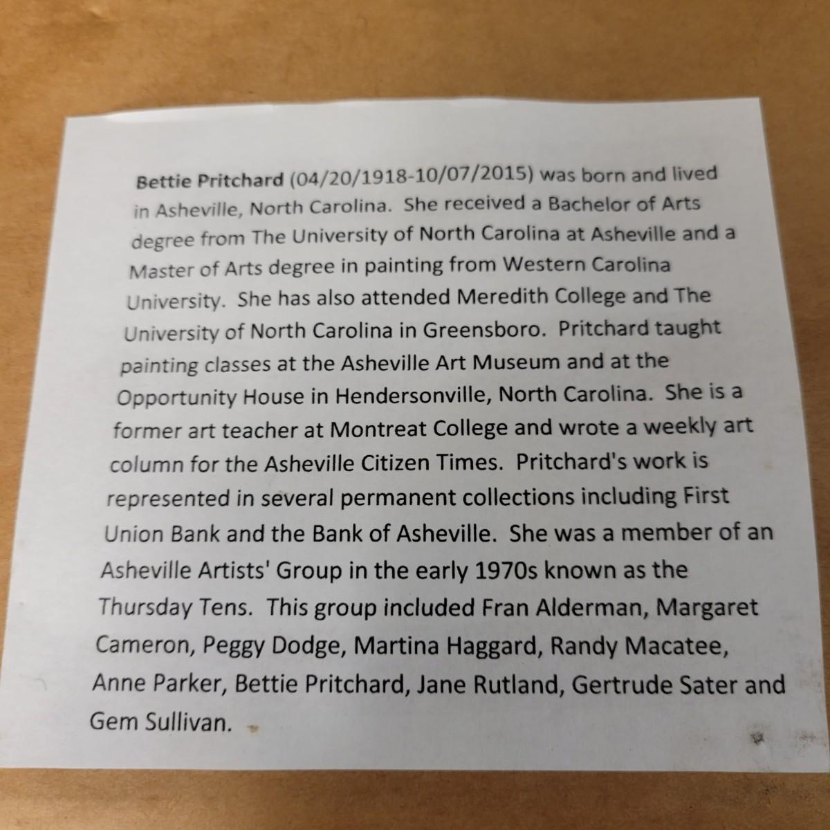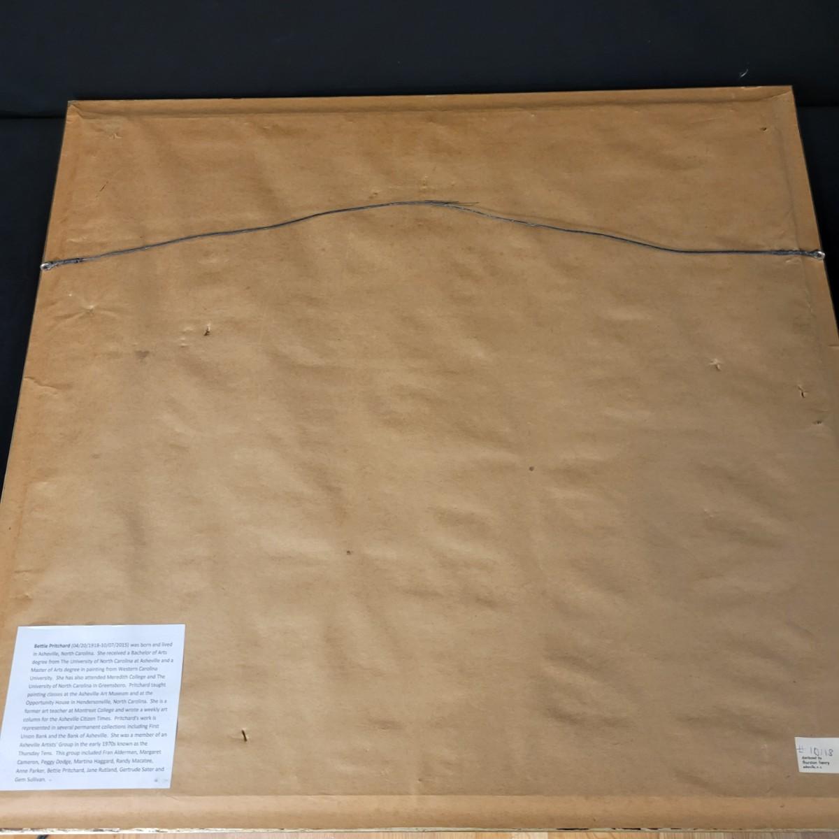 An original watercolor by local artist Bettie Pritchard in excellent condition. This piece is custom framed in a wooden, black and silver frame and a white mat. This piece measures approximately 26" x 24" x 1" Shipping available. Shipping Art can be costly please call UPS store at 828-252-6930 for quote