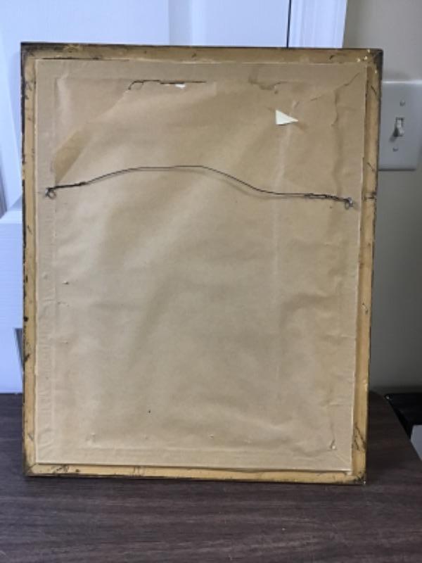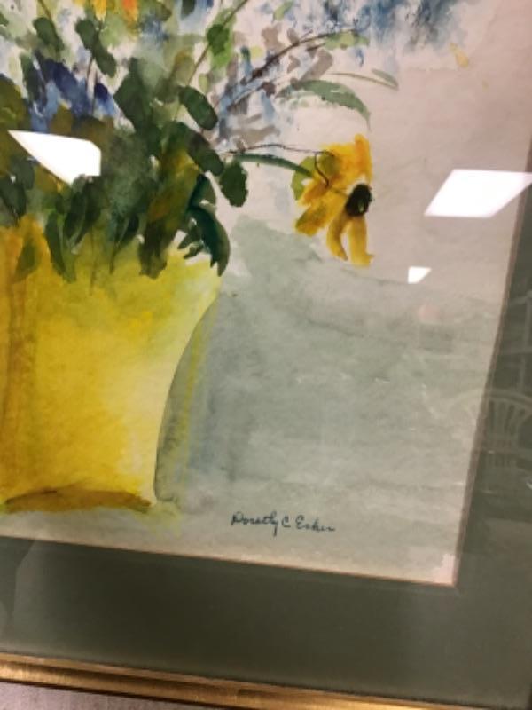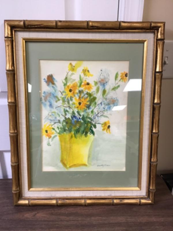 Professionally framed. Bamboo style gold frame with linen surround. Glassed watercolor by artist Dorothy C Ecker Frame measures 17.5 x 22 inches