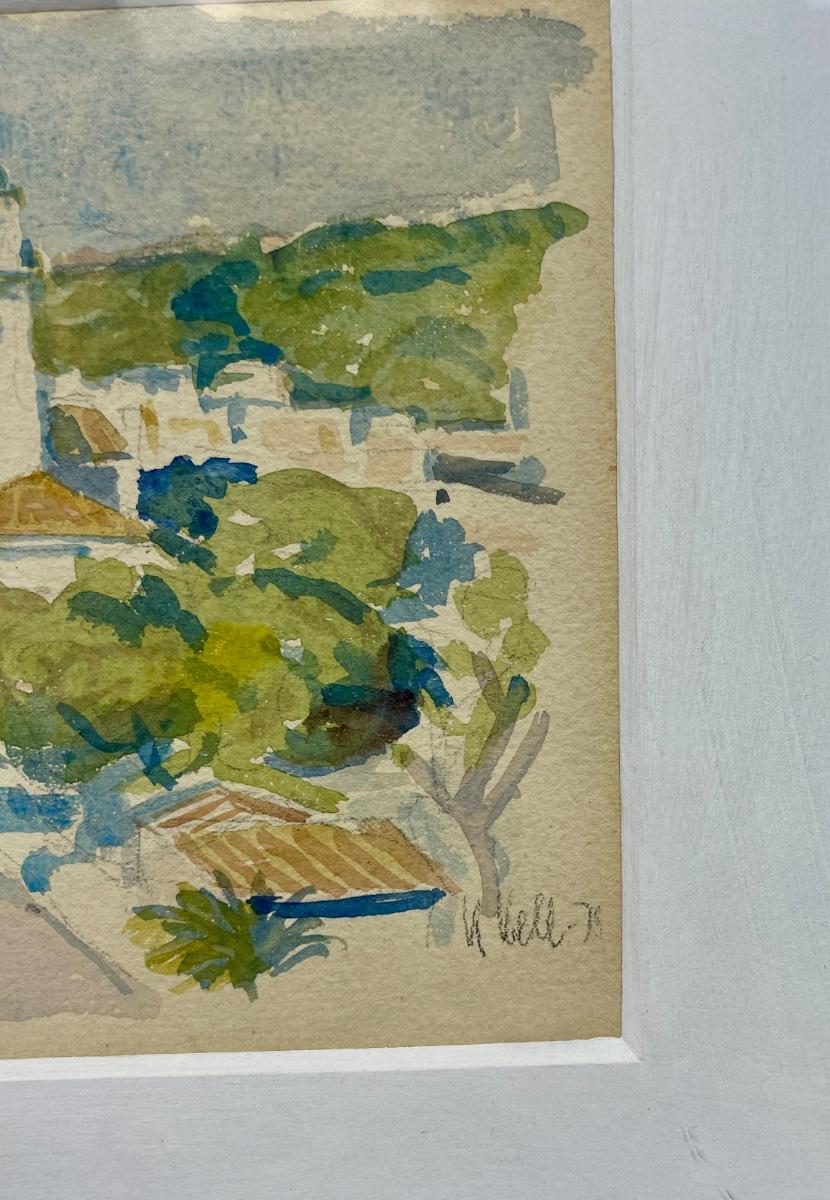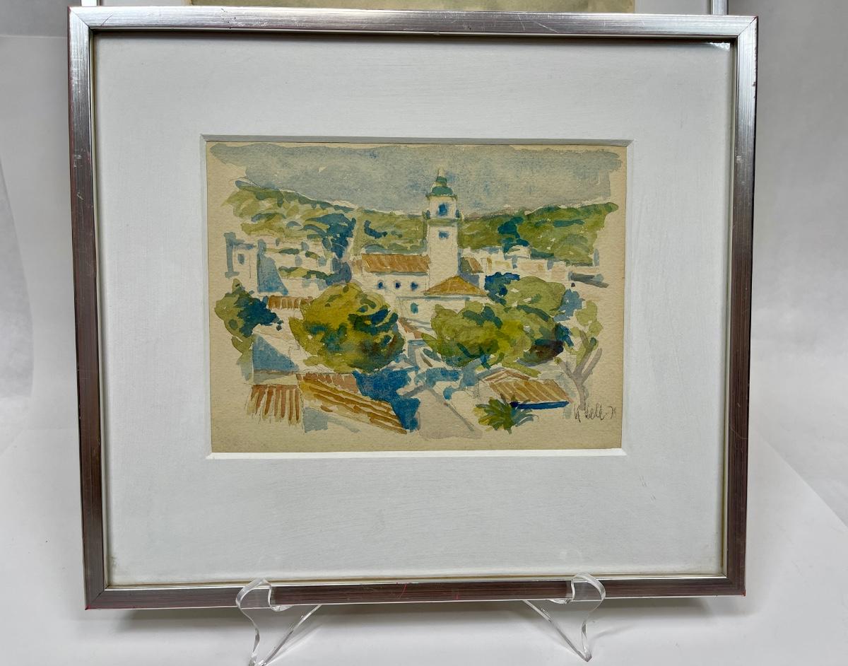 Original Watercolor Painting by M. Well Mission or Church amongst seaside town