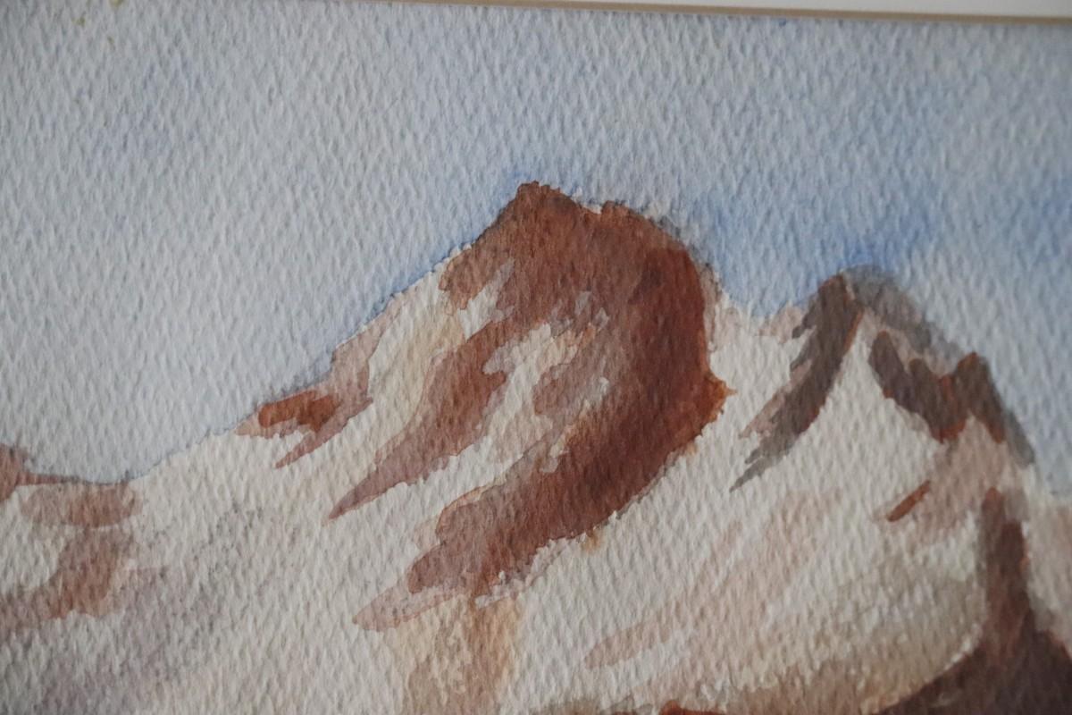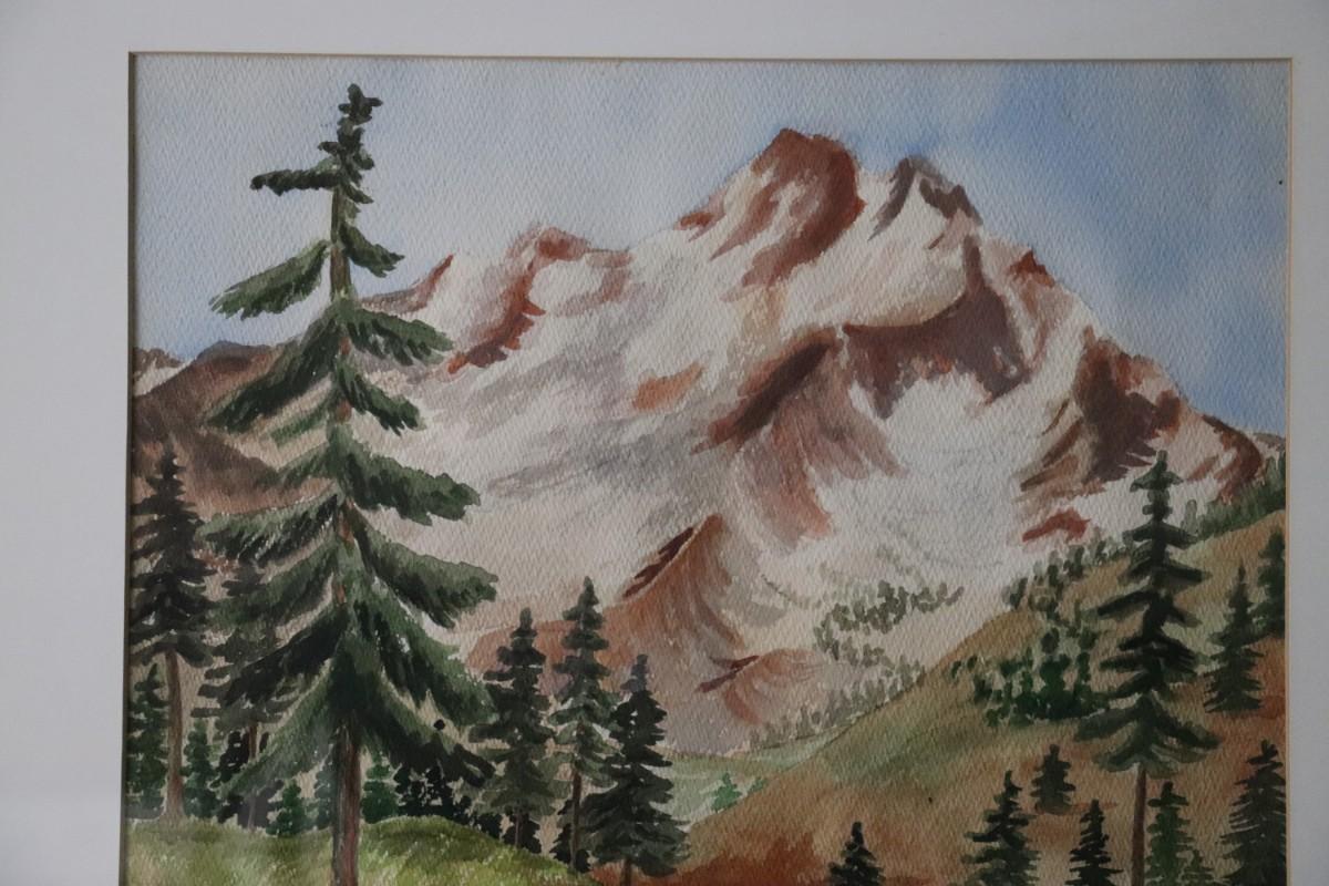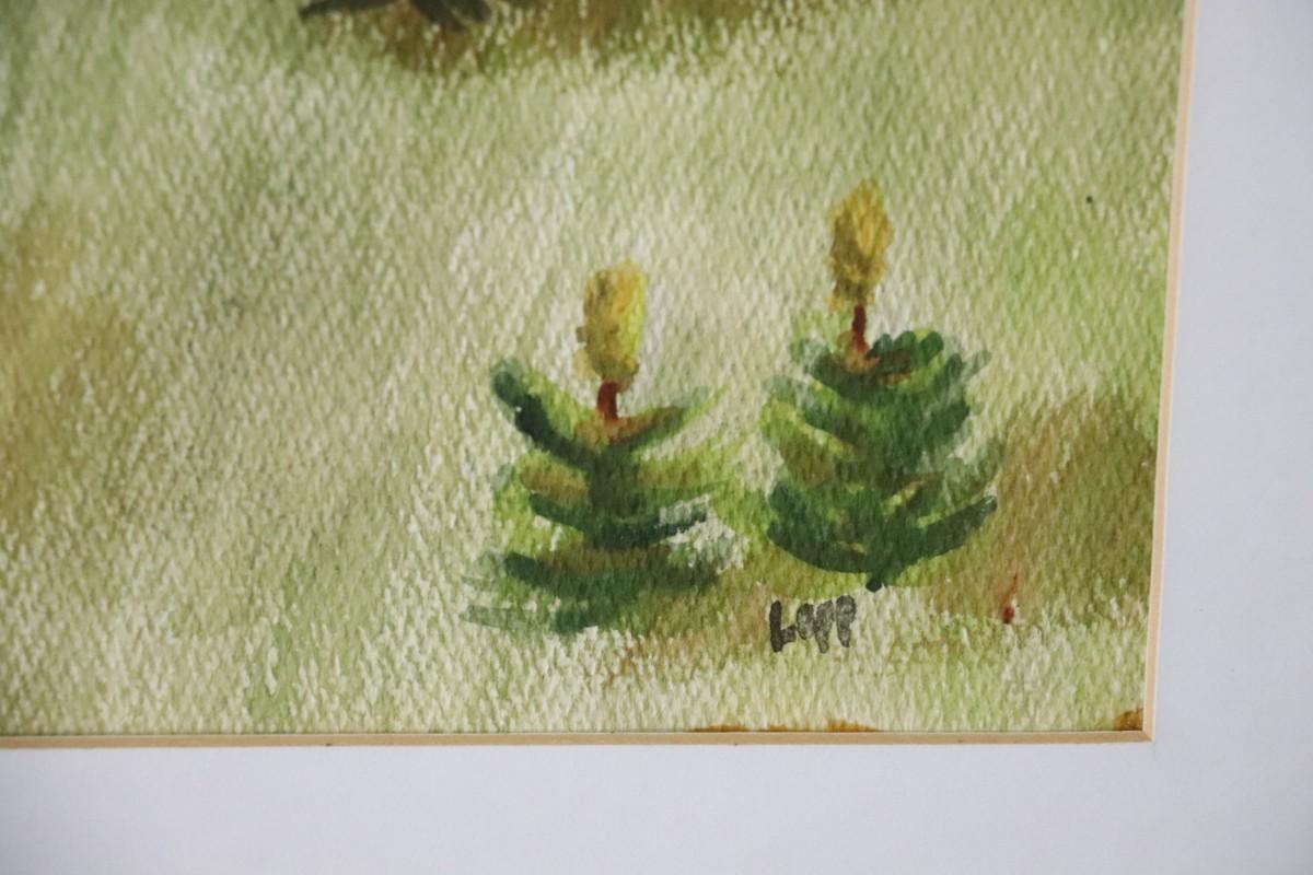 Original Watercolor Painting of Mountain and River Scene Signed by Lopp. From a private estate collection. In good condition, as shown.