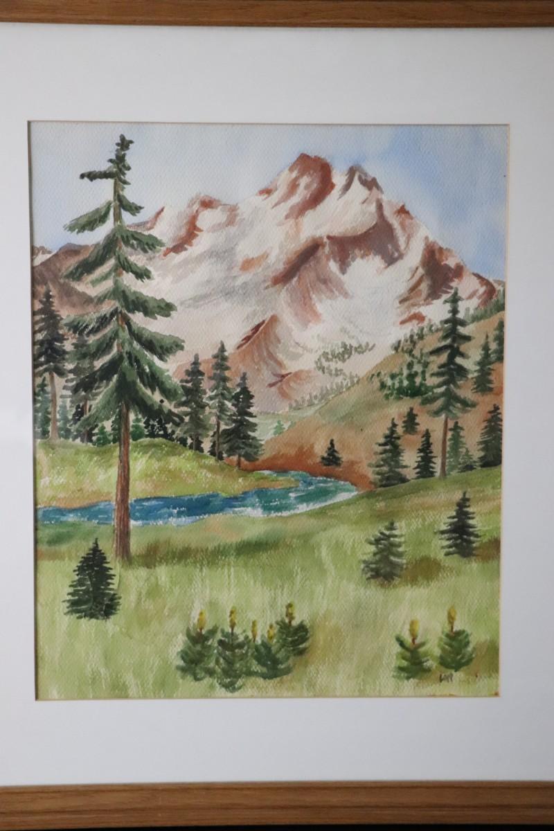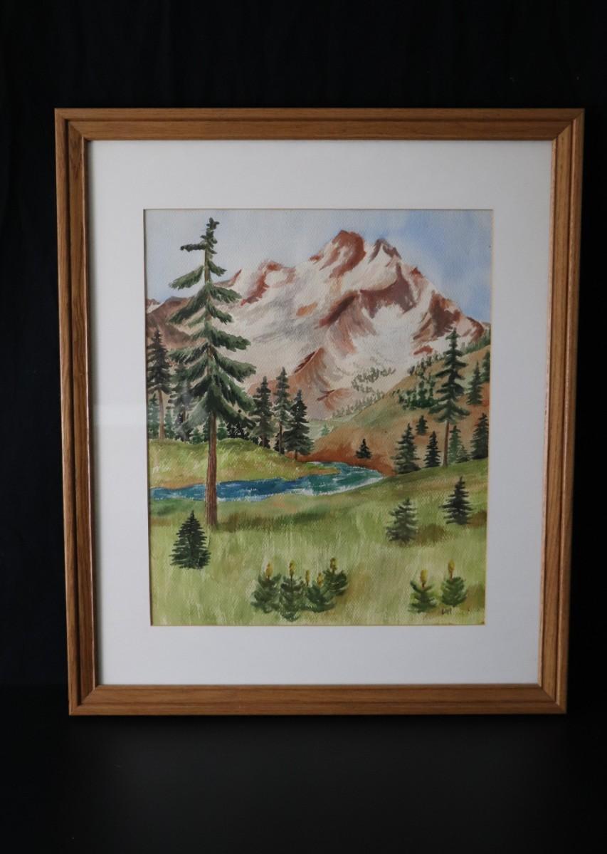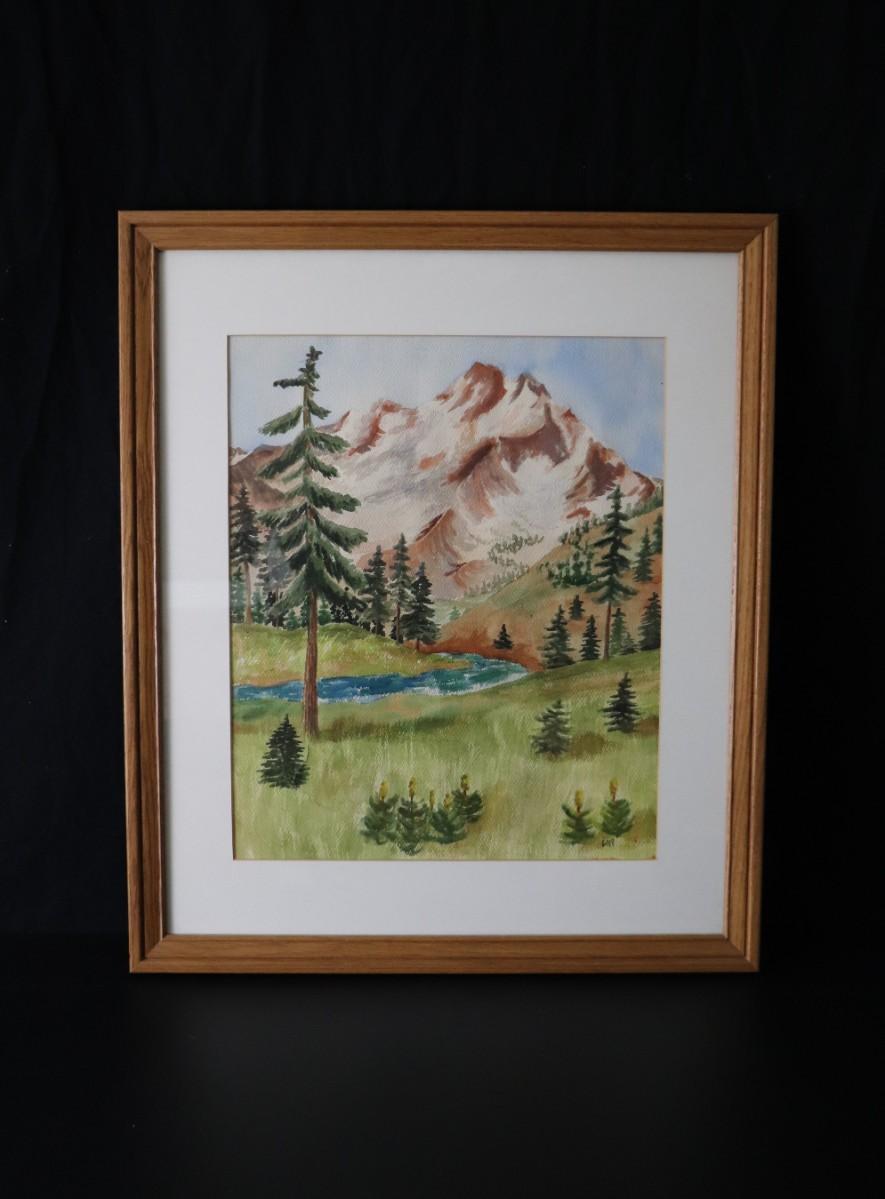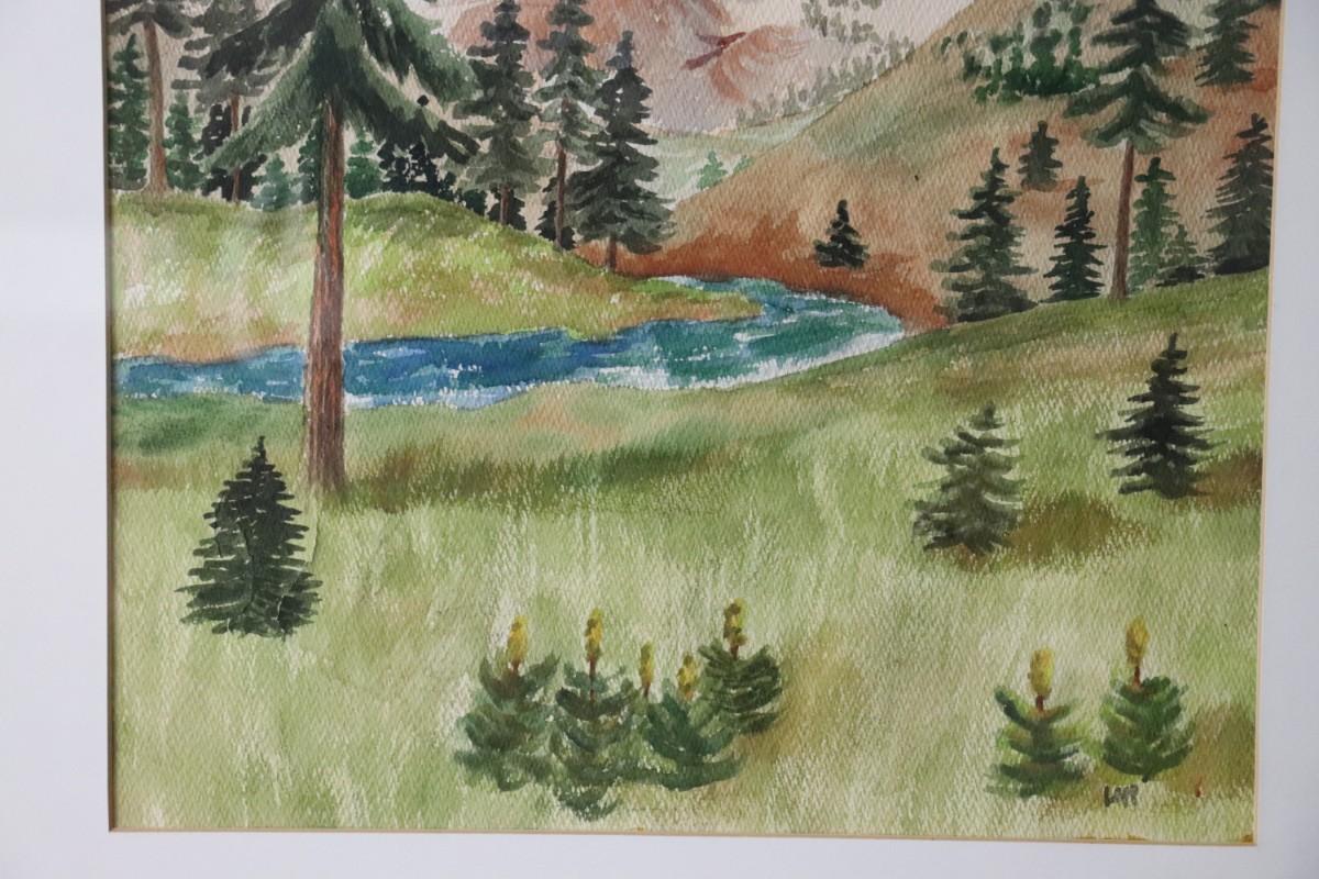 Original Watercolor Painting of Mountain and River Scene Signed by Lopp