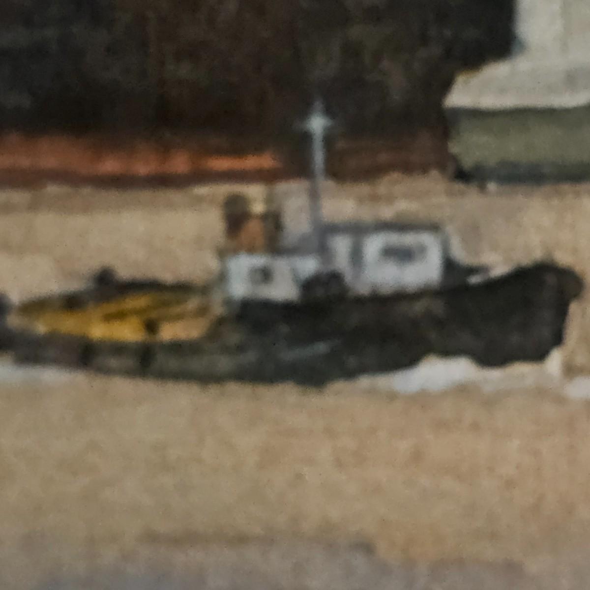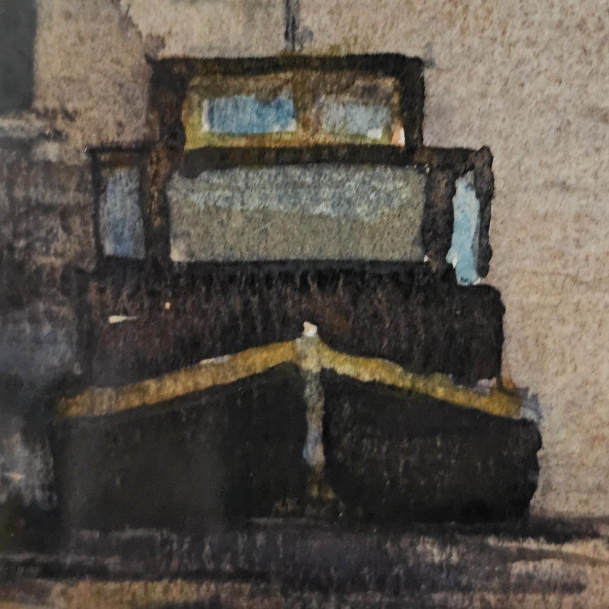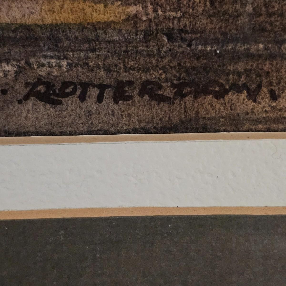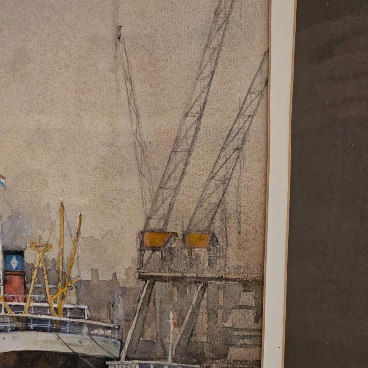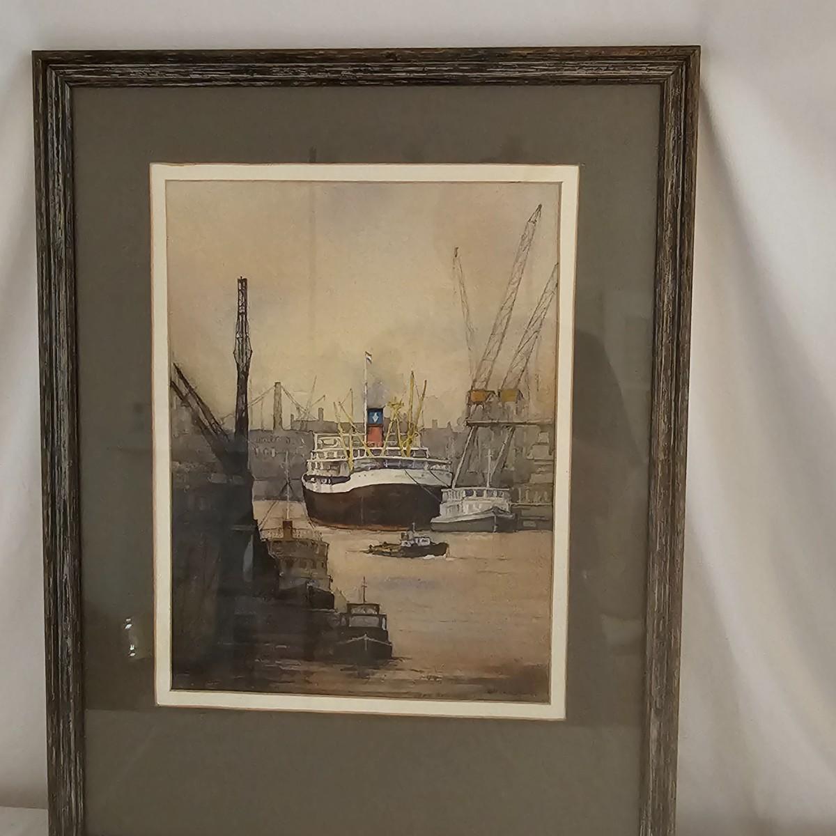 Original watercolor depicting ships in the harbor, possibly Rotterdam by the title. Painted by Jack Skinner, this framed art measures 19.5" x 25.5"H, is wood frame under glass. See photos for details. Shipping available. Shipping can be costly. We suggest contacting our preferred local shipping provider, Postage Express, with dimensions and getting an estimate before bidding: (828) 255-9250 or shipping@postageexpressnc.com.